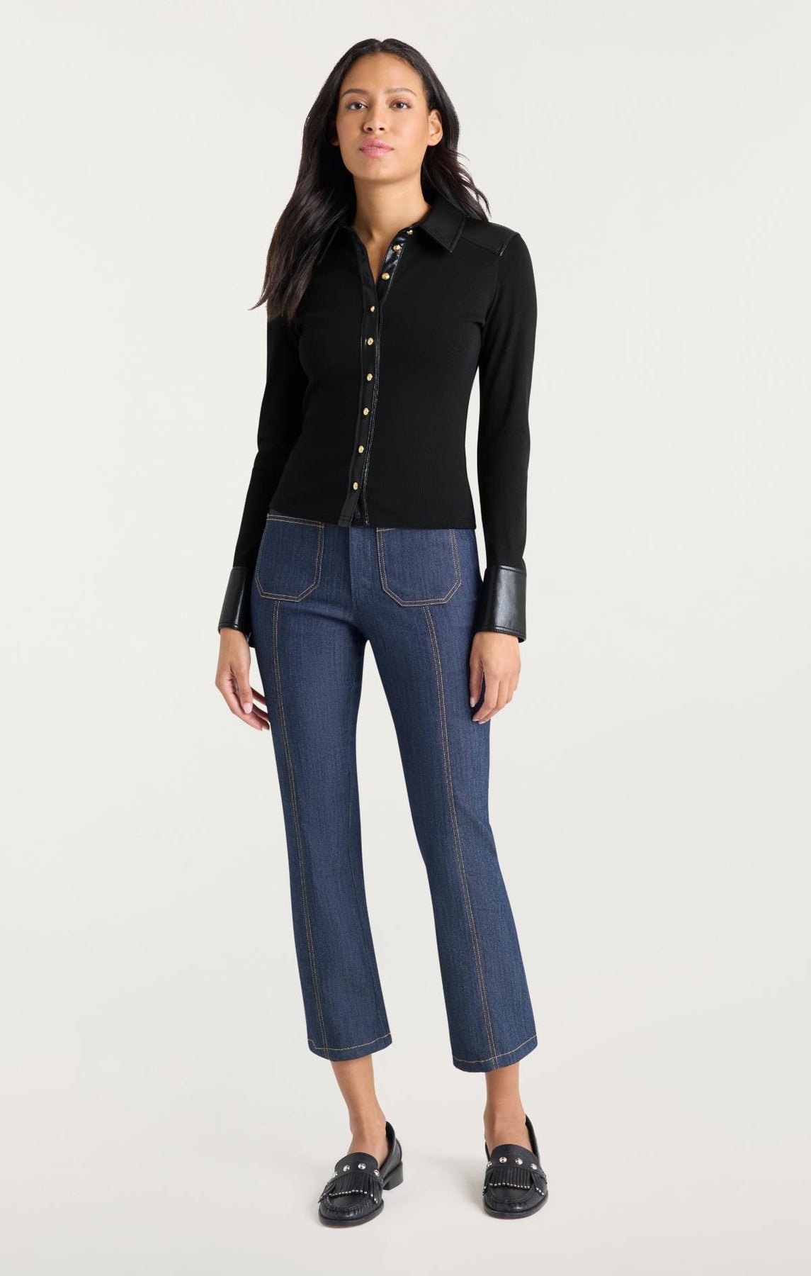 The Magali Top offers a sleek, fitted silhouette with its collared neckline and button-up front. Designed with long sleeves for a polished look, this top effortlessly combines sophistication and style, making it a perfect choice for both professional and chic casual wear.
