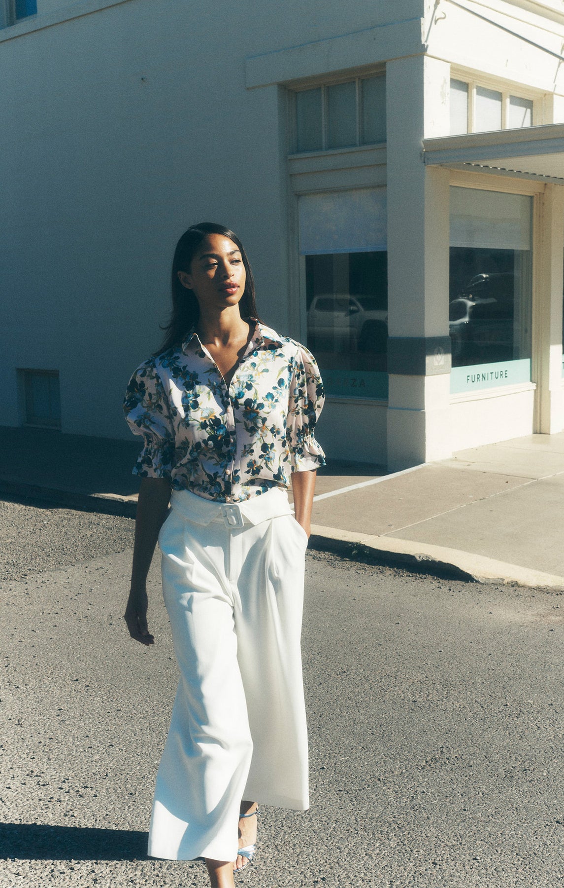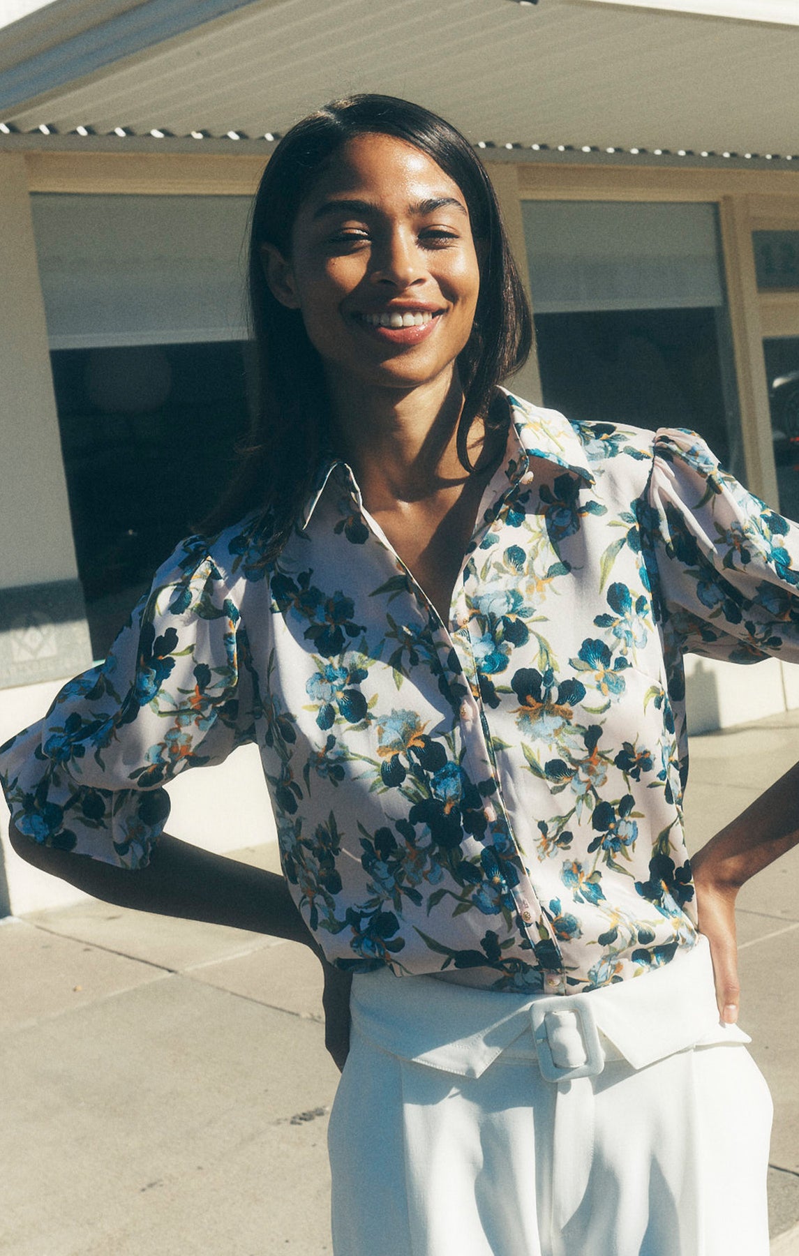 Discover effortless spring style with the Trailing Iris Fiona Top, where botanical florals meet refined tailoring. This seasonal essential showcases a crisp collared neckline and artfully cinched sleeves that frame the silhouette with understated grace.