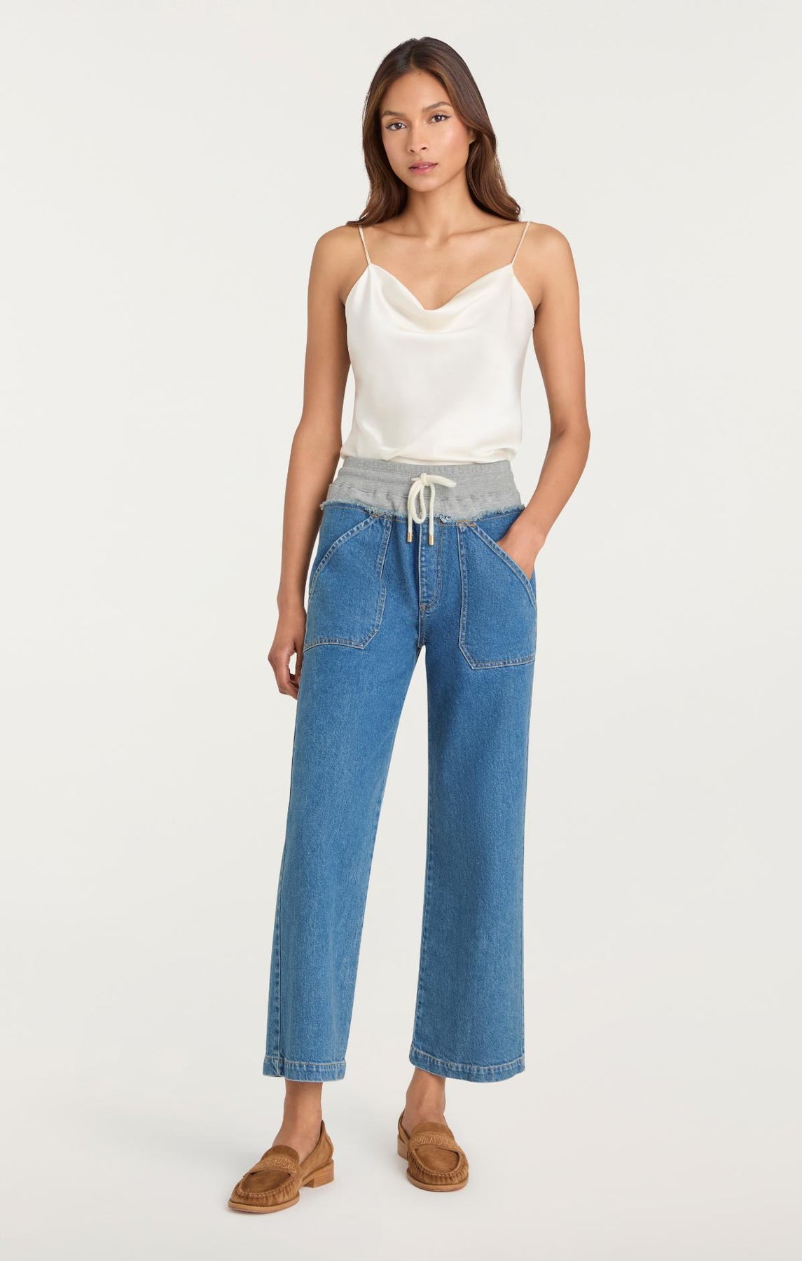 The Serena Pant features a striking material and color contrast at the waistline that anchors the silhouette. With its mid-rise fit and graceful wide-leg cut, this style pairs comfort with contemporary appeal. The tie waist adds an intentional design element while allowing a personalized fit.