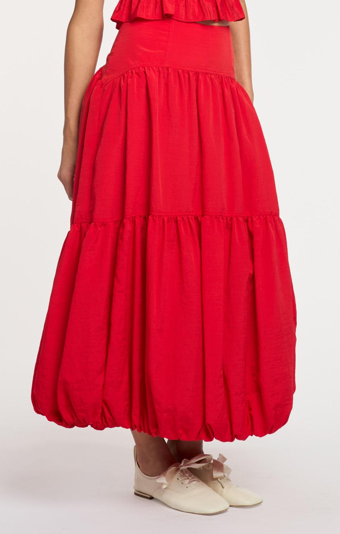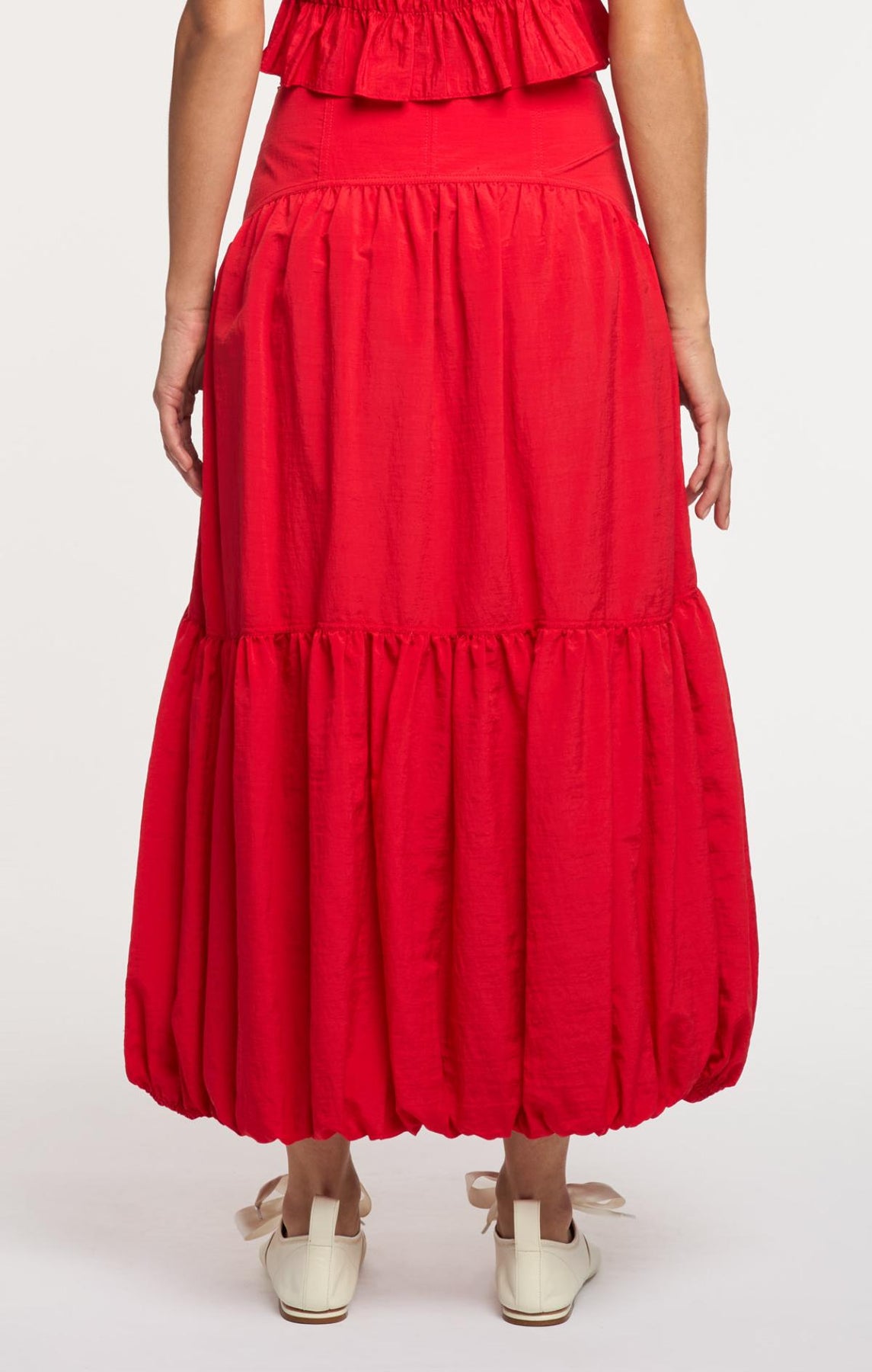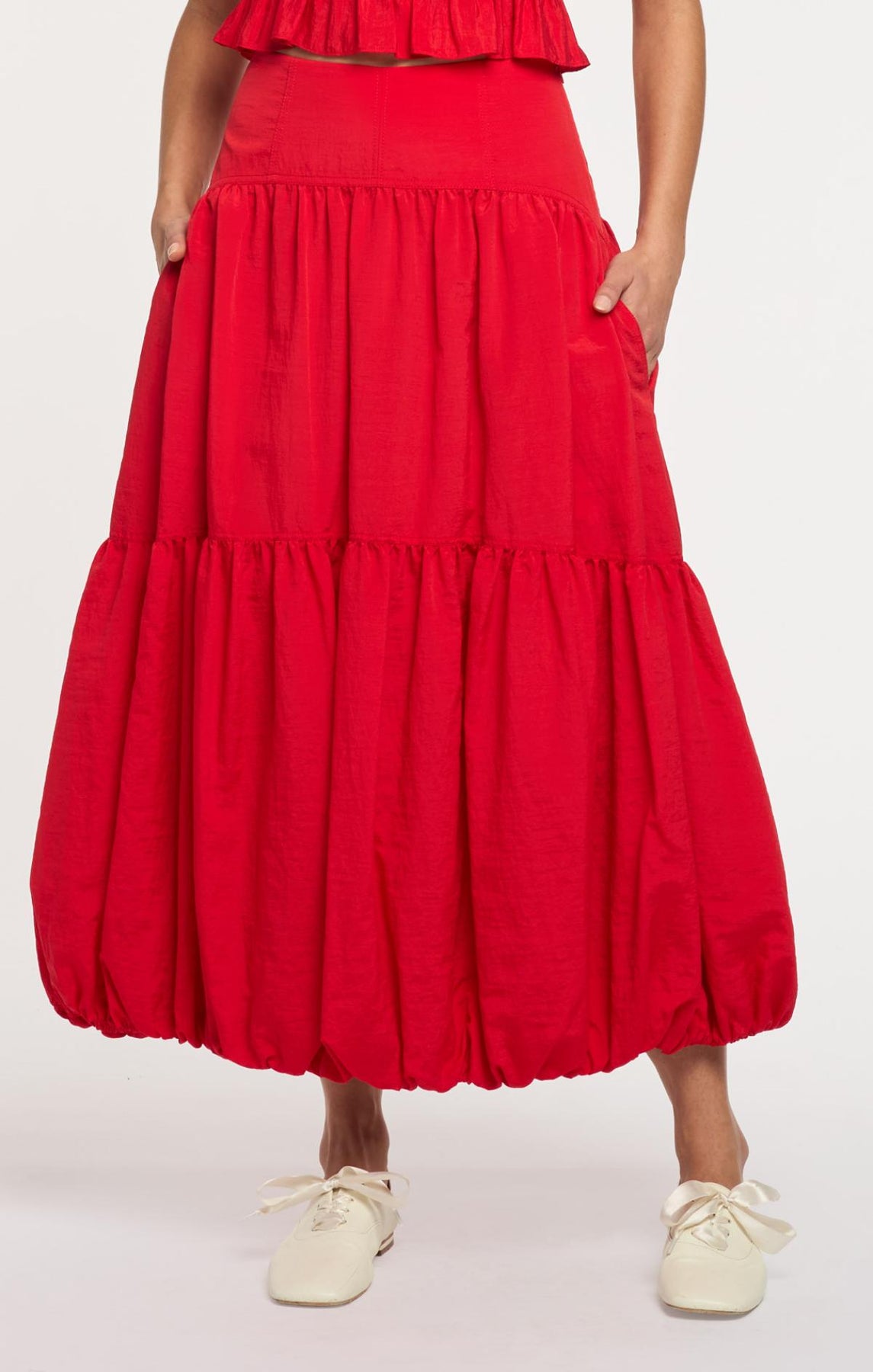 The Blythe Skirt delivers daytime sophistication with its fitted waist and airy midi length. A playful bubble hem adds visual interest, while concealed front pockets provide understated practicality.