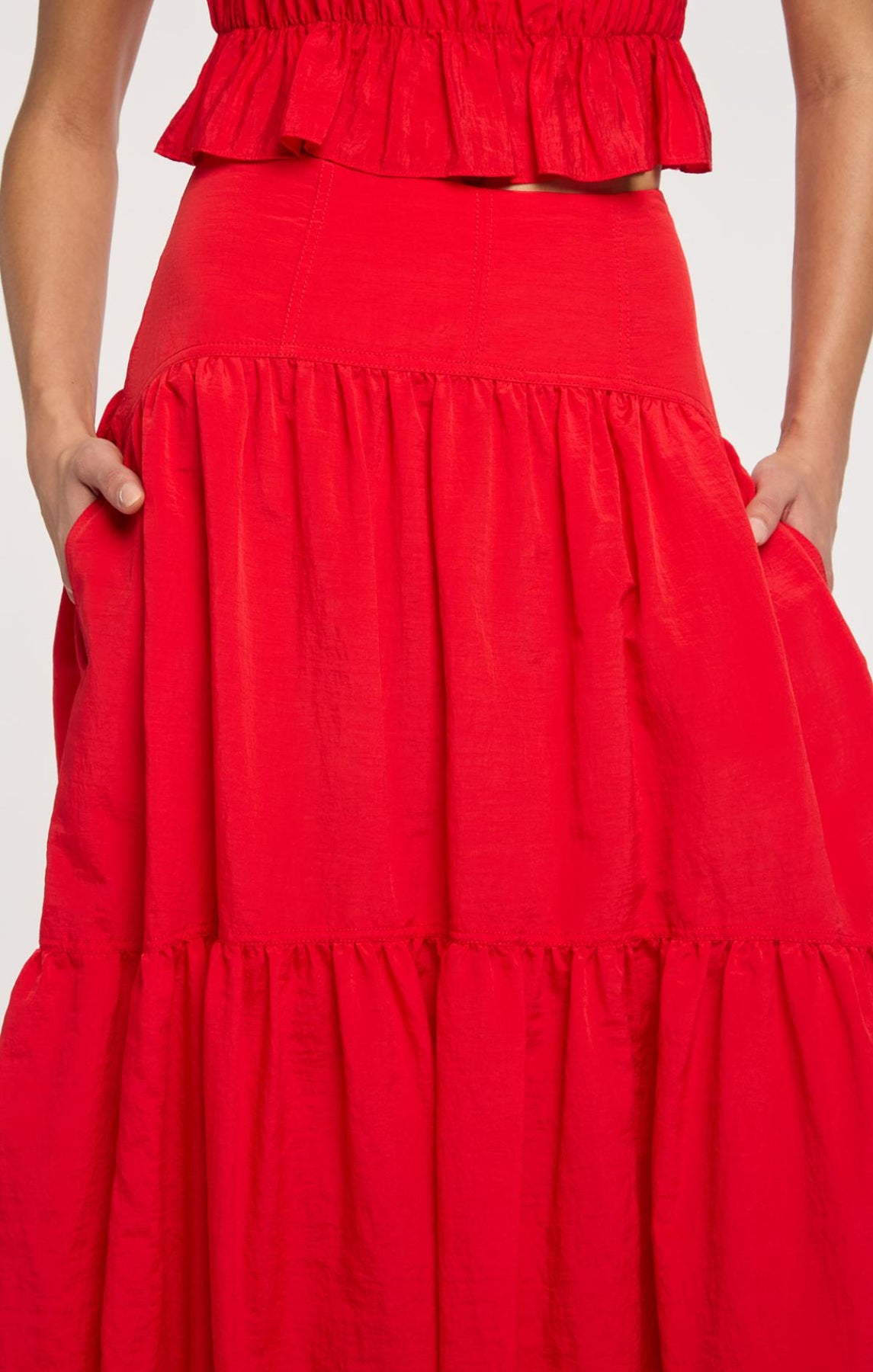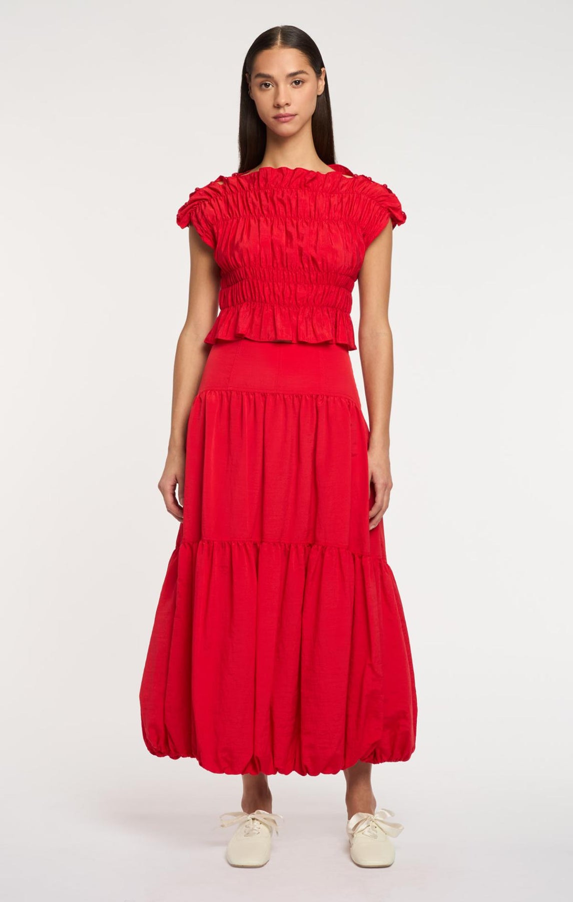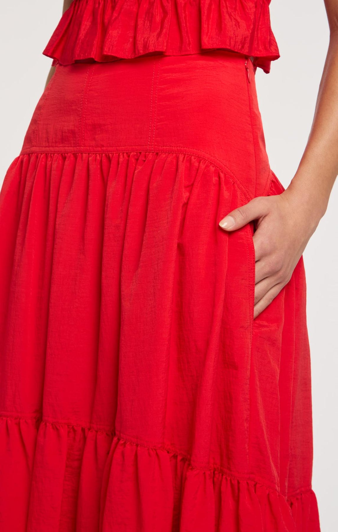The Blythe Skirt delivers daytime sophistication with its fitted waist and airy midi length. A playful bubble hem adds visual interest, while concealed front pockets provide understated practicality.