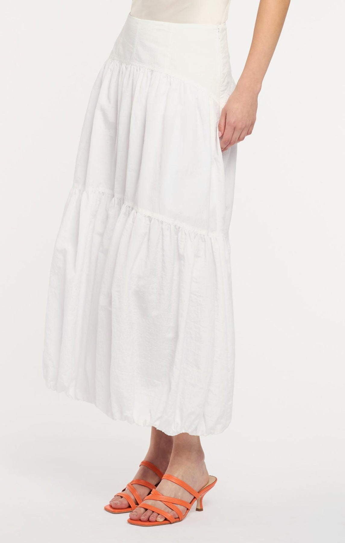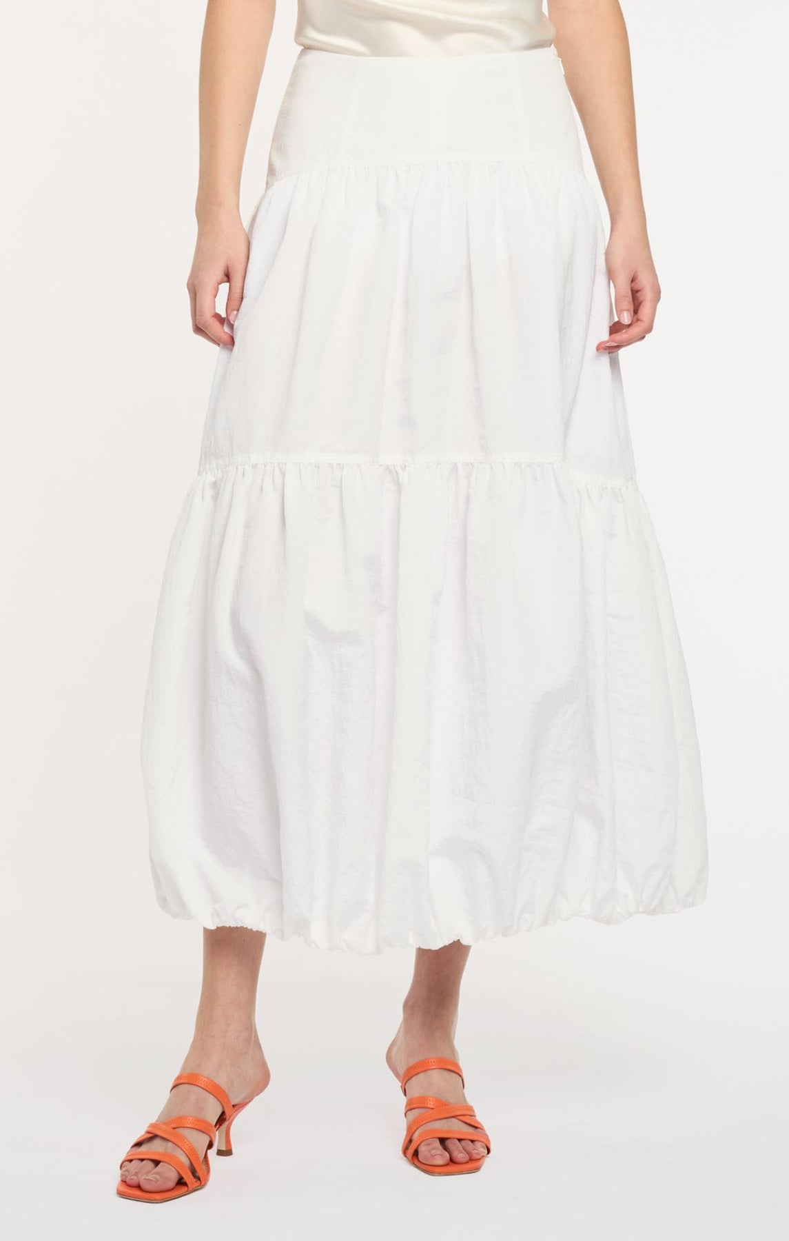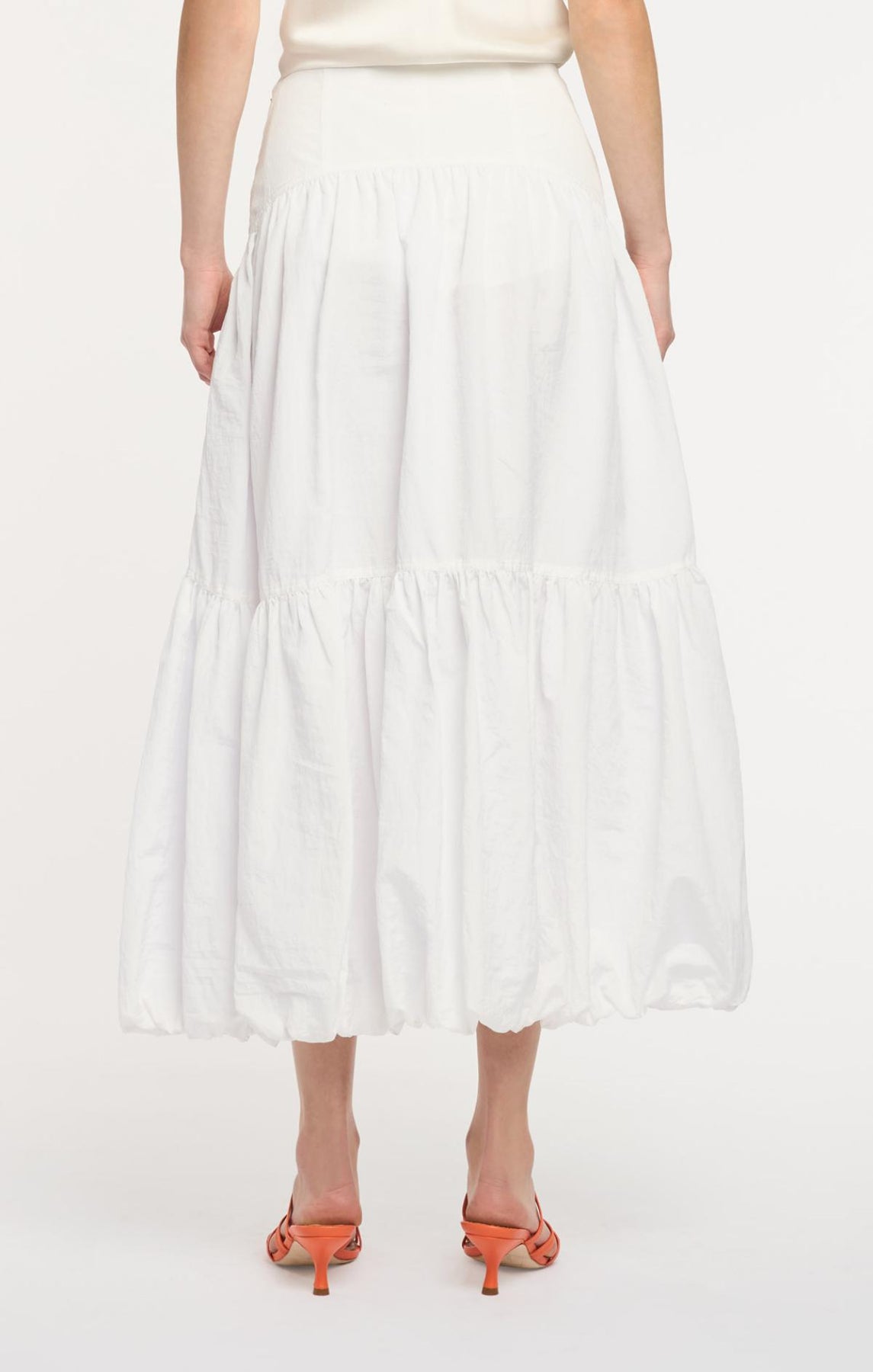 The Blythe Skirt delivers daytime sophistication with its fitted waist and airy midi length. A playful bubble hem adds visual interest, while concealed front pockets provide understated practicality.