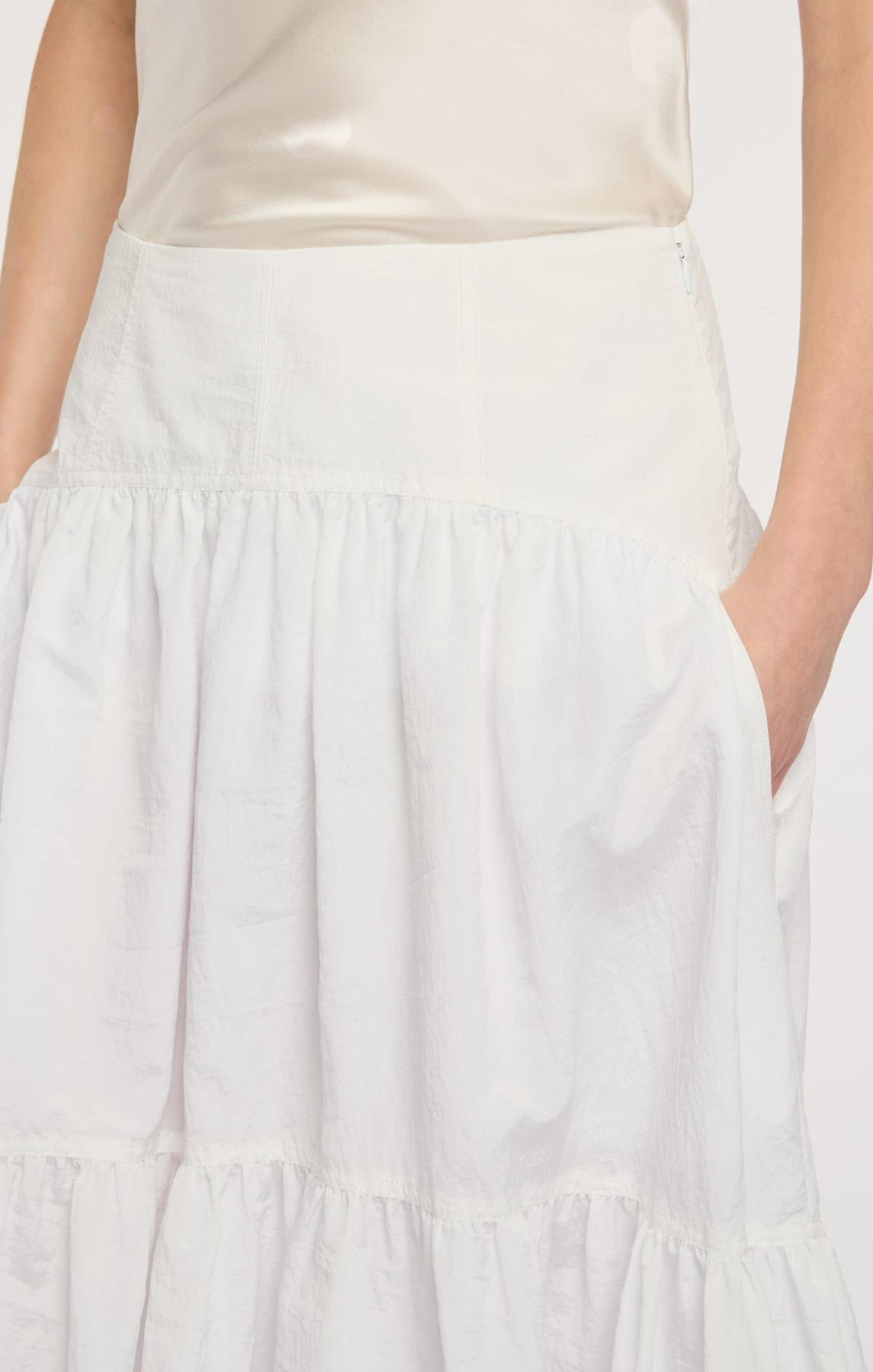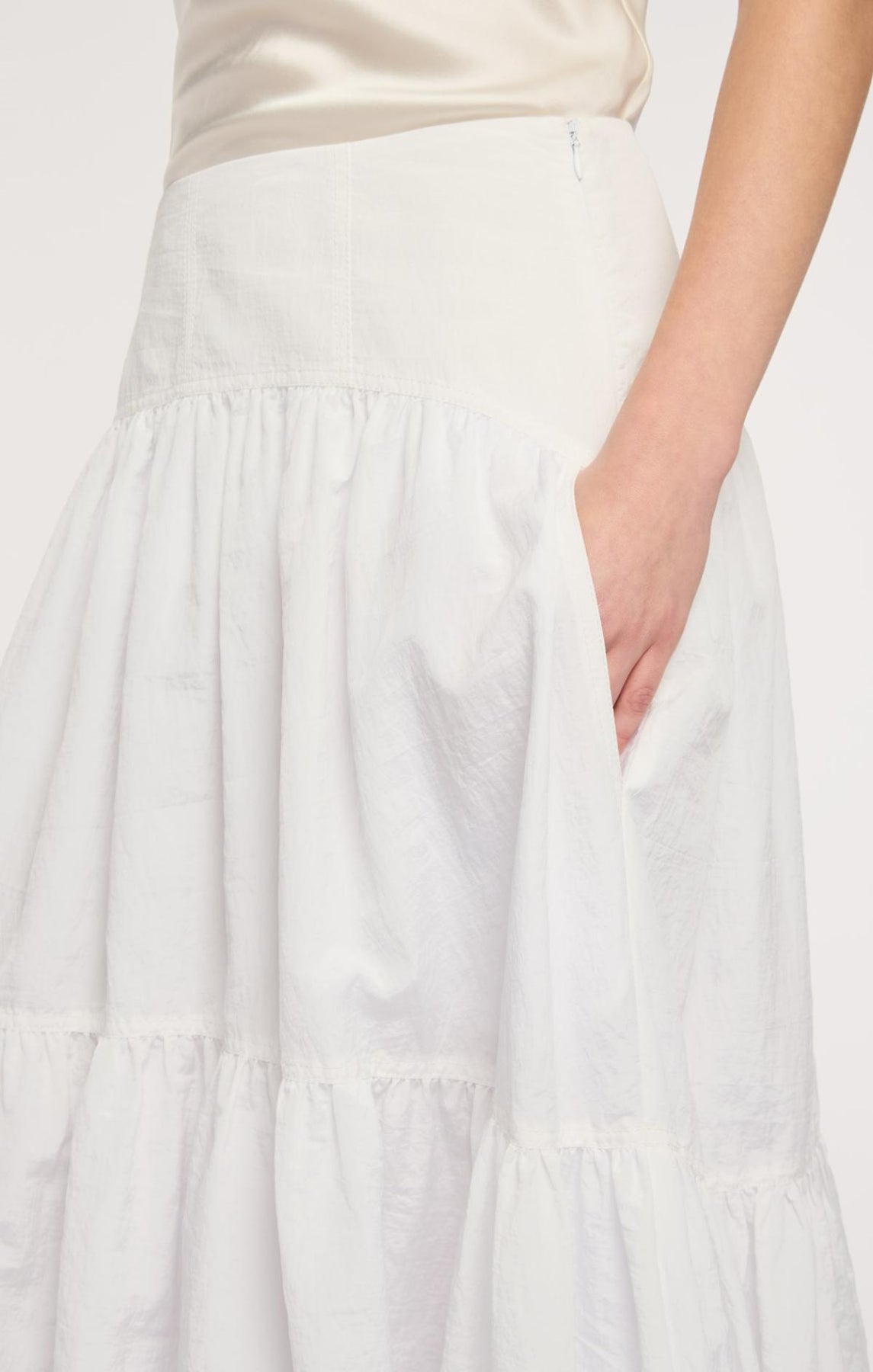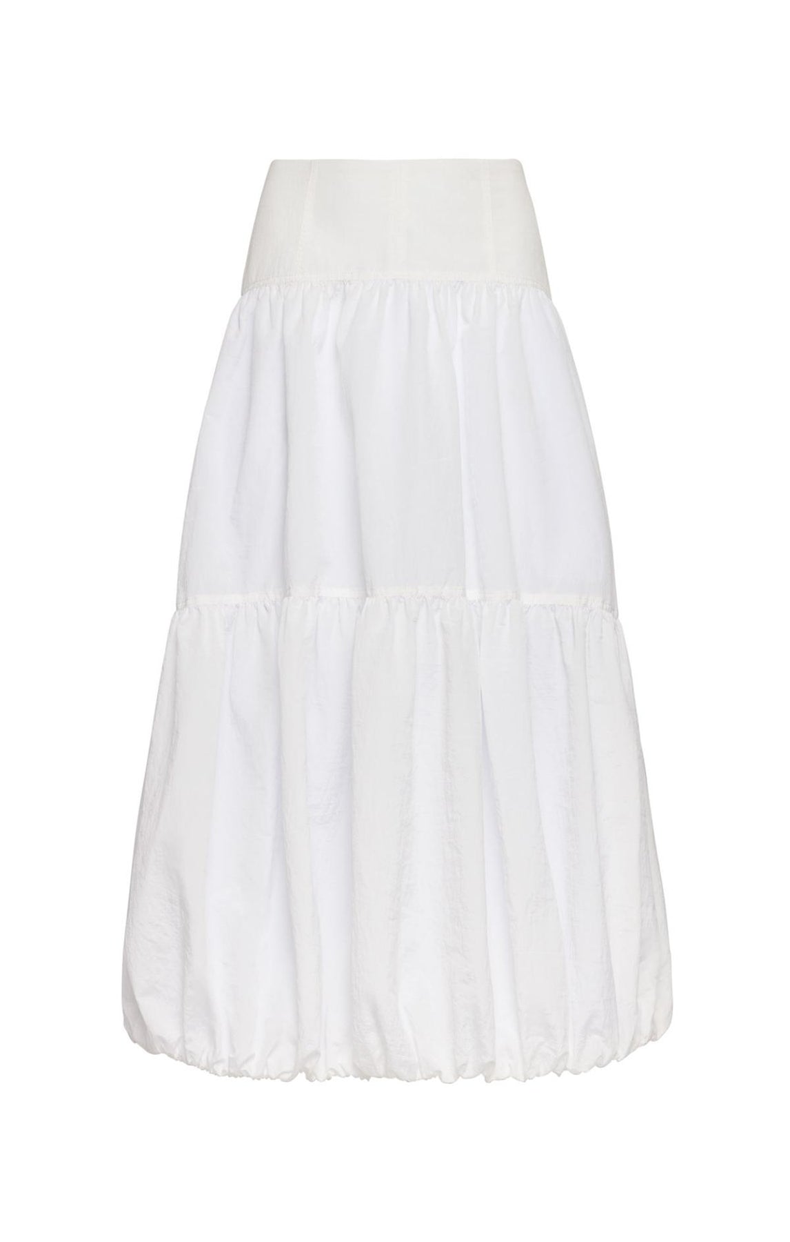 The Blythe Skirt delivers daytime sophistication with its fitted waist and airy midi length. A playful bubble hem adds visual interest, while concealed front pockets provide understated practicality.