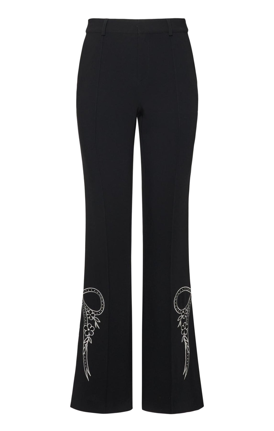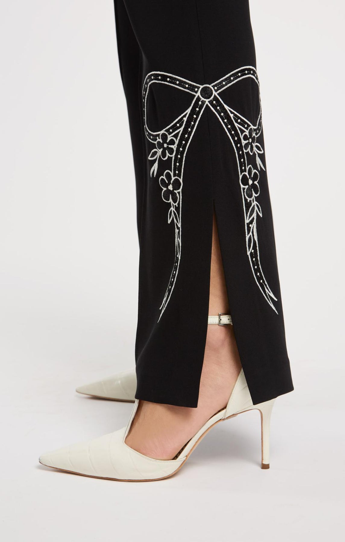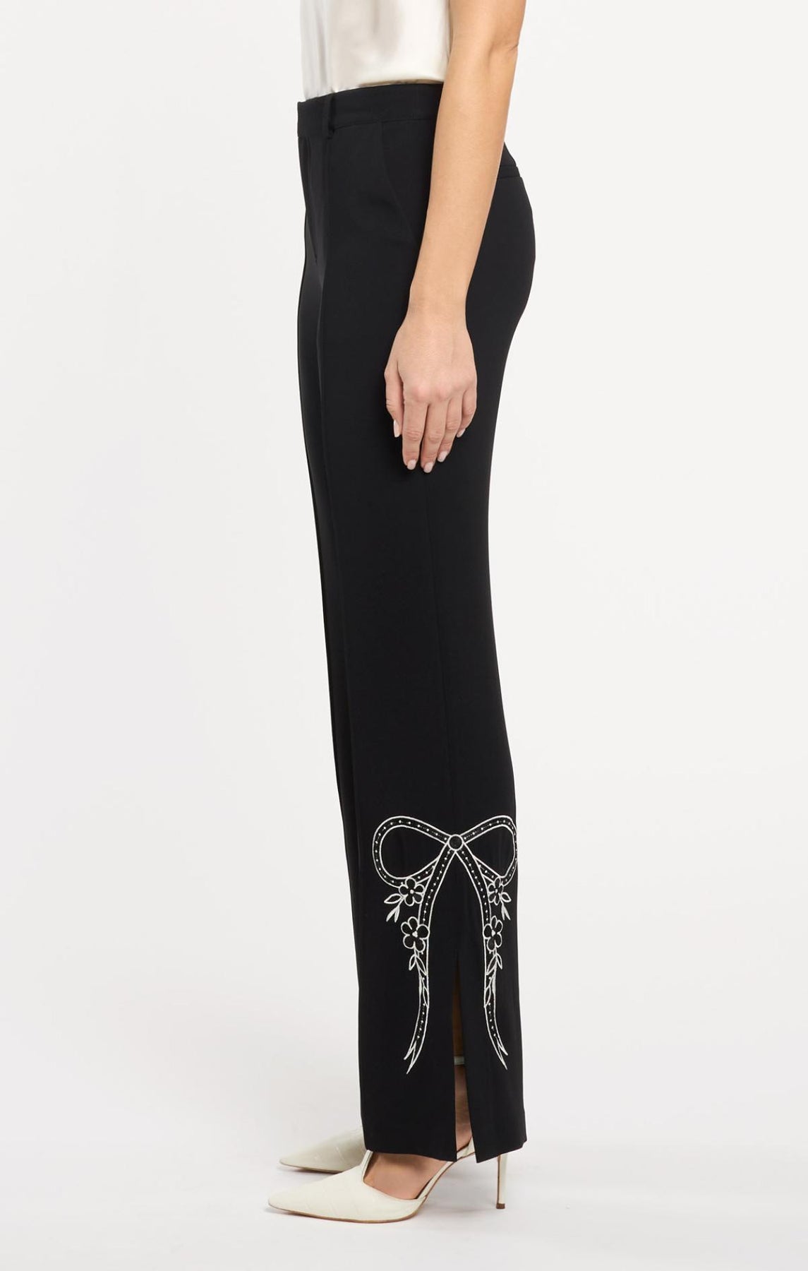Embrace timeless elegance with the Cascading Ribbon Abeline Pant. This high-waisted flare features exquisite bow stitching along the side hems and a subtle side slit for effortless movement. A sophisticated staple that transitions seamlessly from office to evening.