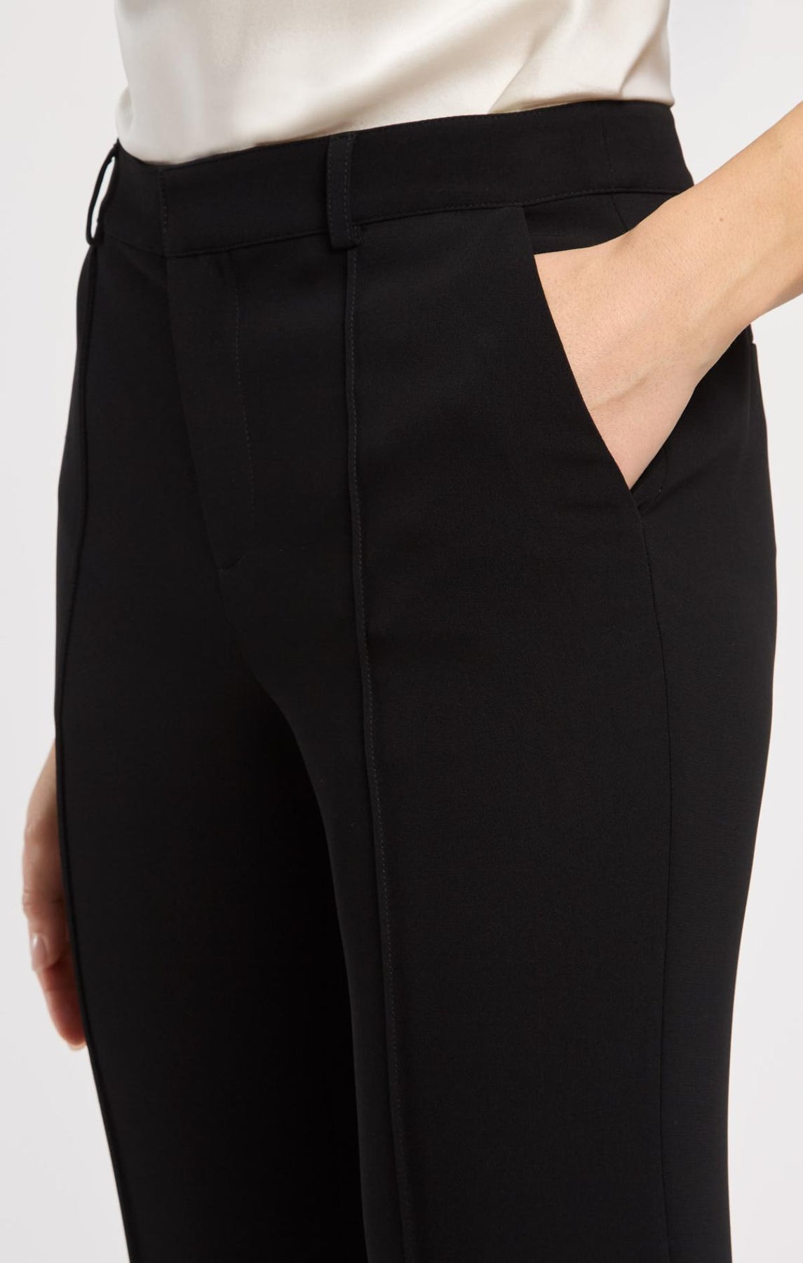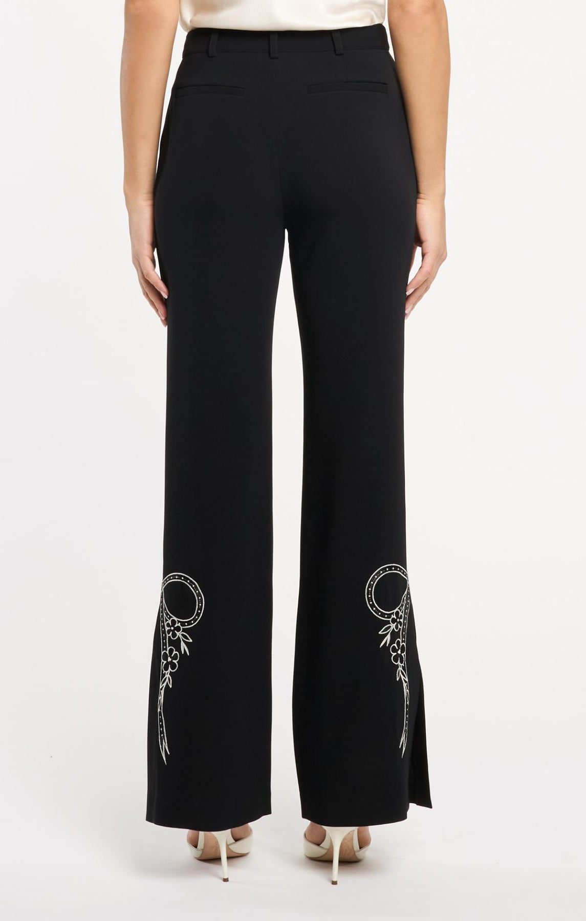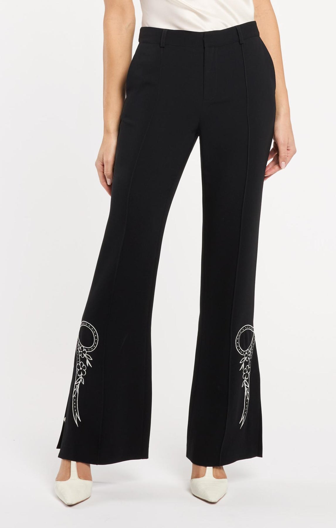 Embrace timeless elegance with the Cascading Ribbon Abeline Pant. This high-waisted flare features exquisite bow stitching along the side hems and a subtle side slit for effortless movement. A sophisticated staple that transitions seamlessly from office to evening.