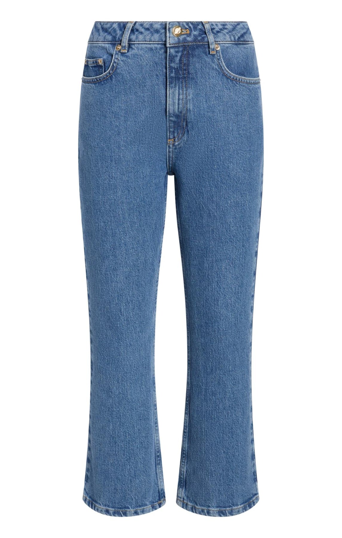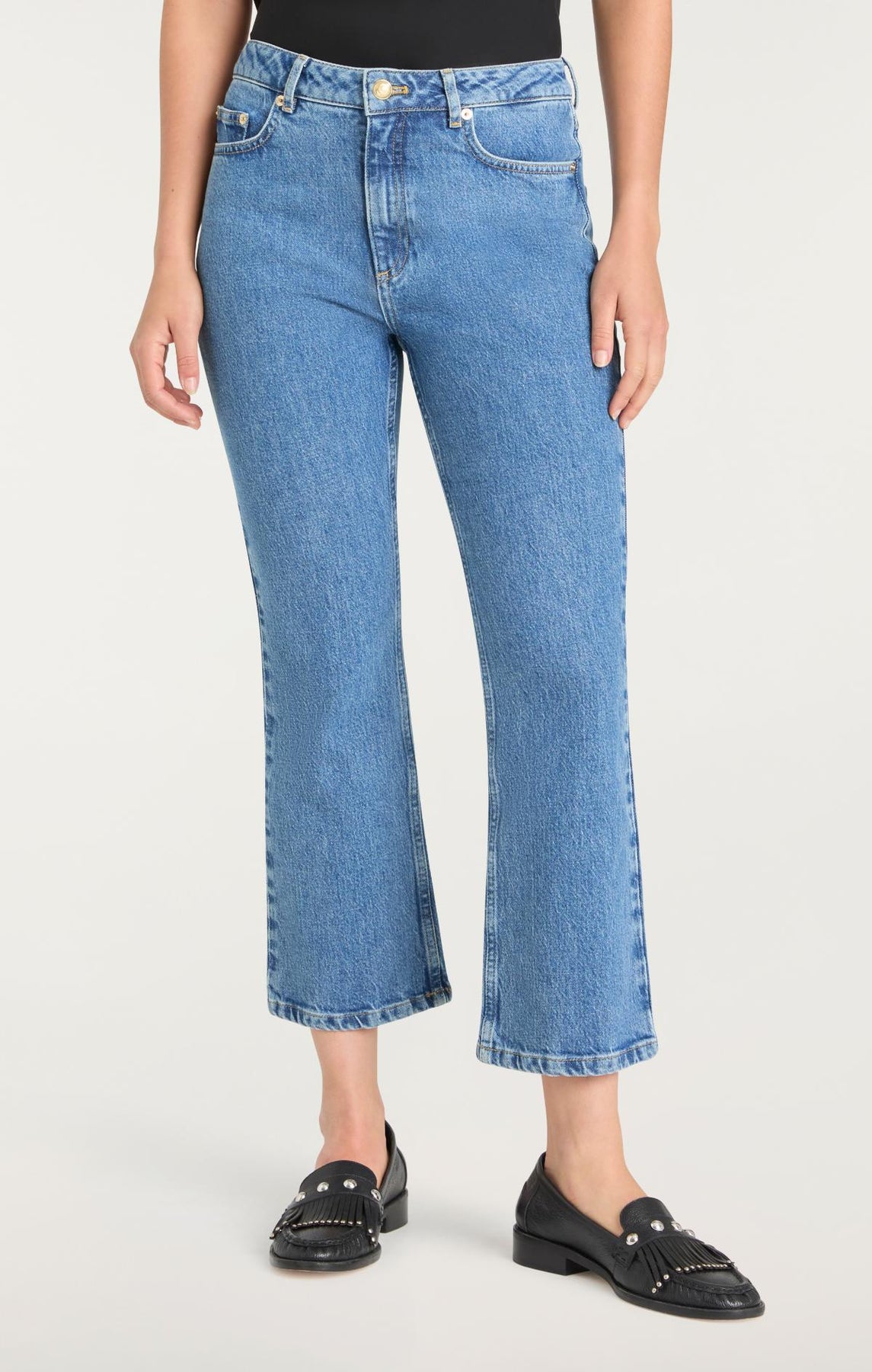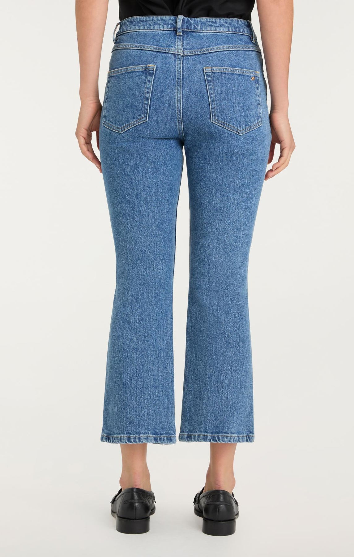 The Cropped Stevie Jeans showcases our five-pocket denim collection with a chic cropped length and mid-rise kick flare silhouette. Expertly tailored with a refined waistband that enhances your shape, this style pairs premium denim with subtle hardware and elevated finishing. Effortlessly versatile and built to endure.