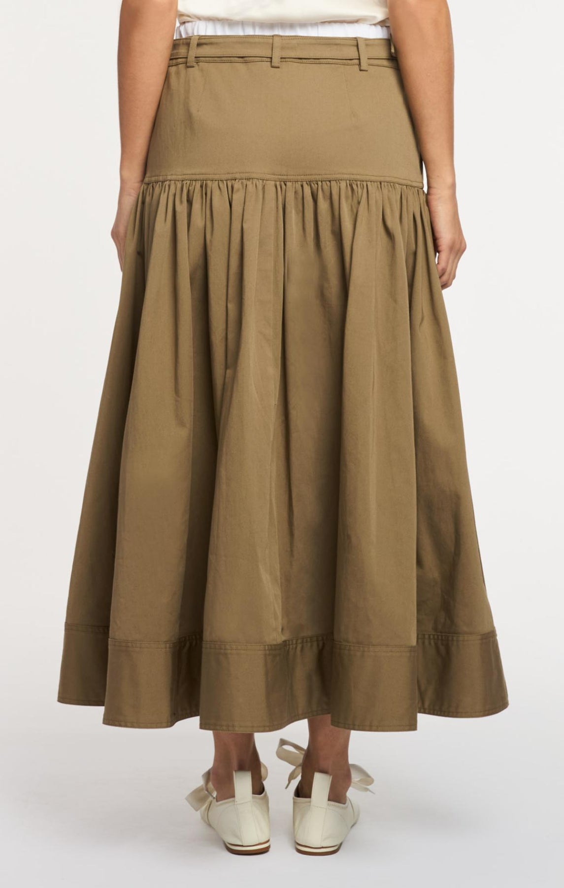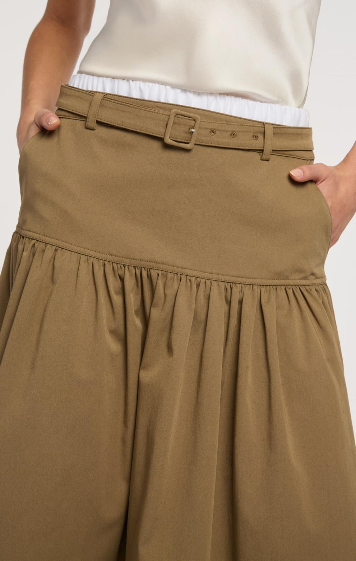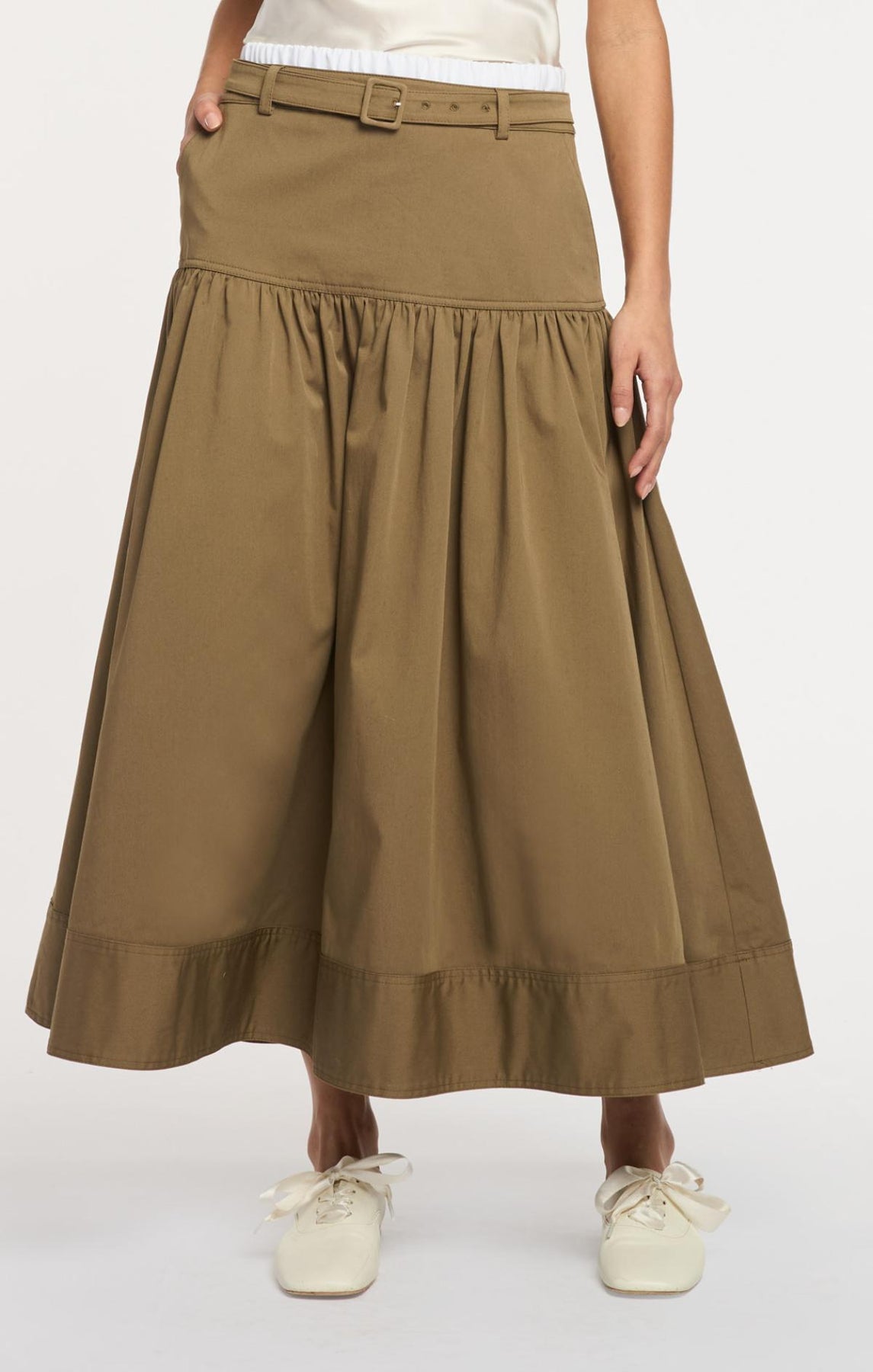 The Peri Skirt delivers effortless style with its A-line silhouette and thoughtfully designed details. A scrunched waistline in a striking contrast color provides flattering definition, while a matching belt anchors the look. The thick hem adds a touch of glamour and movement, making this midi skirt a versatile essential for any wardrobe.
