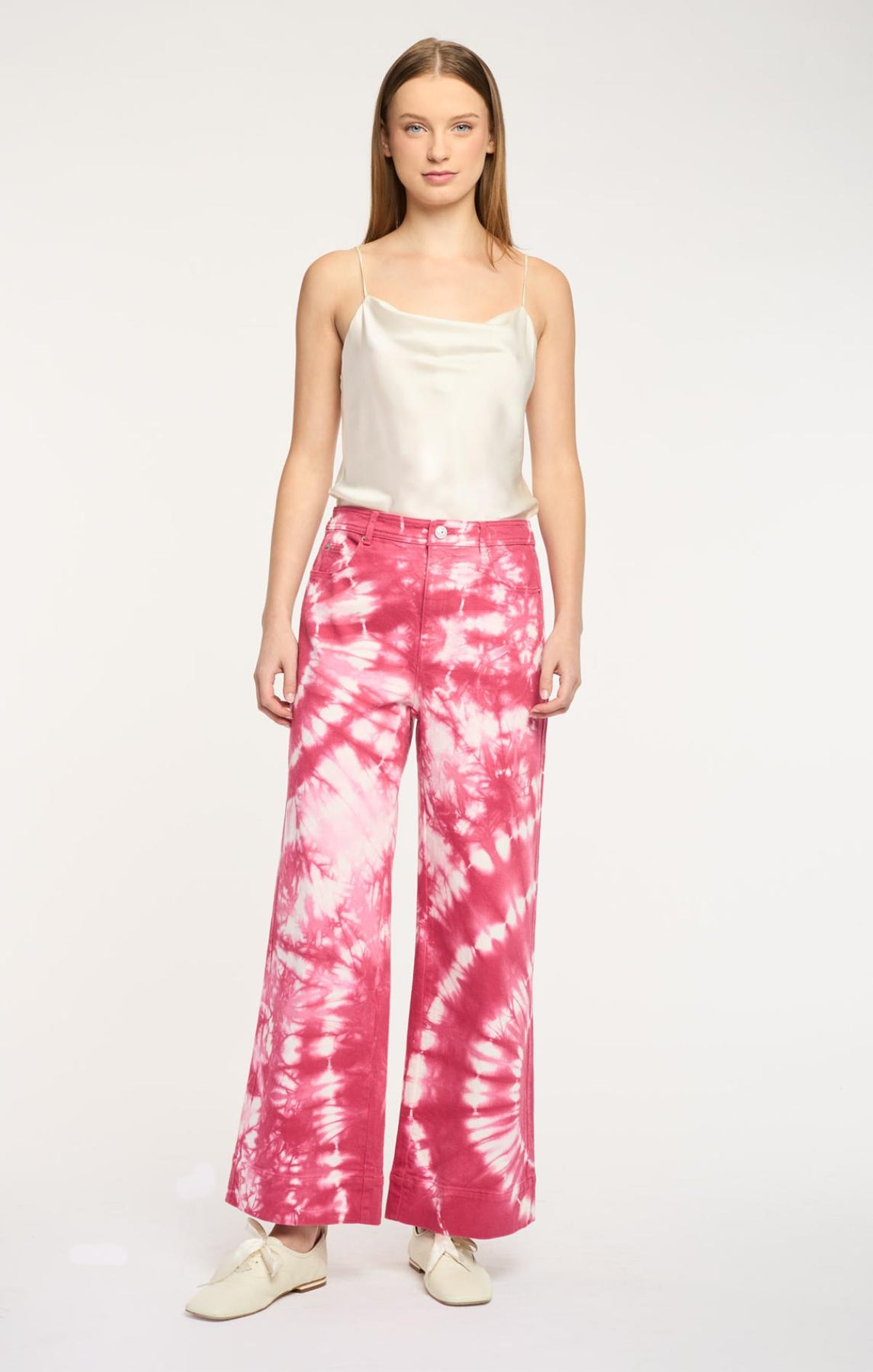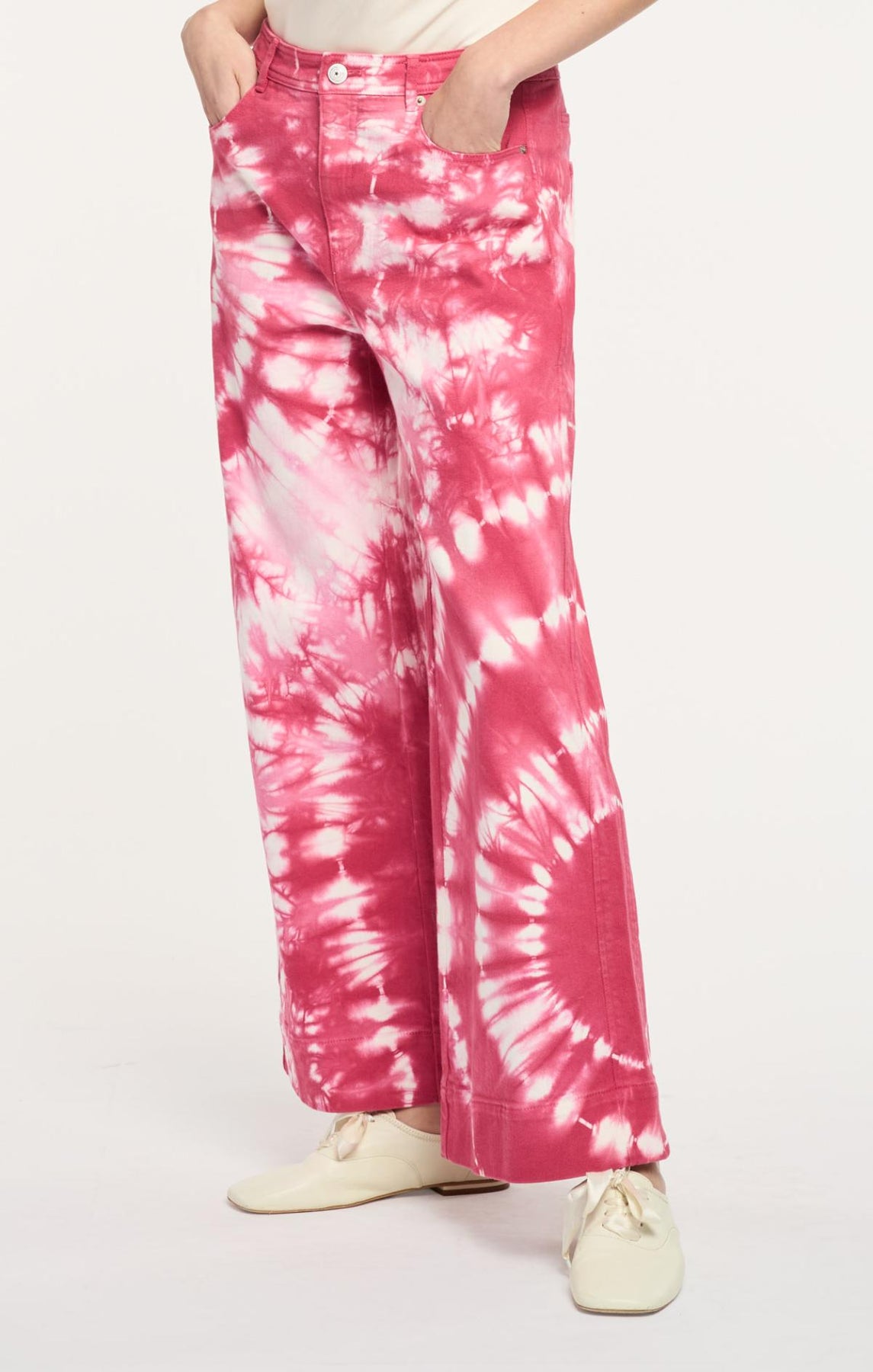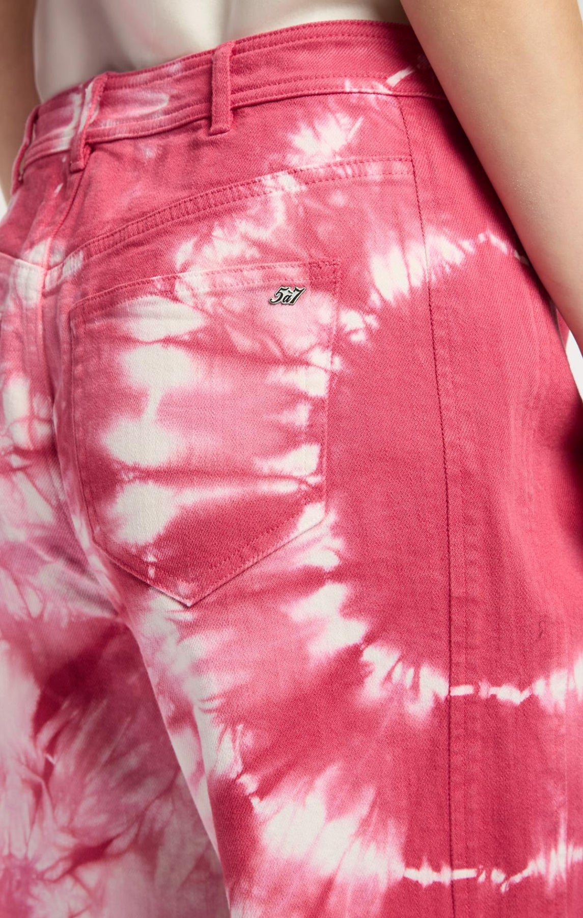The Tie Dye Betsy Jeans bring vibrant color and contemporary edge to your wardrobe. This striking wide leg statement pant showcases eye-catching tie dye patterns on quality denim, complete with five pockets and distinctive 5a7 hardware detailing.
