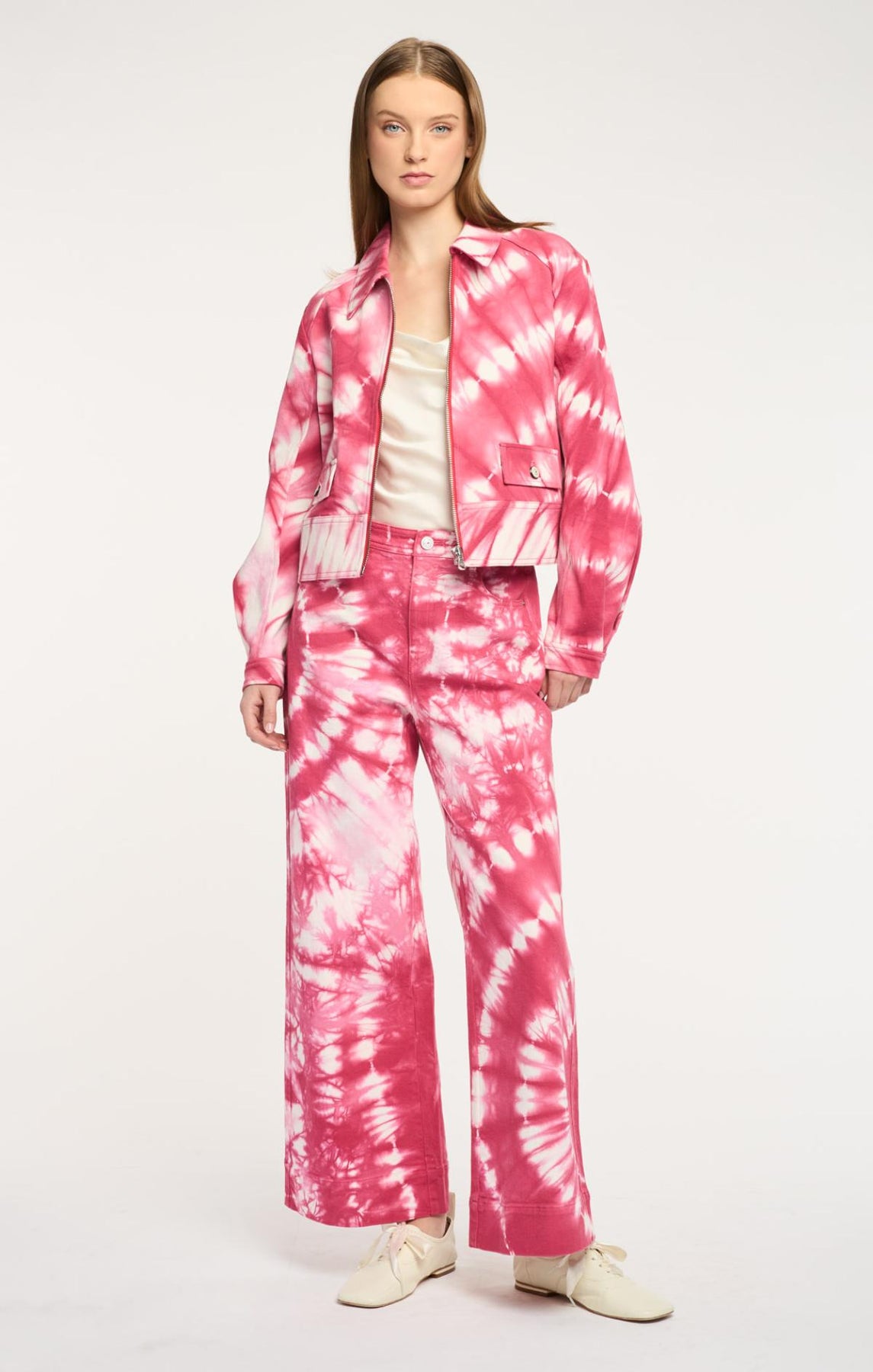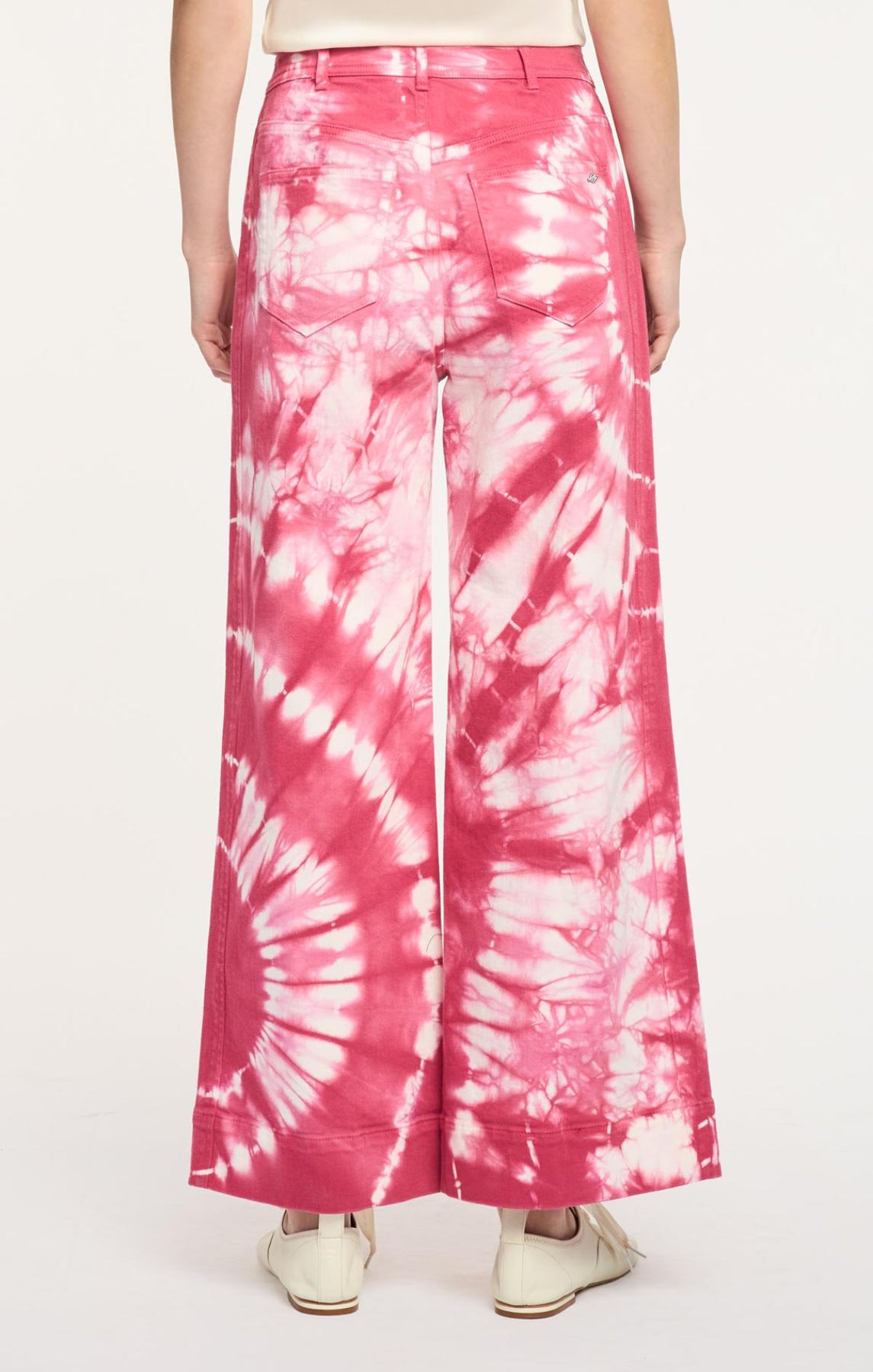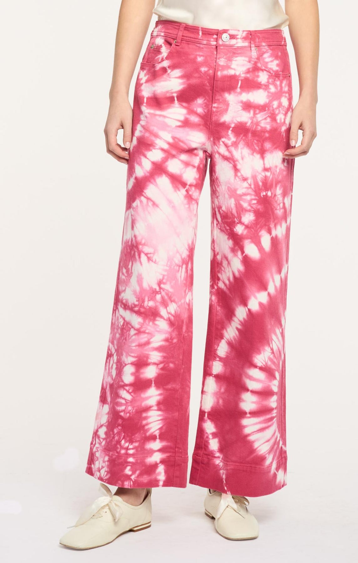 The Tie Dye Betsy Jeans bring vibrant color and contemporary edge to your wardrobe. This striking wide leg statement pant showcases eye-catching tie dye patterns on quality denim, complete with five pockets and distinctive 5a7 hardware detailing.
