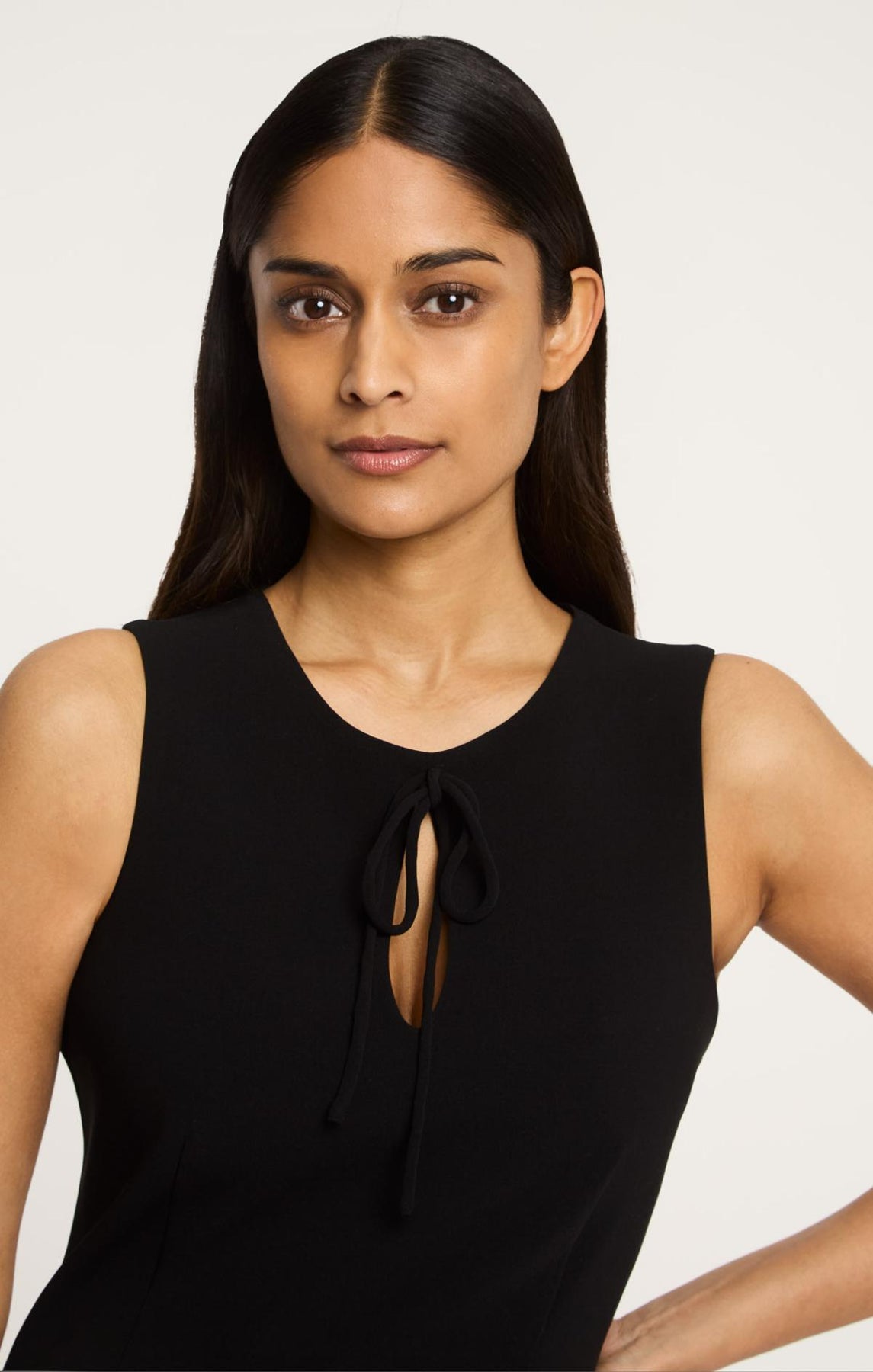 The Deidra Dress captures minimalist sophistication through carefully considered details. A keyhole cutout at the chest pairs with a delicate tie neckline, while contrasted pleating at the hem adds subtle dimension.
