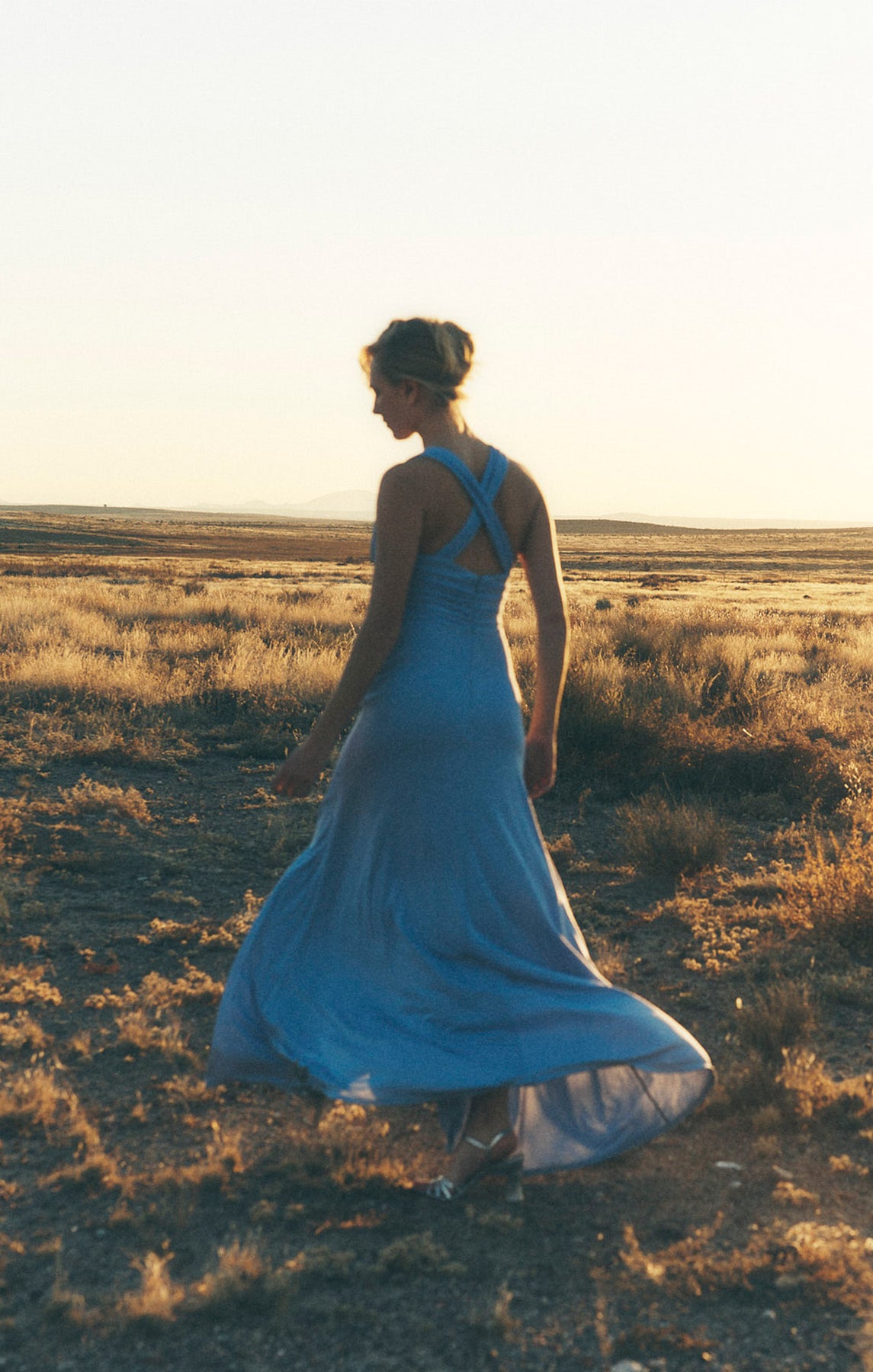The Gertie Gown channels refined sophistication through its sleek column silhouette and daring design details. A plunging neckline pairs with an intricate cross-back, while ruching at the waist adds dimension to the streamlined midi length. Effortlessly elegant for evening occasions.