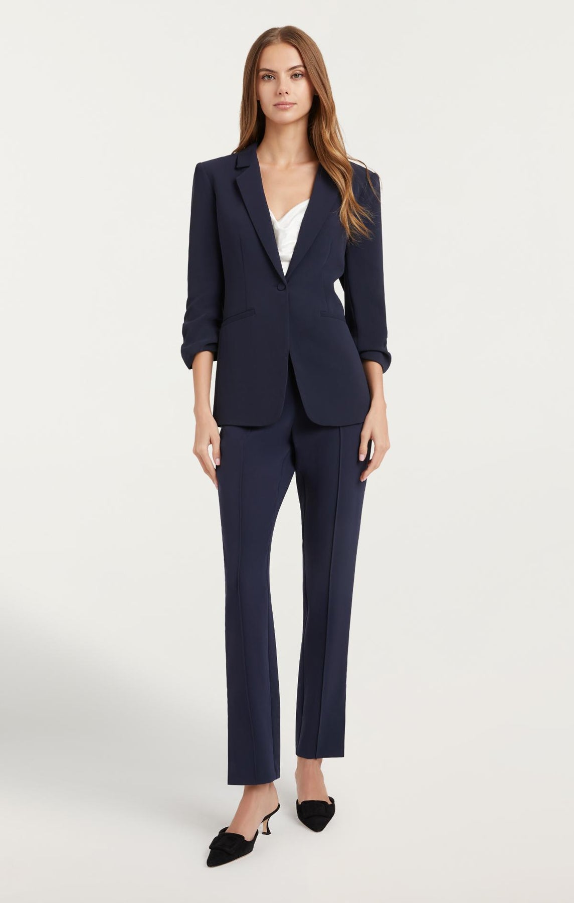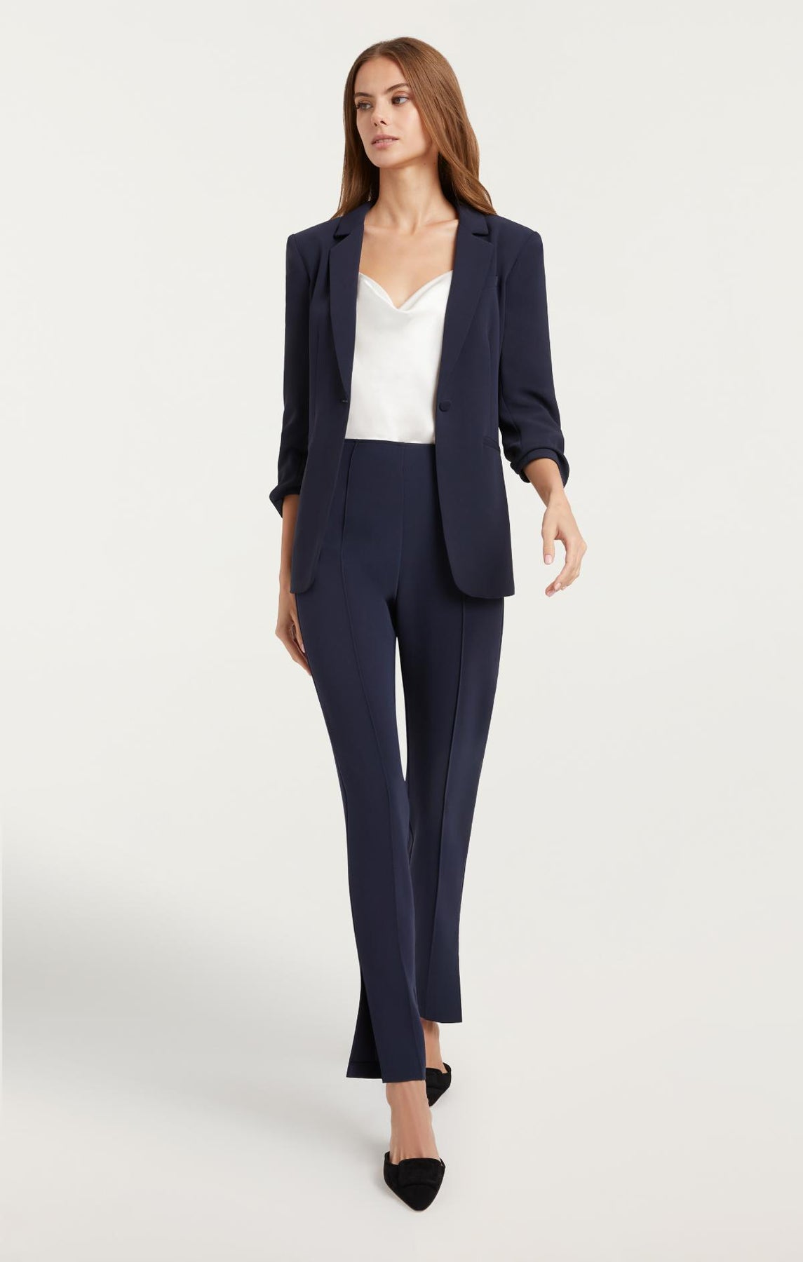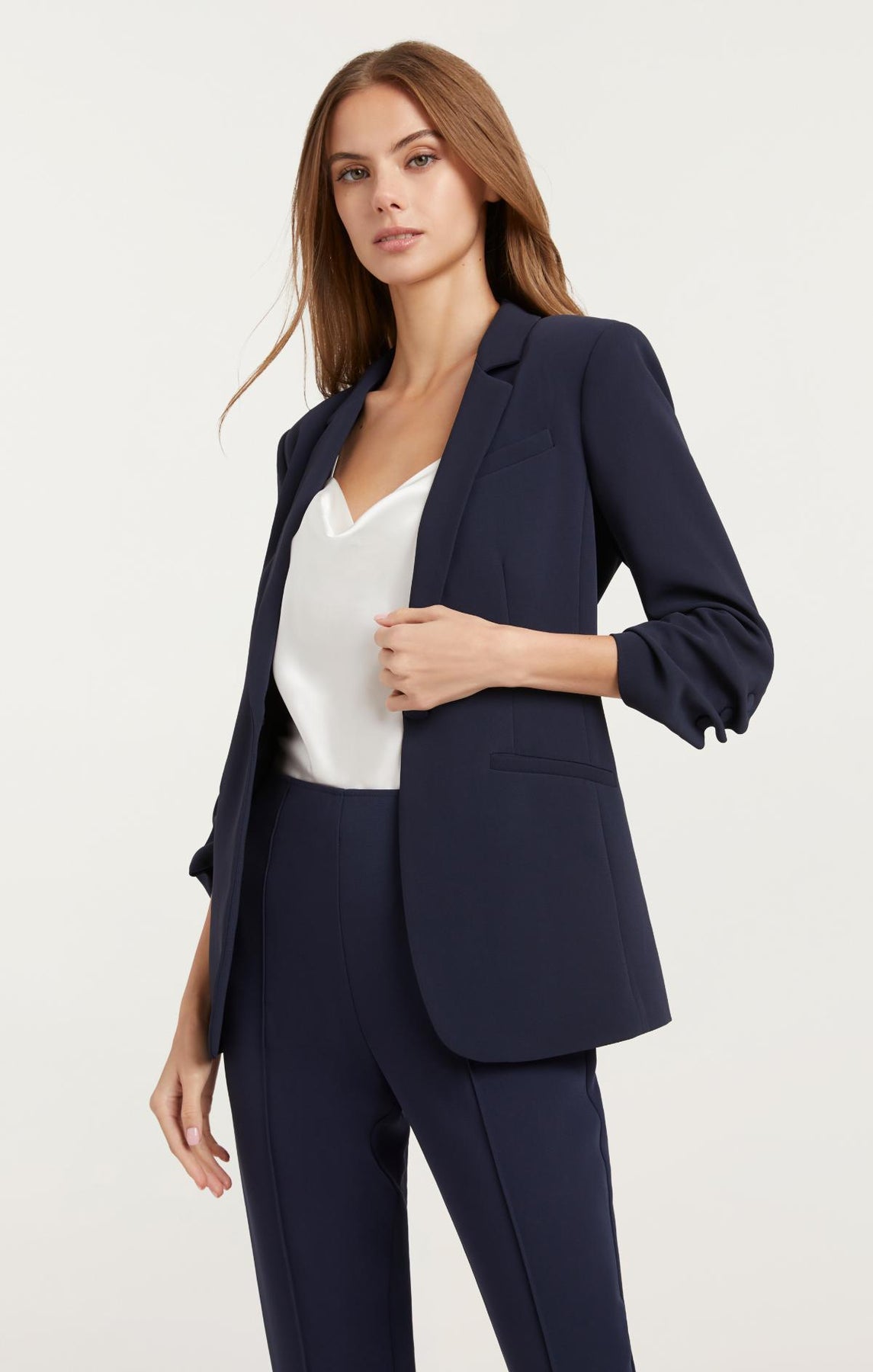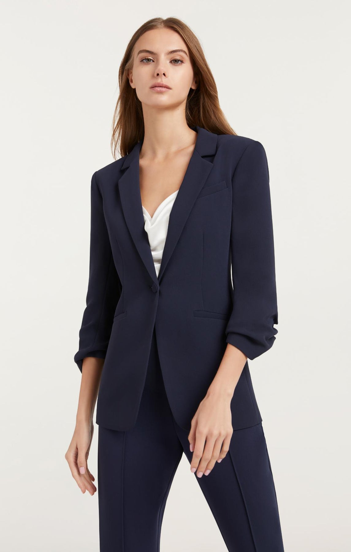 Look polished and professional in this Crepe Khloe Blazer. This expertly tailored piece features a collared neckline, notched lapels, and stylized sleeves for a look that is modernly classic. The classic navy color will have you standing out with sophisticated style. Make a powerful statement with this must-have blazer.
