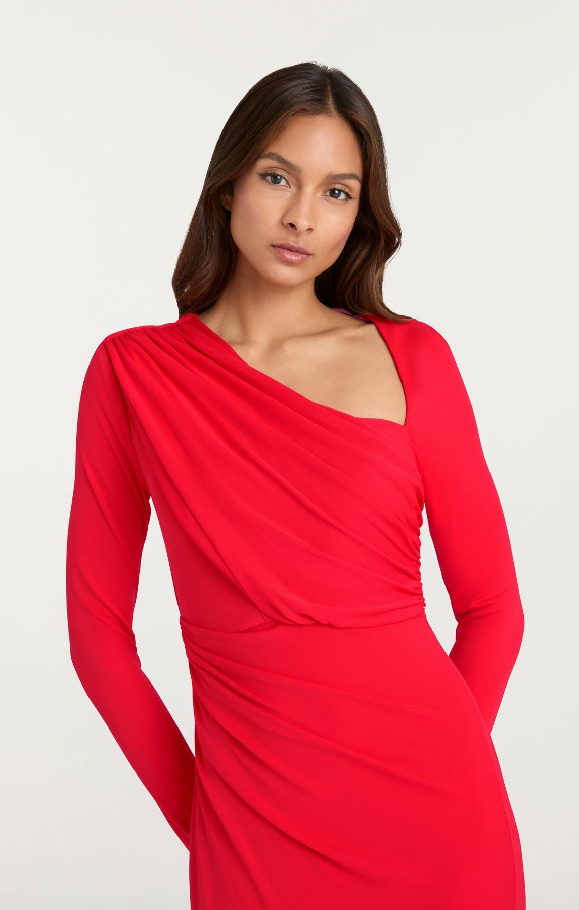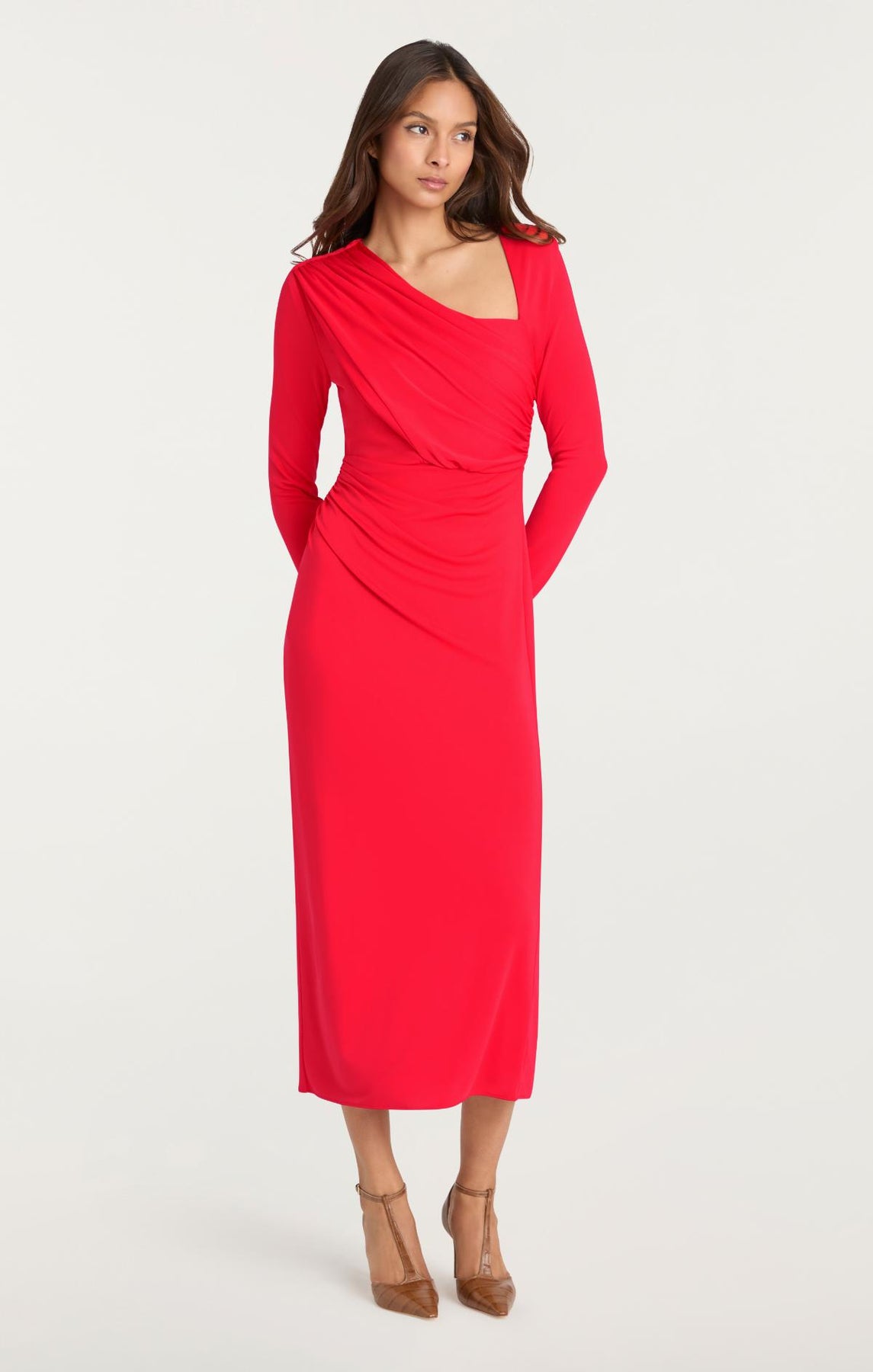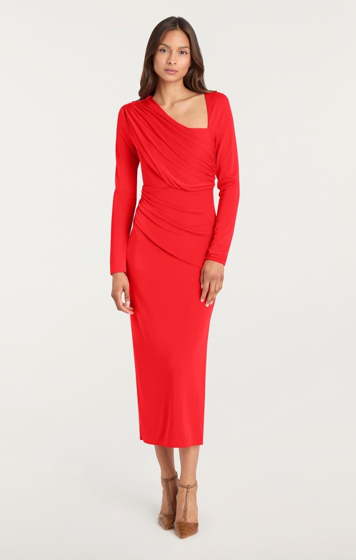 The Jalyn Dress is a sophisticated long sleeve midi designed for cocktail moments. Its asymmetrical neckline creates modern intrigue and ruched details, while a subtle back slit adds movement and allure. Versatile and refined, it carries you through evening celebrations and special moments with effortless sophistication.