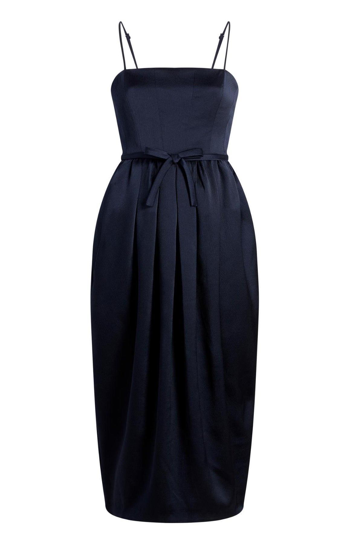 The Soline Dress is a stylish satin choice for evening occasions, featuring delicate skinny straps and a pleated midi skirt that moves gracefully. A bow detail at the waist adds a feminine touch, while the slit in the back offers a subtle yet elegant allure.