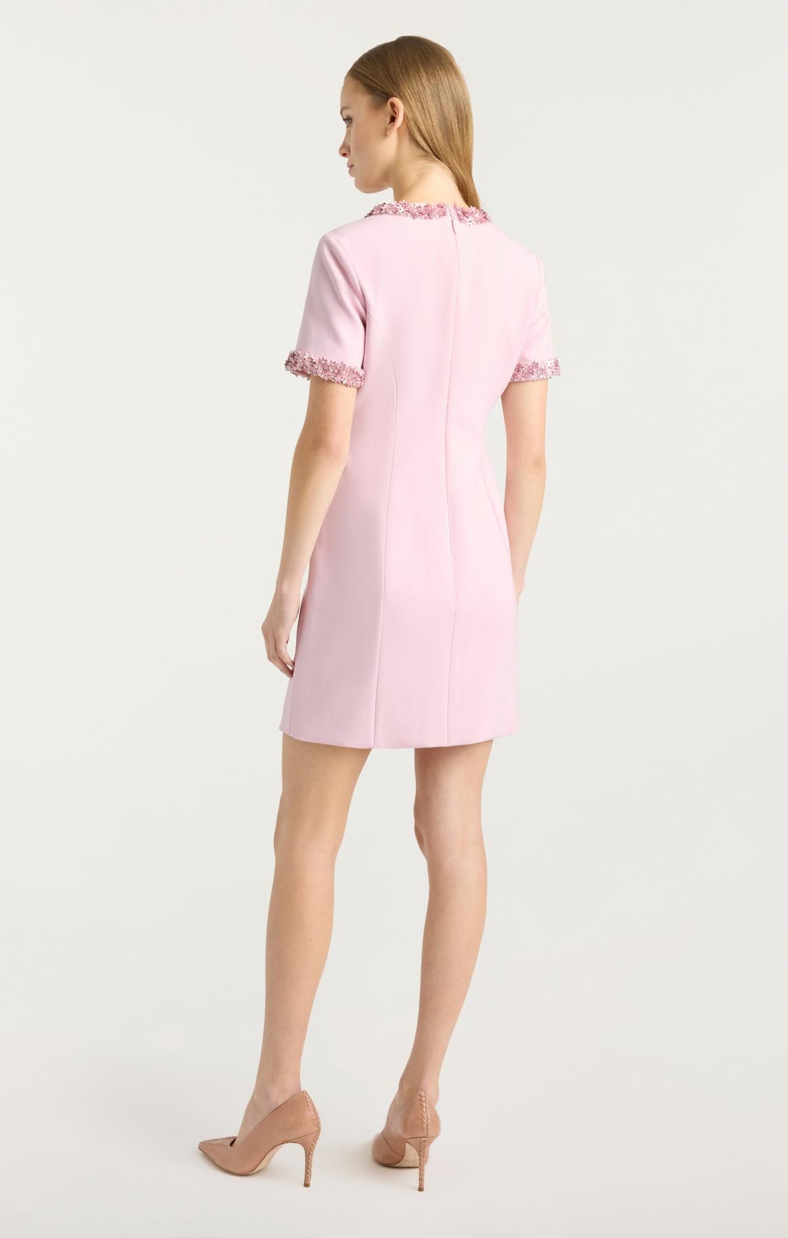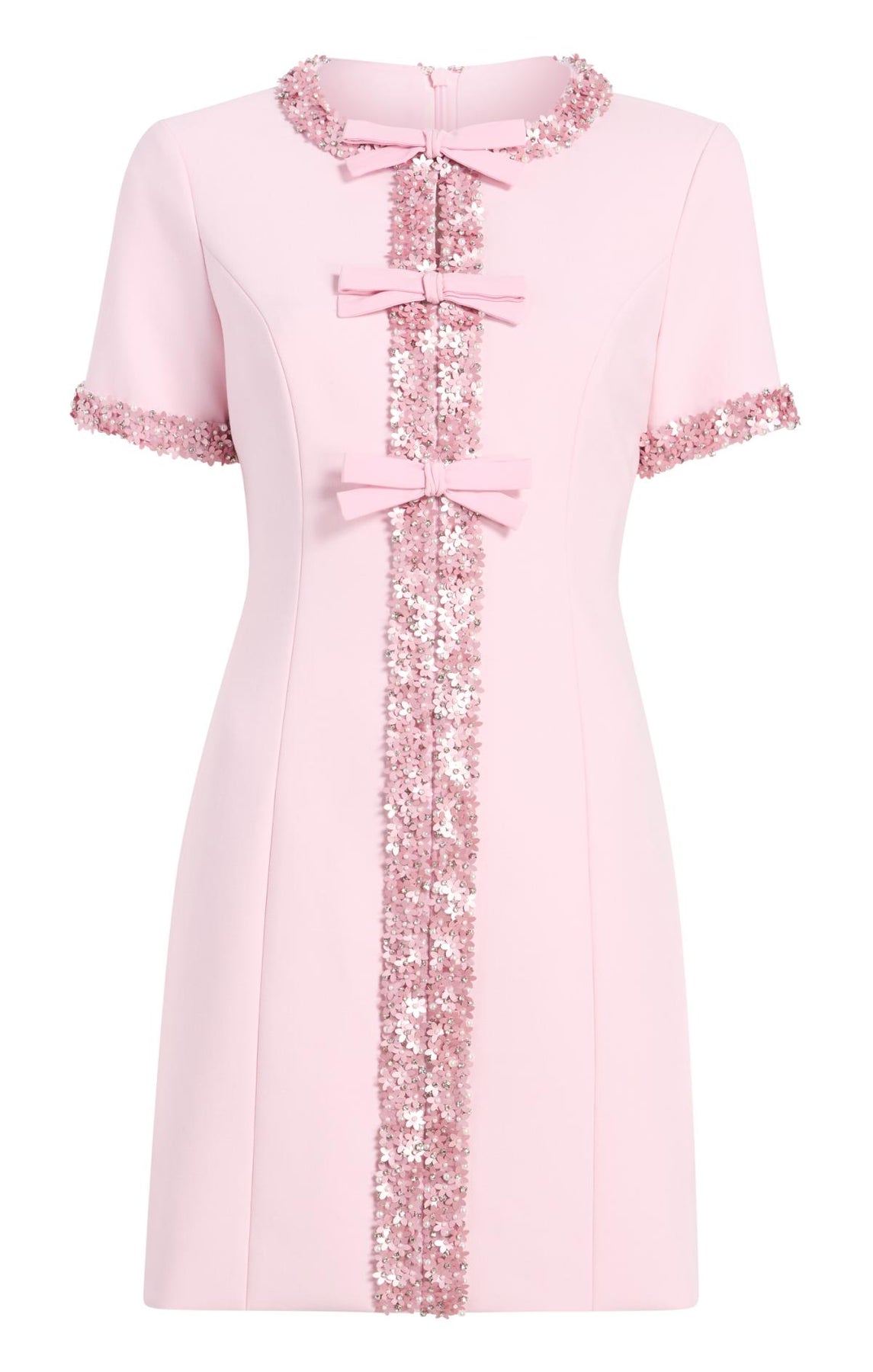 The Maelle Dress is a stylish short-sleeved mini featuring delicate floral embellishments along the neckline, sleeve edges, and down the front. Elegant bows at the chest add a refined touch to this feminine silhouette.