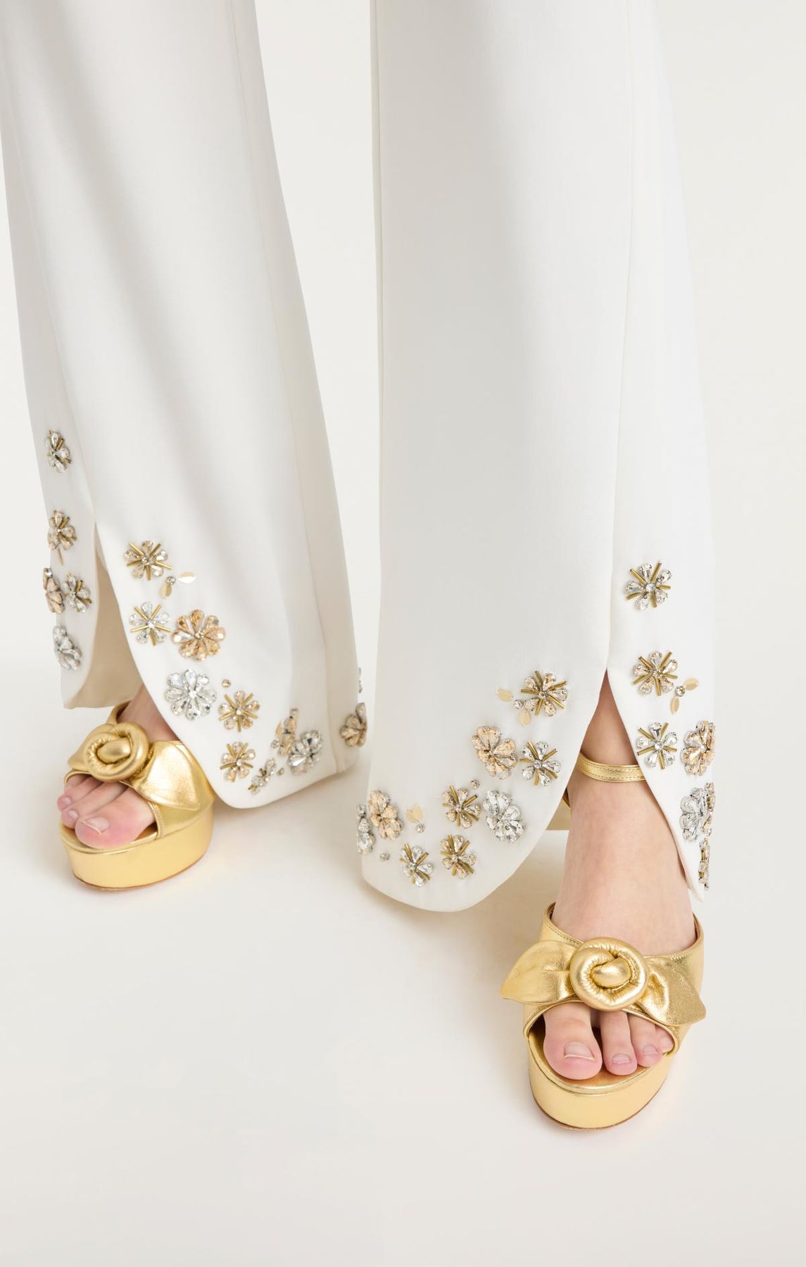 The Tumbling Flowers Veronie Pant showcases refined crystal embellishments at the hem, creating a subtle yet dazzling finish. Designed with a slight slit at the bottom, these pants provide effortless movement and a contemporary edge, making them a stylish choice for any occasion.