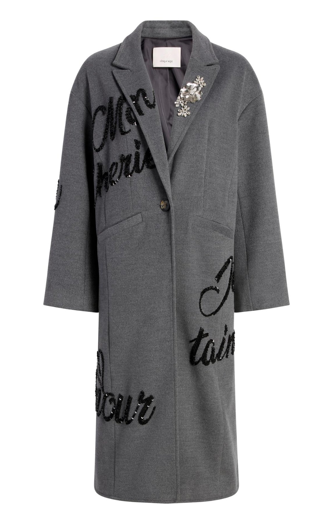 Create a memorable look with the Crushed Sequin Loveletter Gravis Coat, showcasing a textured sequin pattern with delicate silver accents for soft elegance. This mid-length coat seamlessly blends glamour with a sleek silhouette, making it an ideal choice to elevate your look from day to night.
