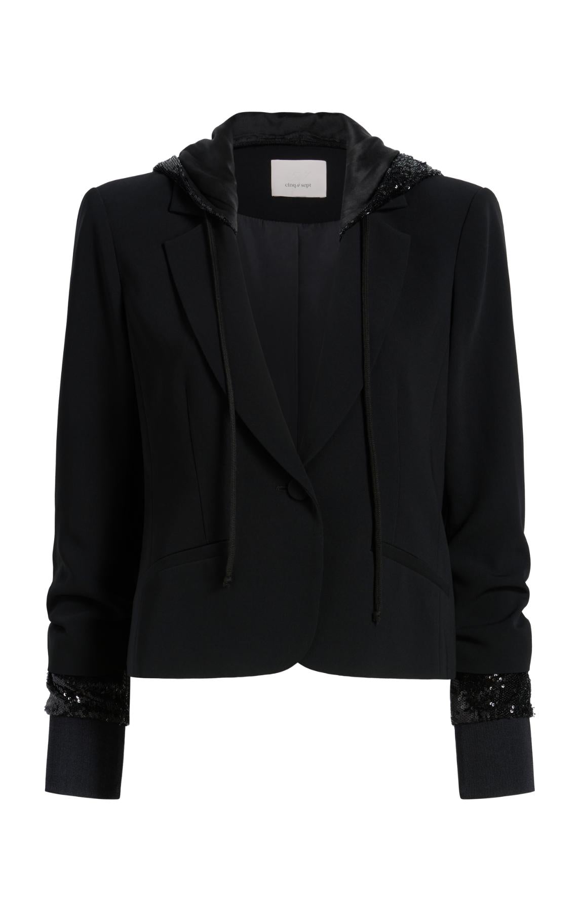 The Sequin Hooded Le Petit Khloe Jacket combines classic tailoring with a modern twist. Featuring a sleek blazer design enhanced by a hood adorned with shimmering sequins, this jacket adds a stylish spark to your wardrobe.