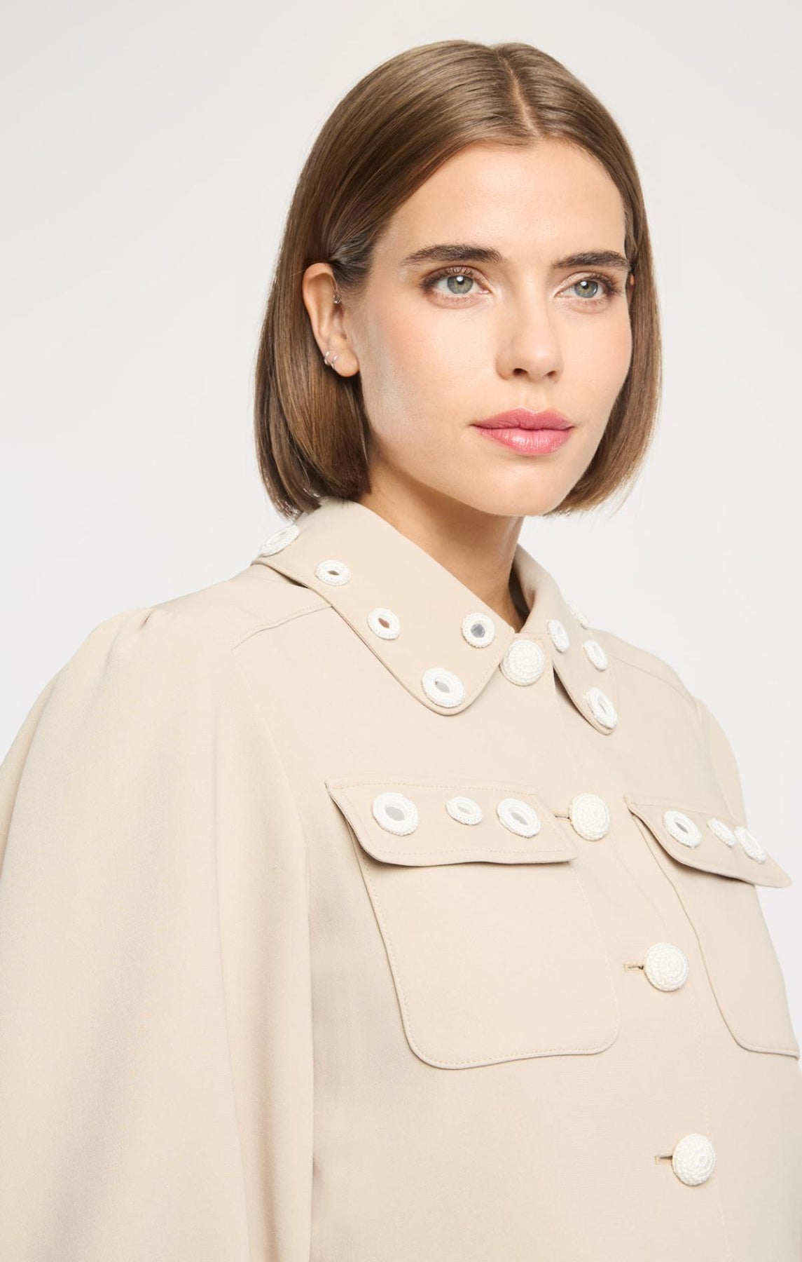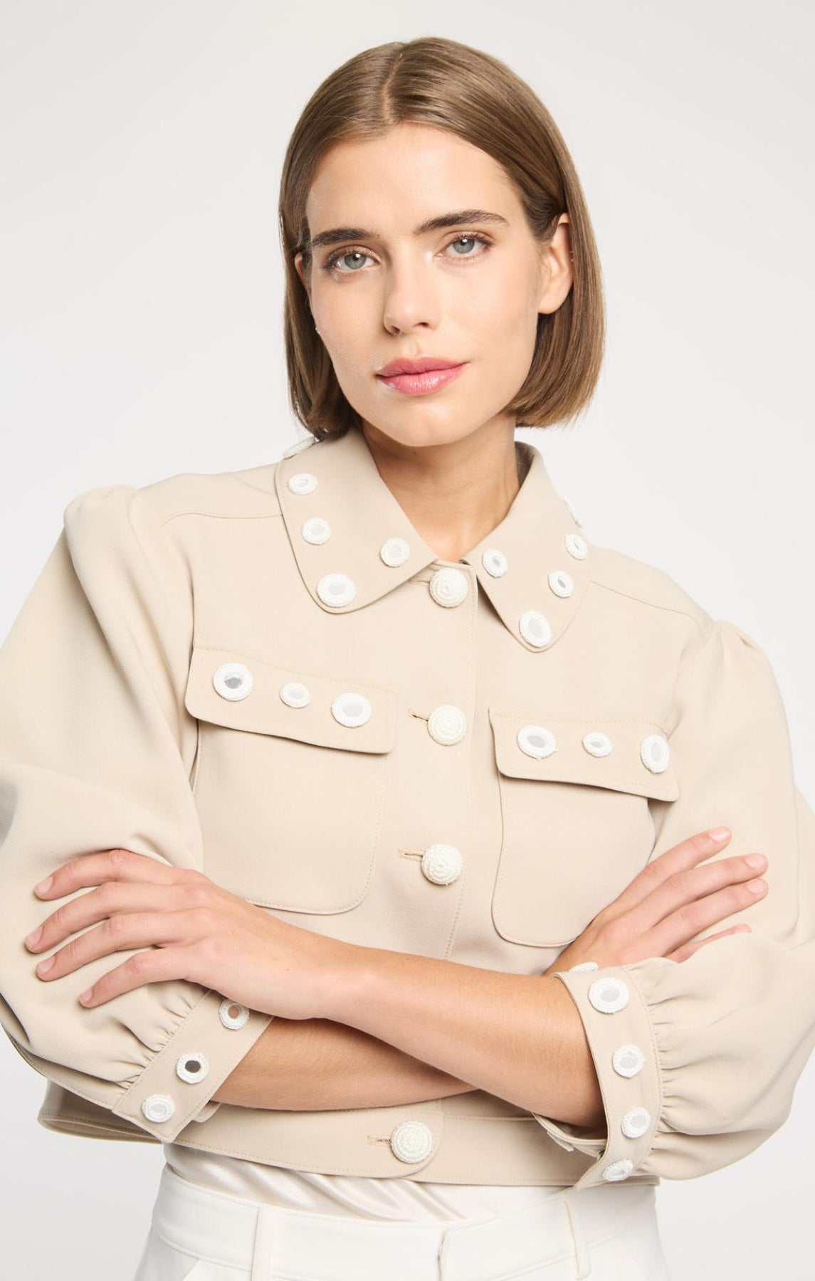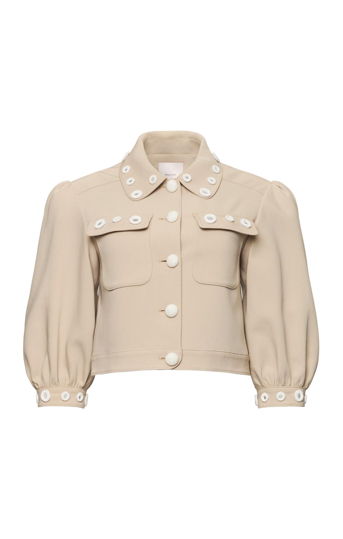 The Crochet Mirrors Gilliana Jacket elevates everyday style with round crochet mirrors adorning the collar and cuffs. Distinctive crochet buttons, delicate bishop sleeves, and practical front flap pockets create an effortlessly sophisticated silhouette perfect for layering.