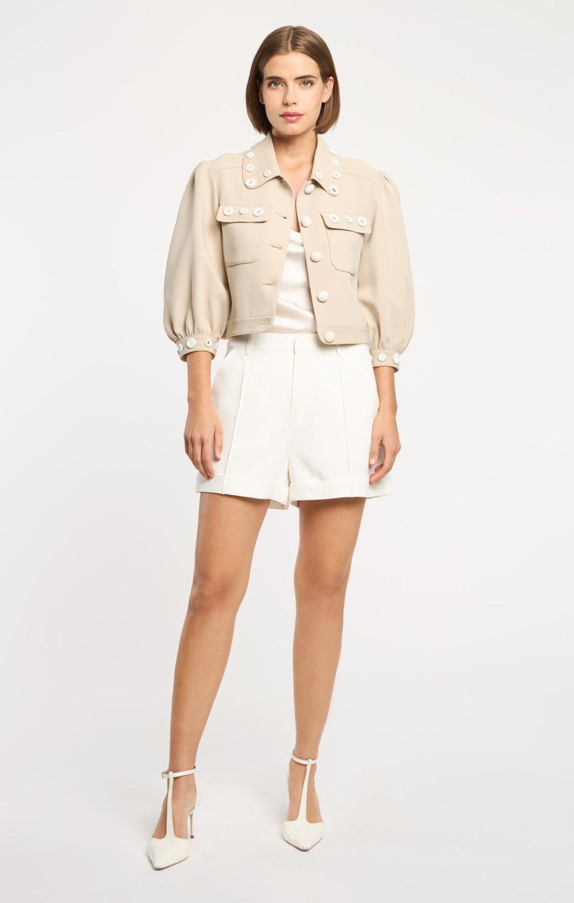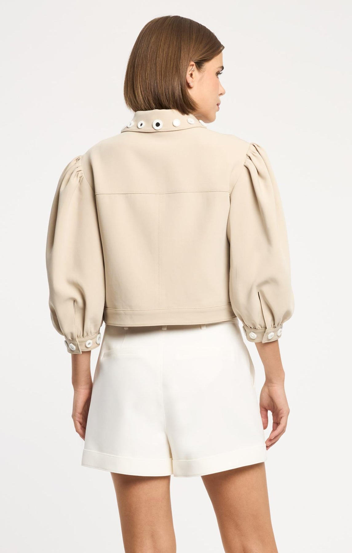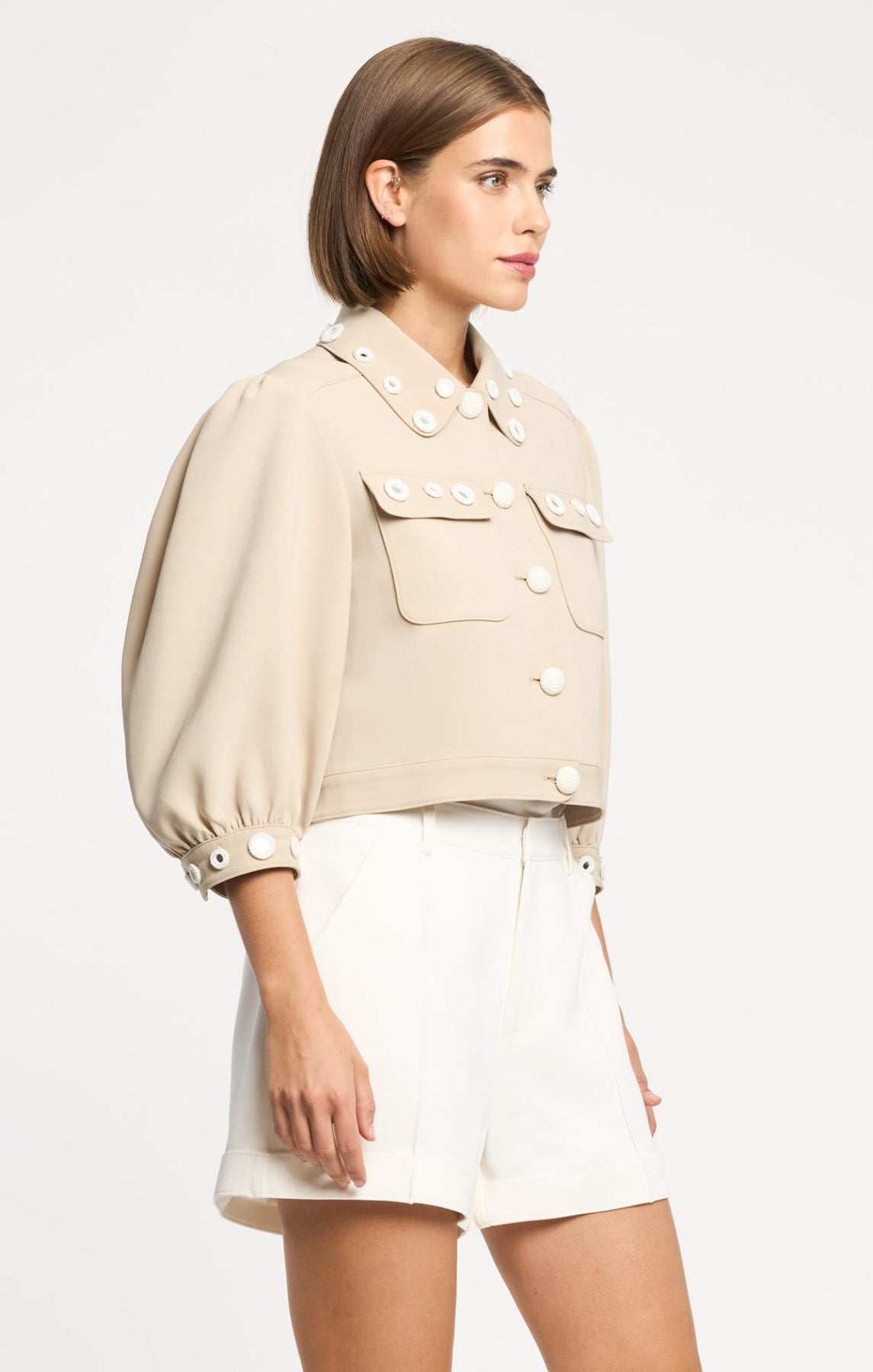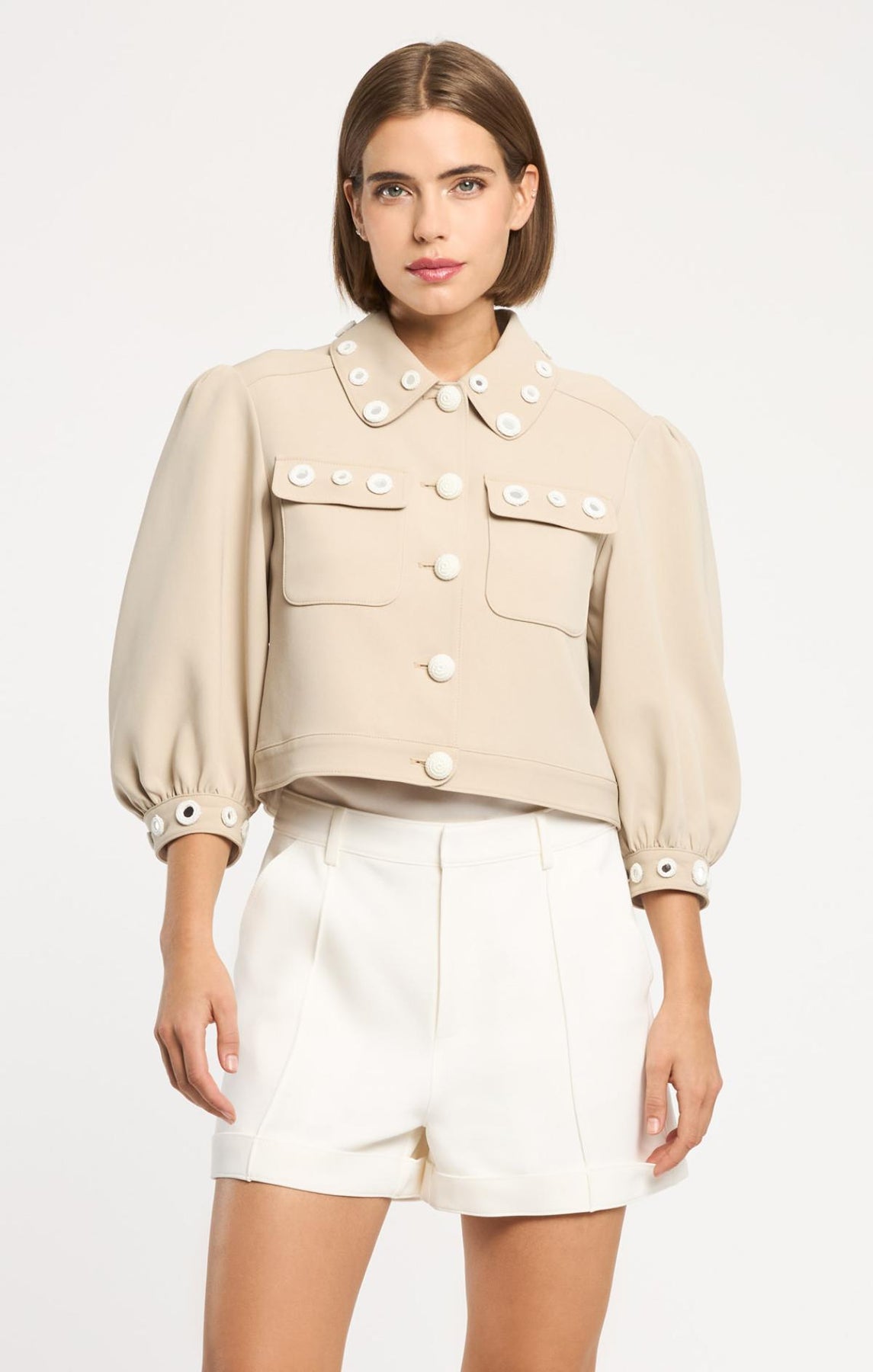 The Crochet Mirrors Gilliana Jacket elevates everyday style with round crochet mirrors adorning the collar and cuffs. Distinctive crochet buttons, delicate bishop sleeves, and practical front flap pockets create an effortlessly sophisticated silhouette perfect for layering.