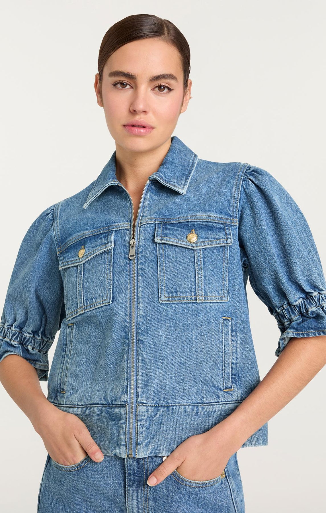 The Holly Jean Jacket is a light wash denim staple with refined details. Cinched sleeves, a crisp collar, and front flap pockets create a polished look, while the zip-up front offers easy styling versatility.