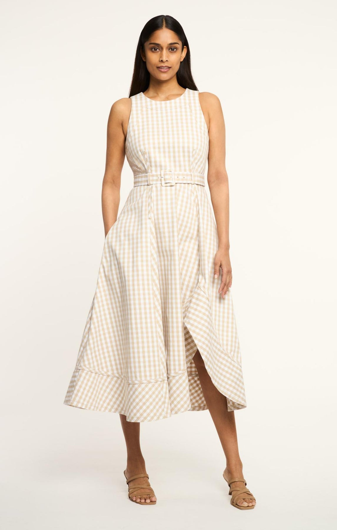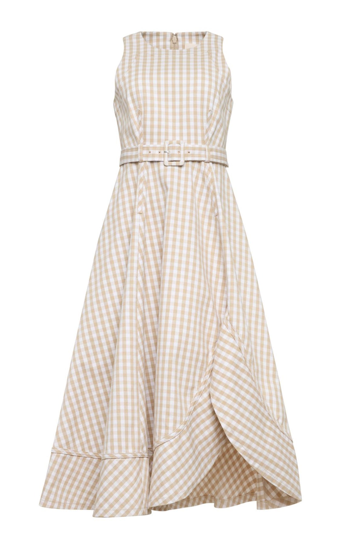 Elevate your seasonal look with the Mini Gingham Zelda Dress. This sleeveless denim style features a charming gingham pattern throughout, paired with a flattering belted waist and asymmetrical hem for modern edge.