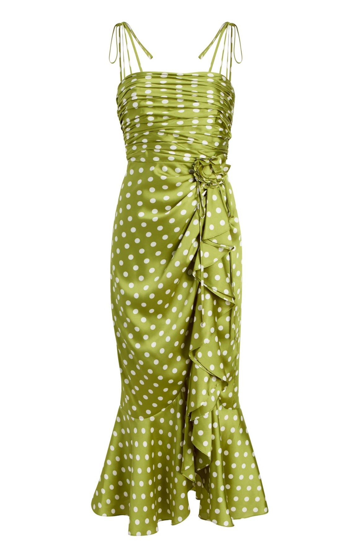 The Camille Polka Dot Mireya Dress combines playful prints with polished details. A ruched bodice and adjustable self-tie straps ensure a flattering fit, while a floral fabric accent at the waist adds feminine charm. The midi length features a ruffle side slit and flowy hem for movement and sophistication.