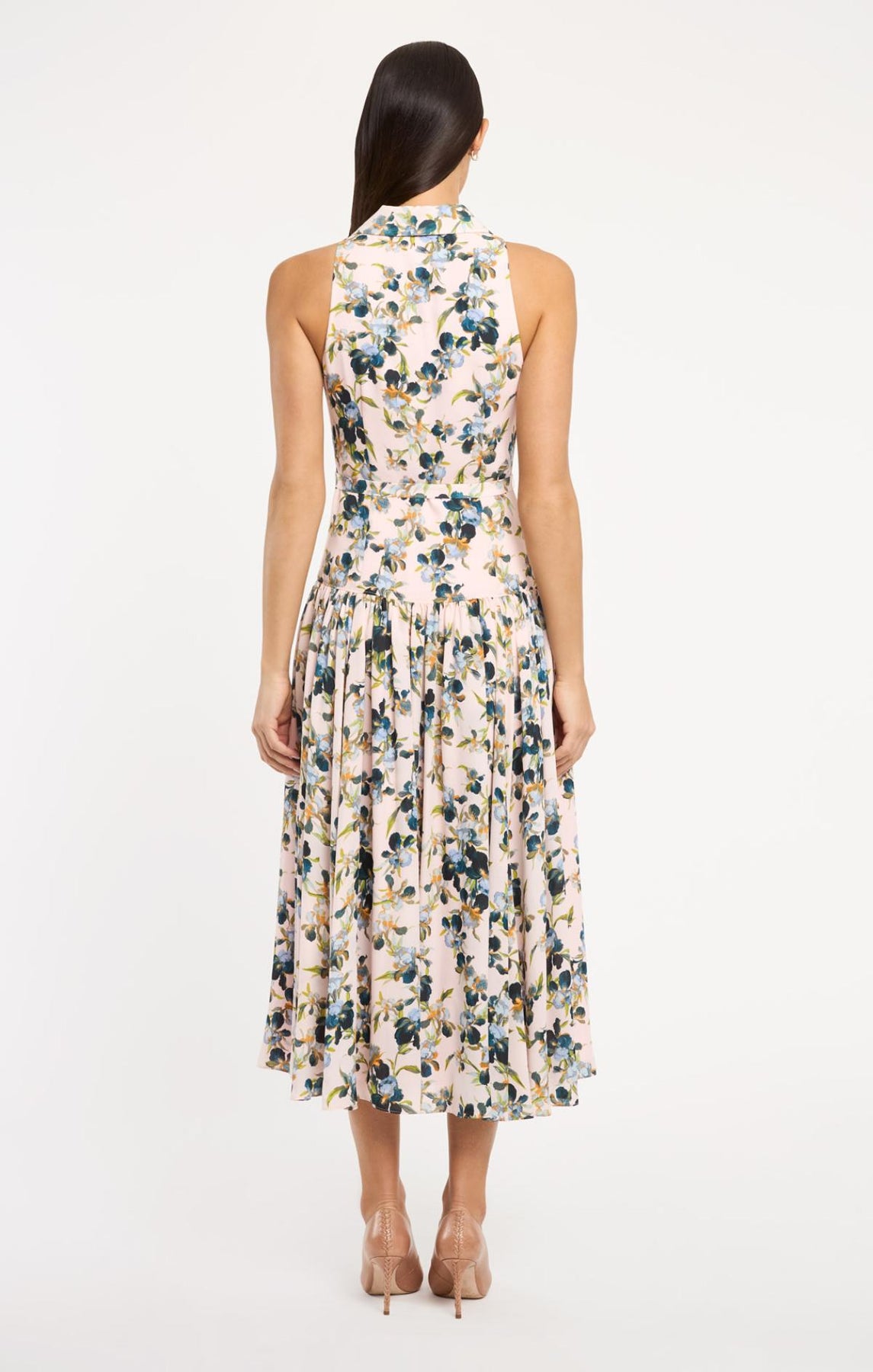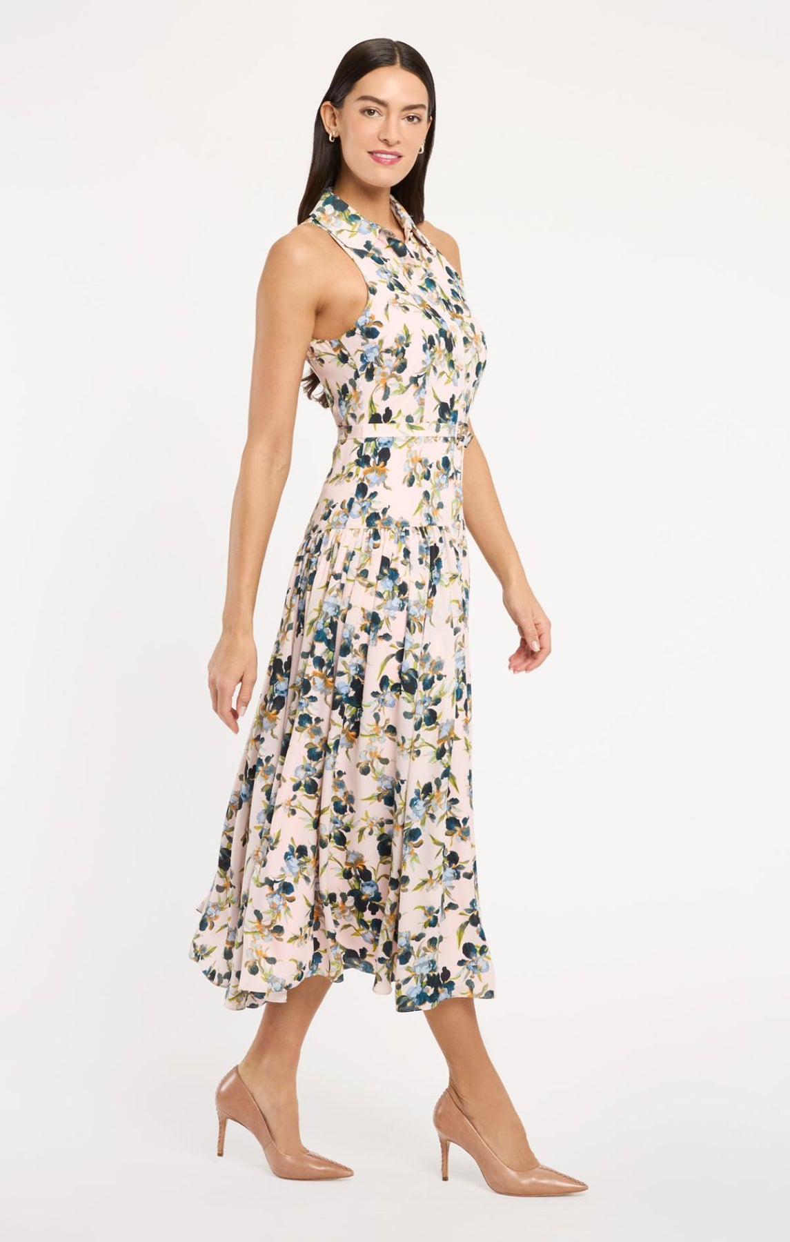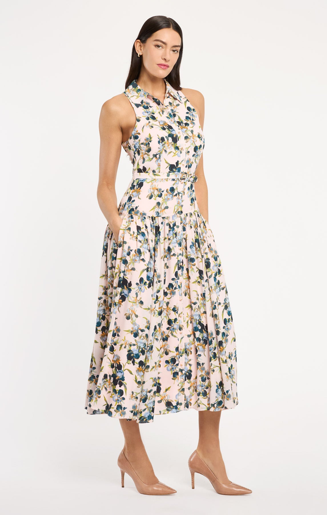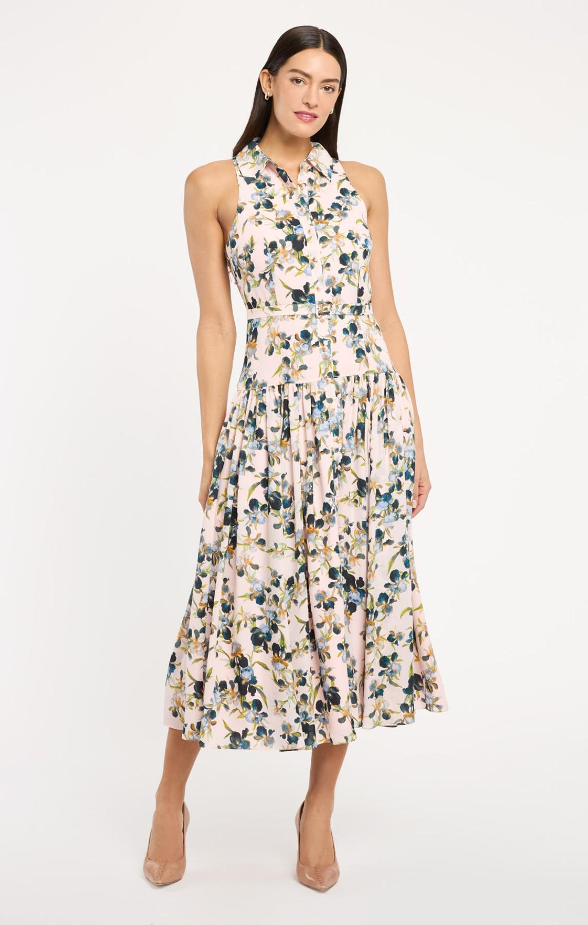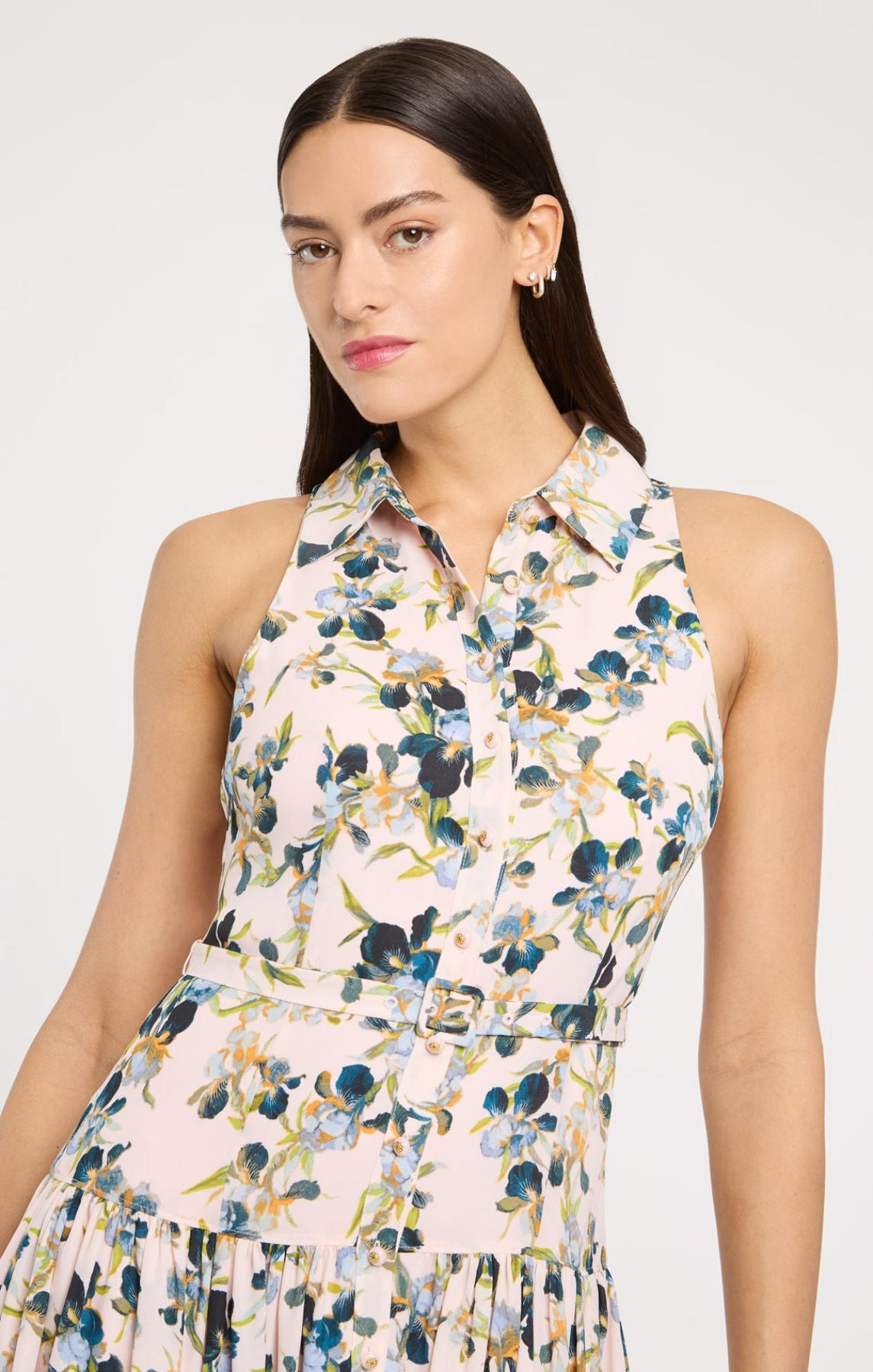 Crafted for sophisticated daytime elegance, the Trailing Iris Sarai Dress features a romantic floral print with a crisp collar and sleeveless design. The button-up front and flowing skirt create an effortlessly refined silhouette, while a coordinating waist belt defines your shape with understated polish.