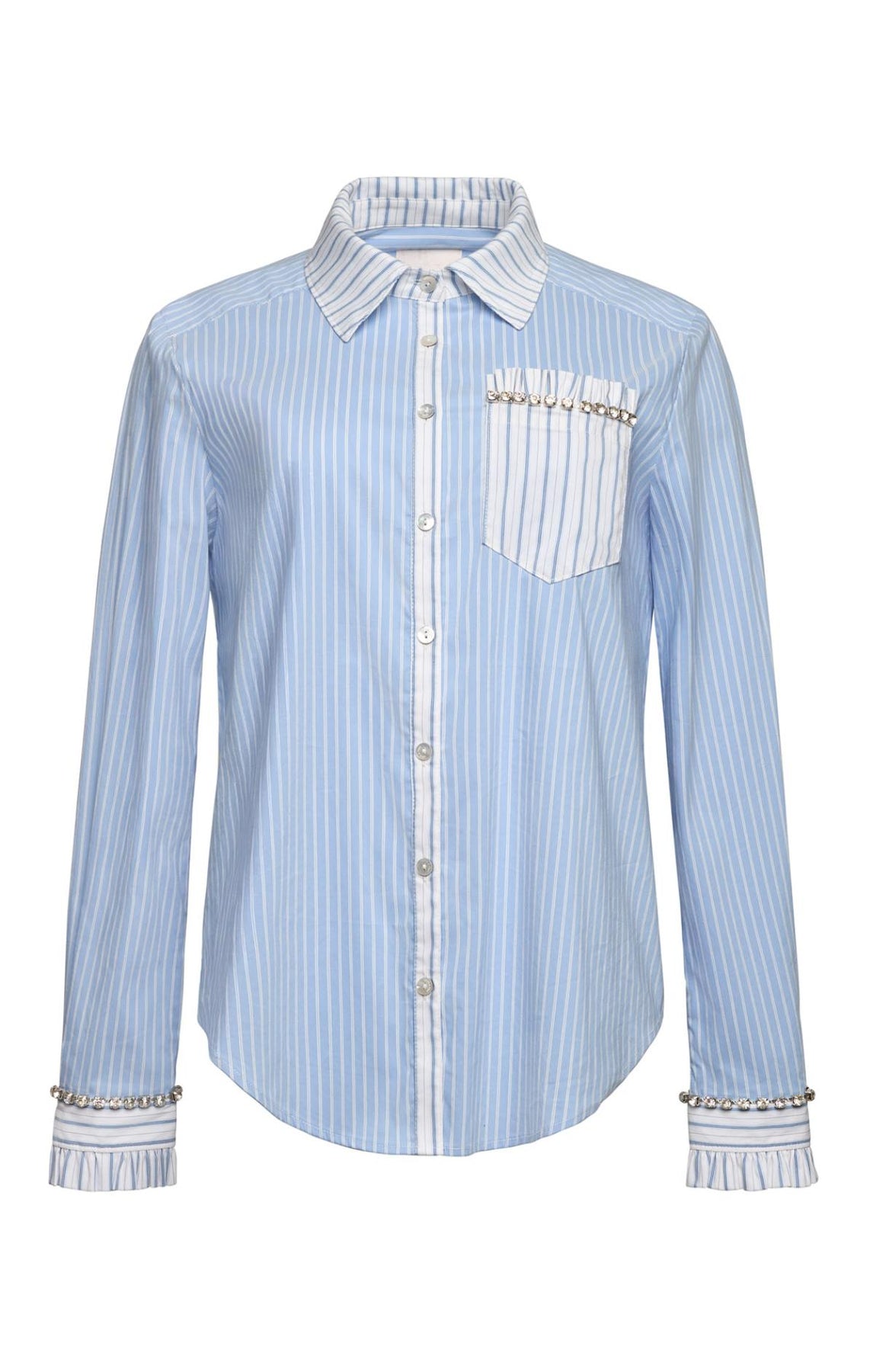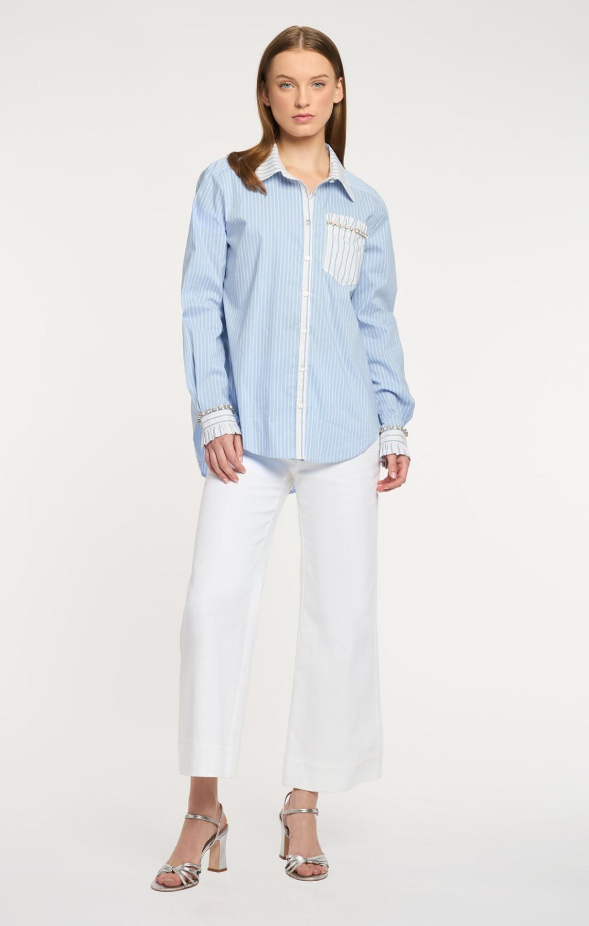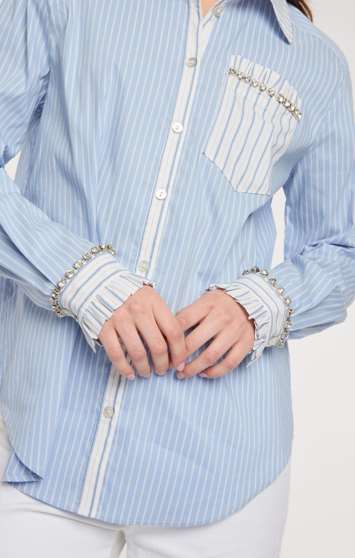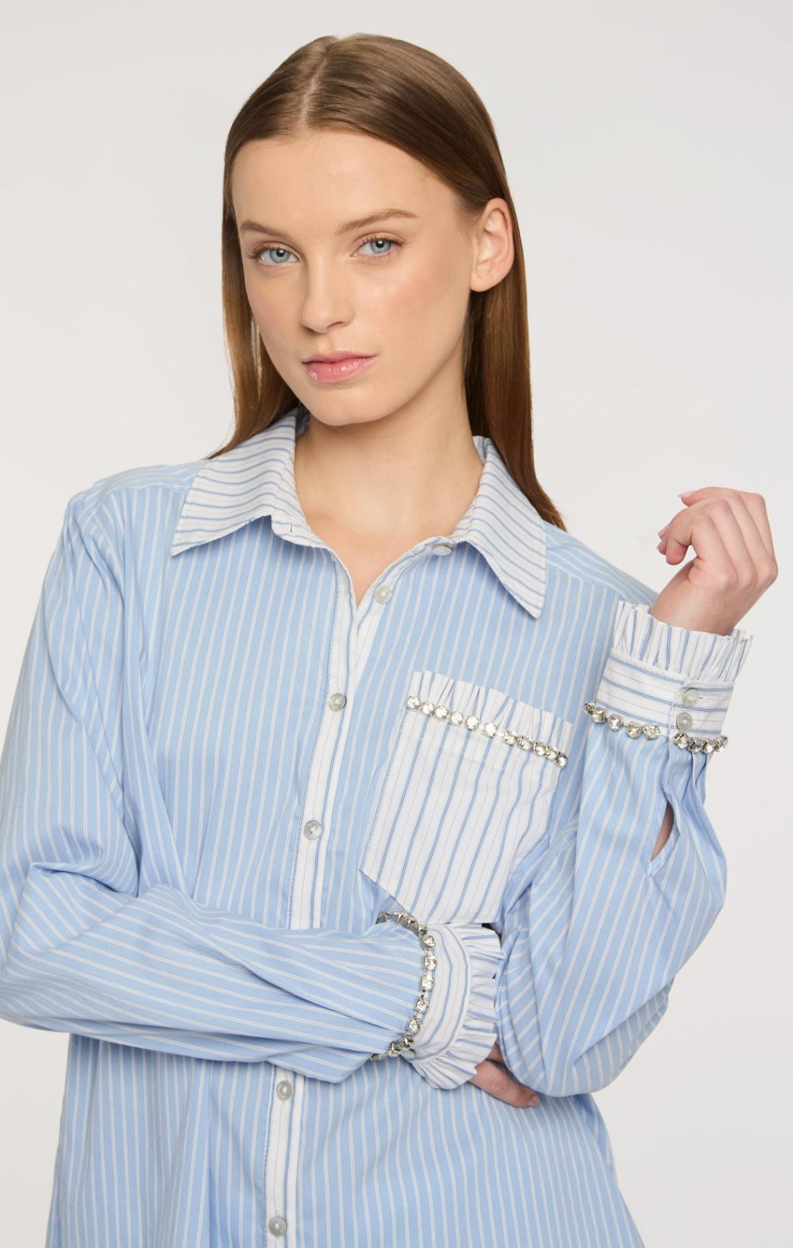 The Dorsia Top showcases a refined striped design with an inverted stripe pattern adorning the cuff, lapel, collar, and front pocket. Rhinestone-embellished cuffs deliver a luxe finishing touch, making this blouse an ideal choice for those seeking subtle elegance with a hint of sparkle.