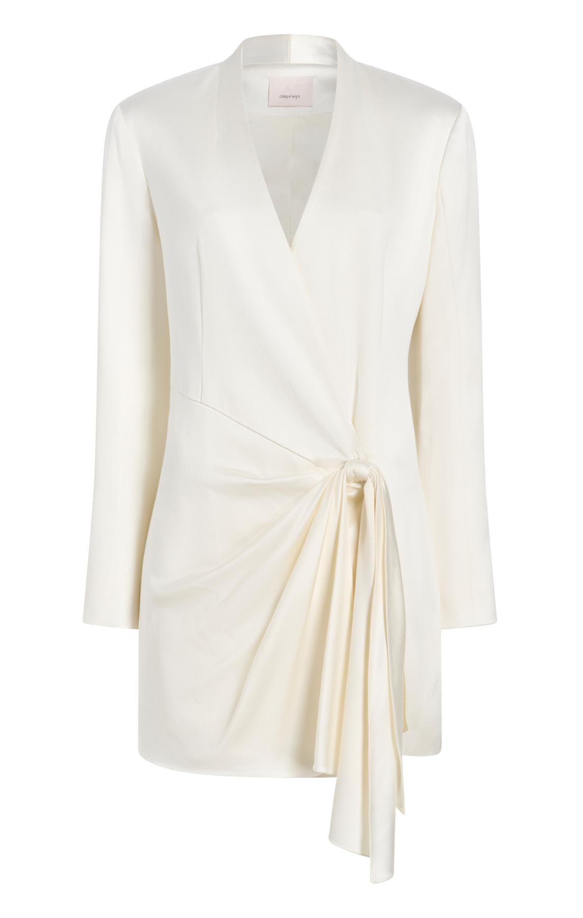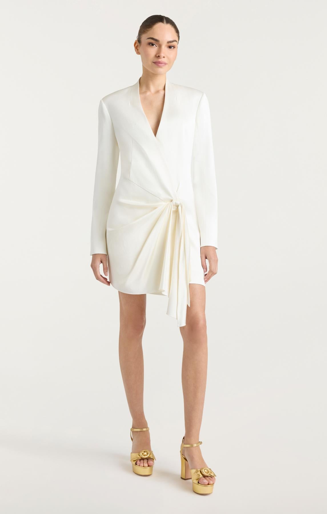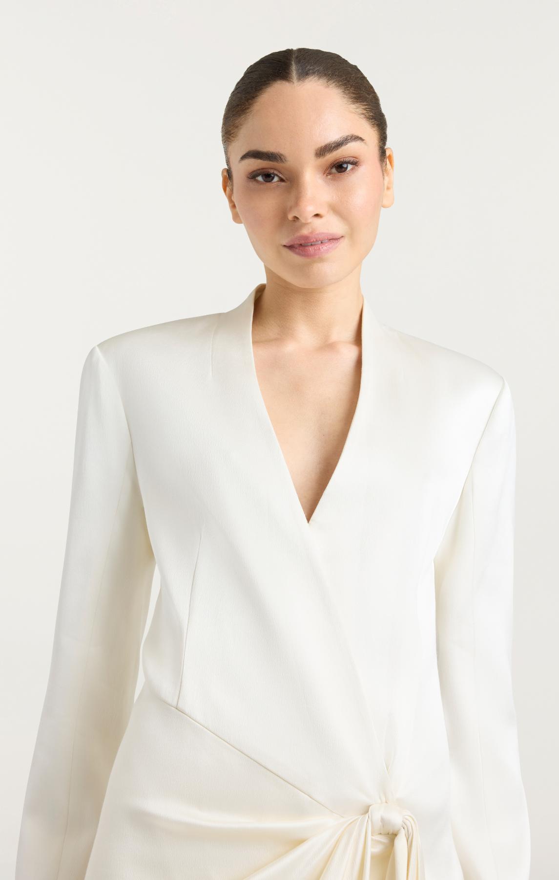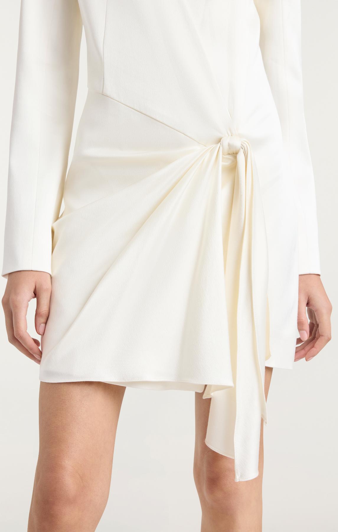 The Irma Dress offers a sleek, mini-length silhouette ideal for both dressy and professional occasions. With long sleeves featuring gentle slits and a front tie accent at the waist, this wrap dress presents a sleek and elegant style that blends classic charm with modern refinement.