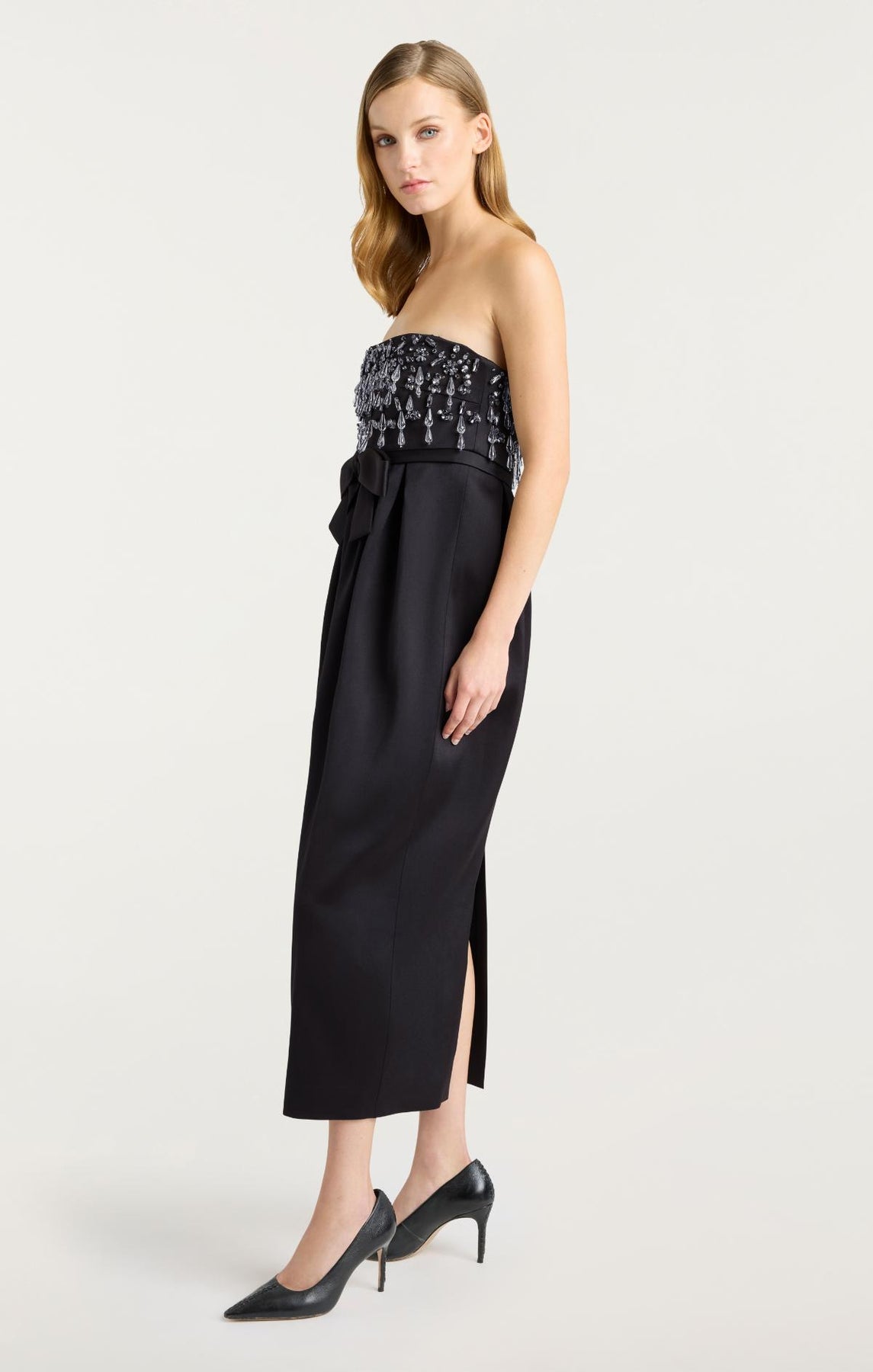 The Layered Gemstone Zelina Dress features a strapless midi silhouette adorned with cascading crystals across the bust. A charming bow at the front waist adds a refined touch, while the alluring back slit creates dynamic movement. Perfect for elevated evenings and unforgettable occasions