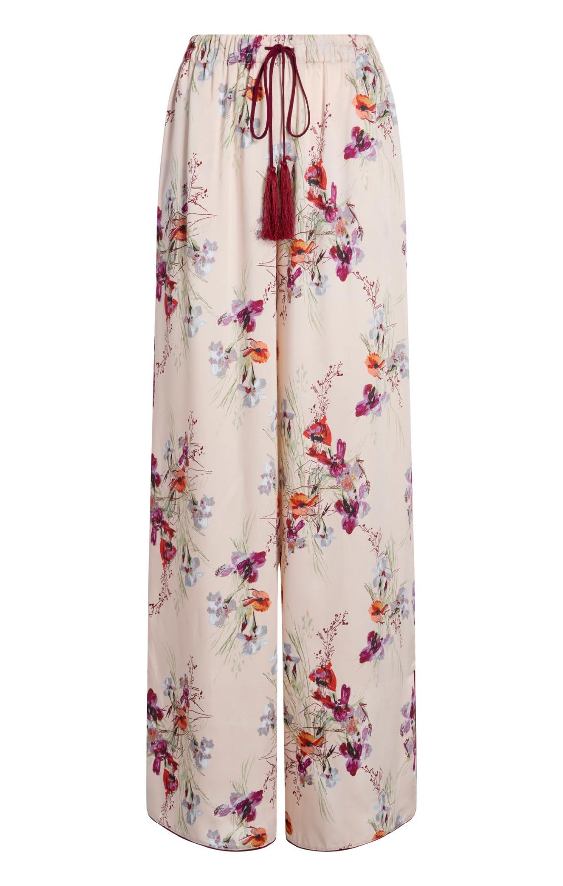 Elevate your spring wardrobe with the Iris Bouquet Alba Pant. This statement piece features a relaxed wide-leg cut that flows beautifully, paired with an elastic tie waist adorned with tassel details. The soft light floral print adds botanical charm while maintaining effortless sophistication.
