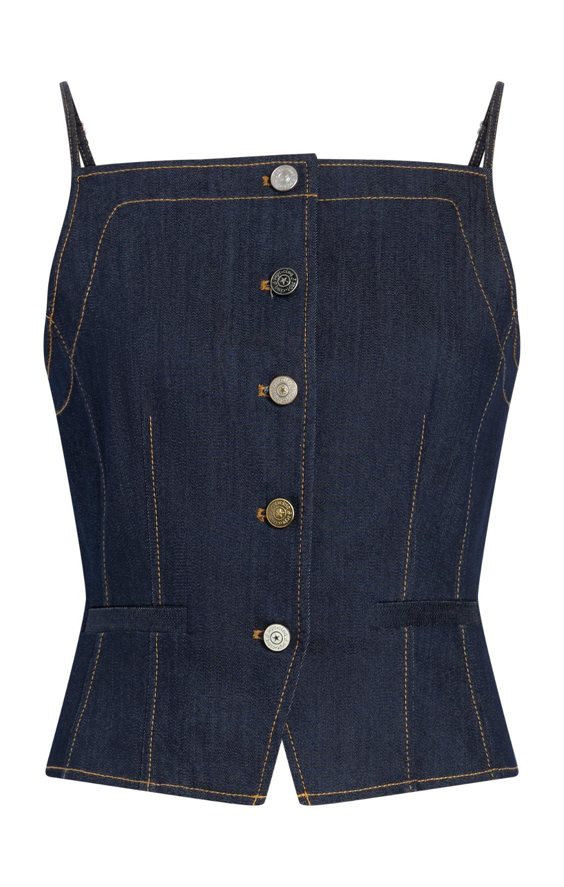 The Sloane Jean Top pairs dark wash denim with a refined button-front silhouette and functional straps. Faux pockets preserve a streamlined aesthetic while the breathable fabric keeps you cool through warmer months. An understated essential for any season.