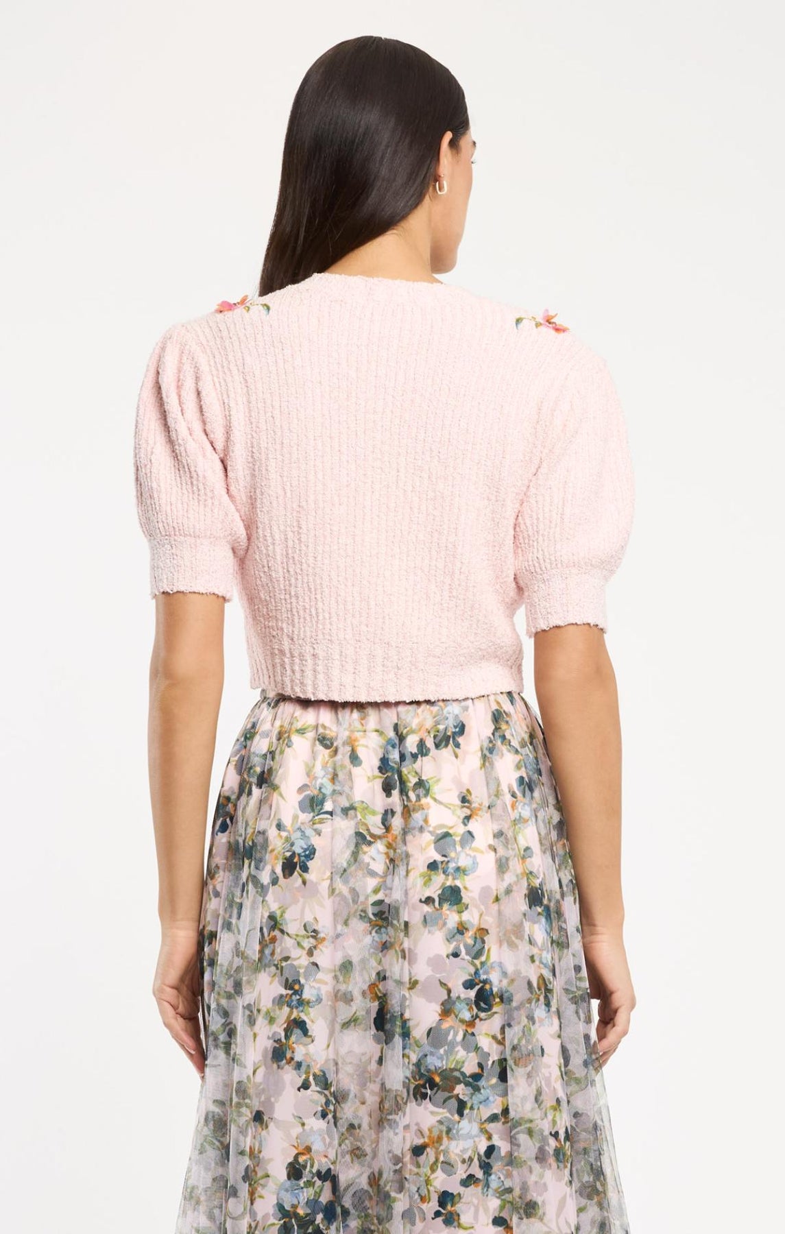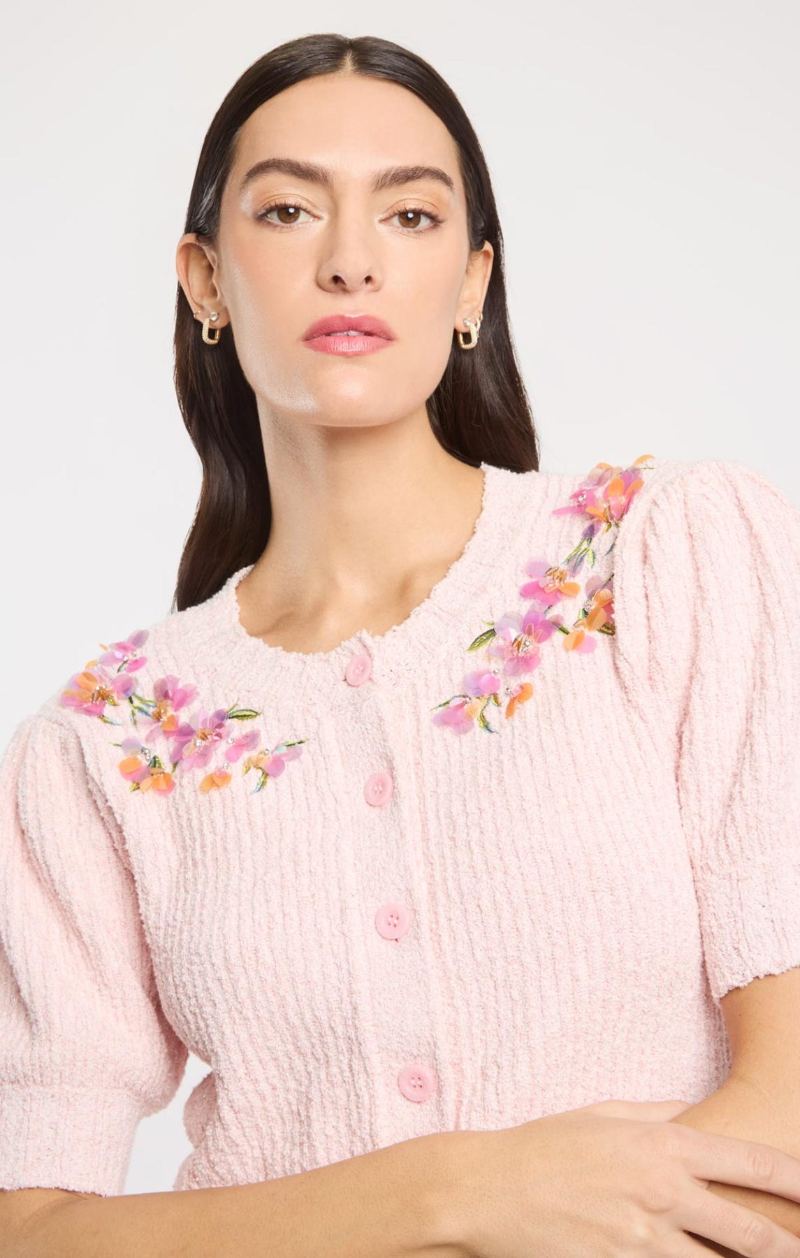 A refined knitted cardigan with a round neckline and button-up closure, showcasing sparkling floral paillette embellishments across the shoulders. The graceful bishop half puff sleeves add romantic dimension while the soft, comfortable fabric ensures all-day elegance and ease.