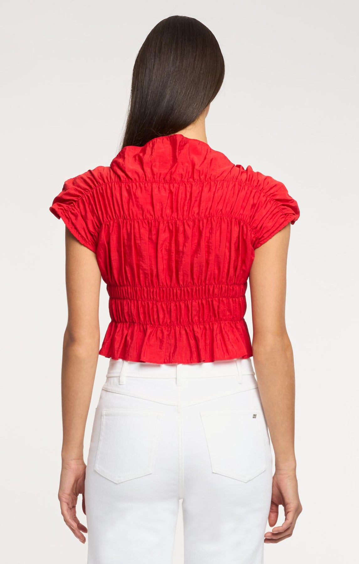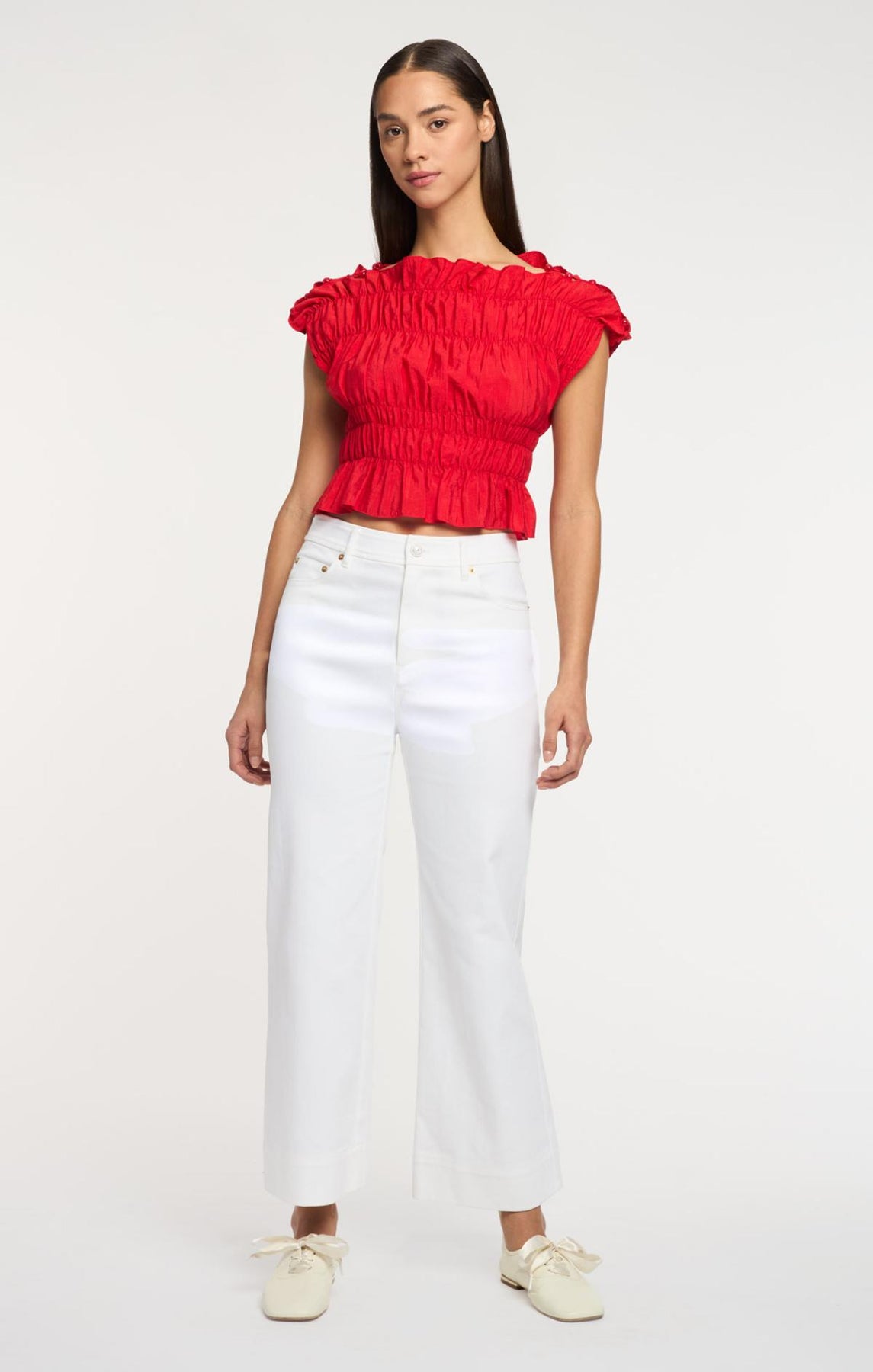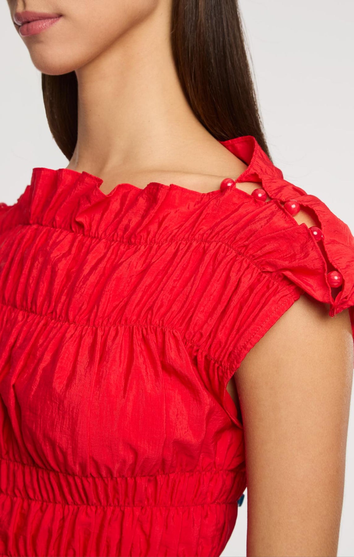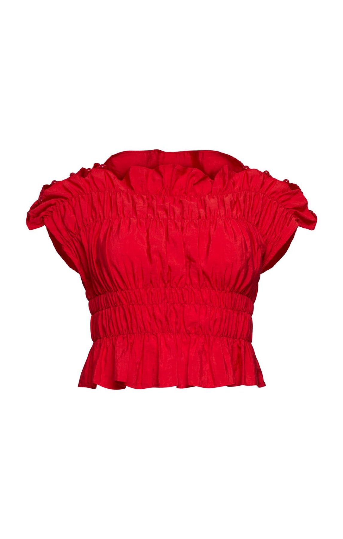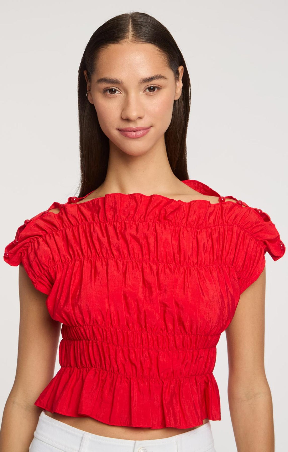 The Evalina Top combines ruched detailing with an airy silhouette. A straight neckline and graceful hem create an effortless look, while delicate shoulder beads add refined elegance.