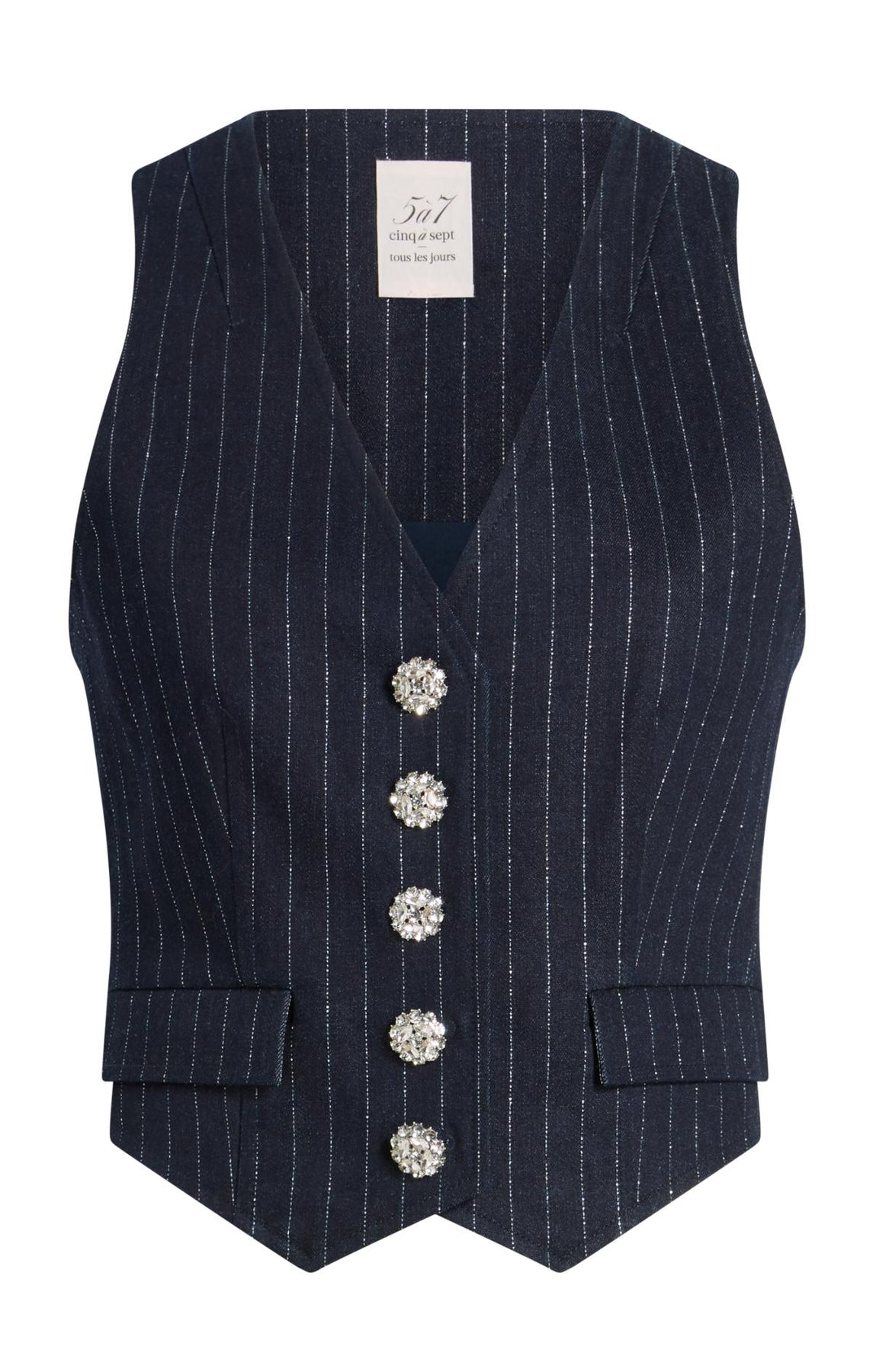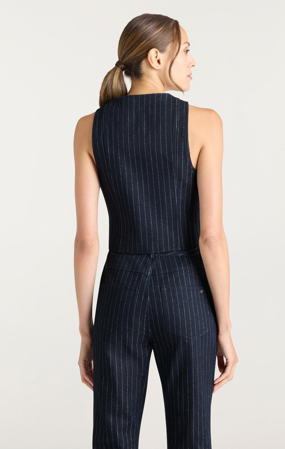 The Metallic Pinstripe Anderson Vest showcases a sleek silver pinstriped design accented by embellished buttons. This vest delivers a chic, modern look that effortlessly enhances any outfit with its sophisticated detailing and polished finish.