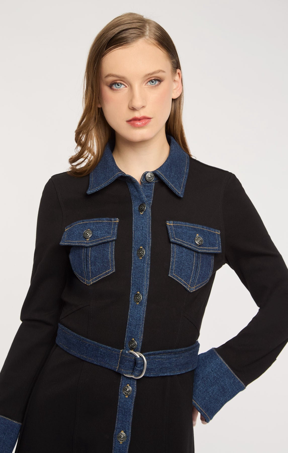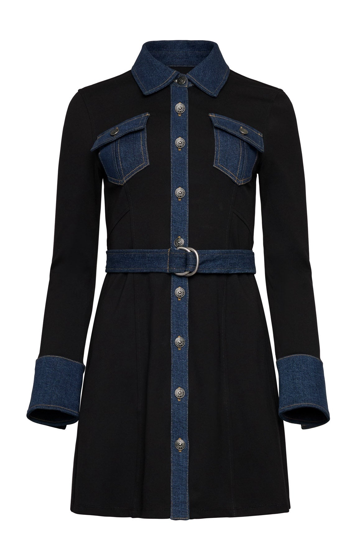 The Aliza Dress features refined denim detailing that elevates a sleek silhouette with understated edge. Clean lines meet thoughtful craftsmanship for a dress that feels both refined and effortlessly cool.