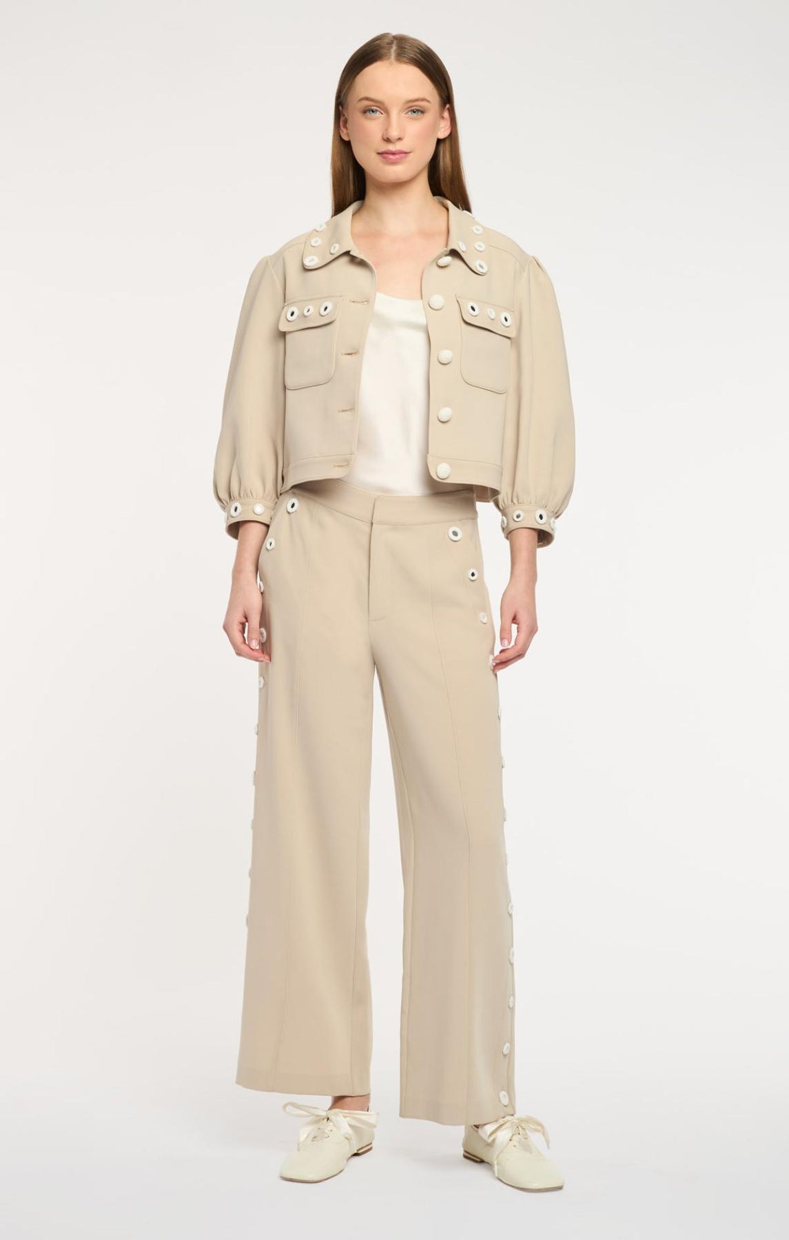 The Crochet Mirrors Gilliana Jacket elevates everyday style with round crochet mirrors adorning the collar and cuffs. Distinctive crochet buttons, delicate bishop sleeves, and practical front flap pockets create an effortlessly sophisticated silhouette perfect for layering.