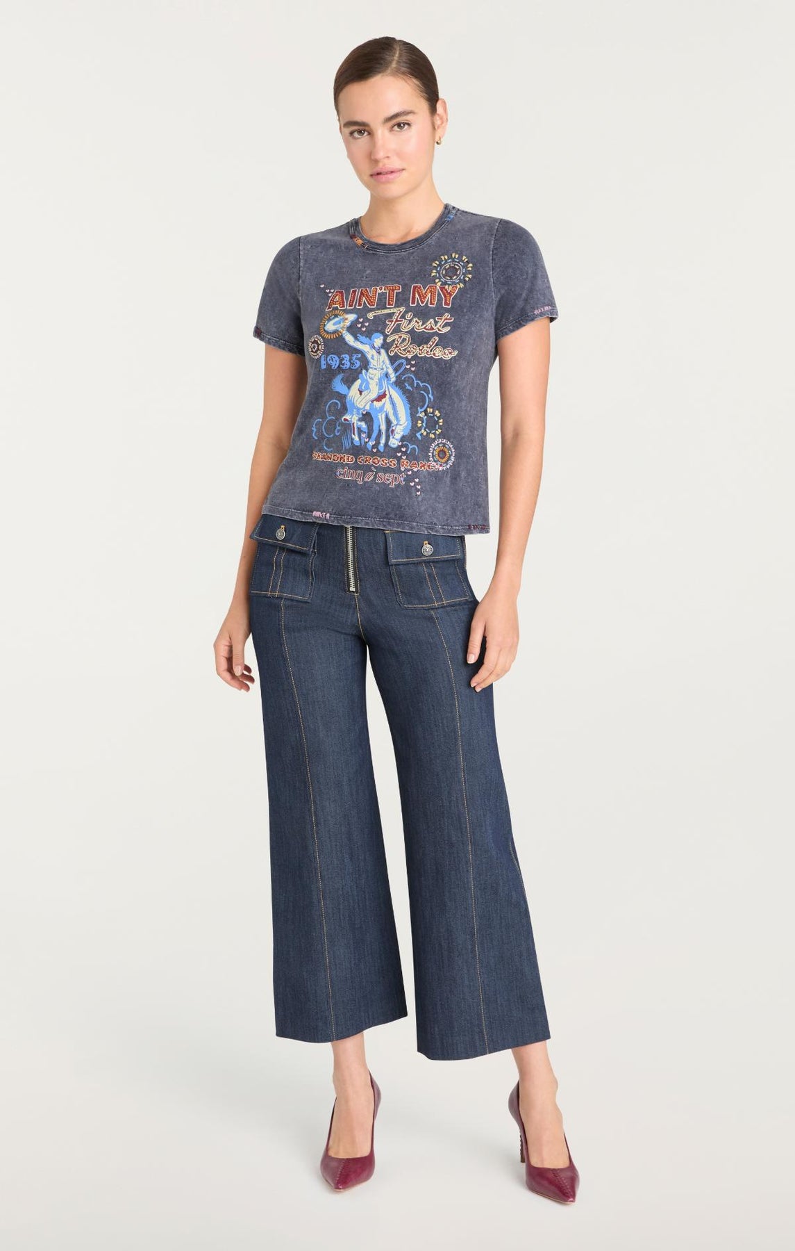 Introducing the Bespoke Aint My First Rodeo Shrunken Tee, the perfect stylish tee for everyday wear. You'll love the vibrant print and stitch details on the front, combined with a comfy crew neckline. A must-have addition to any wardrobe.