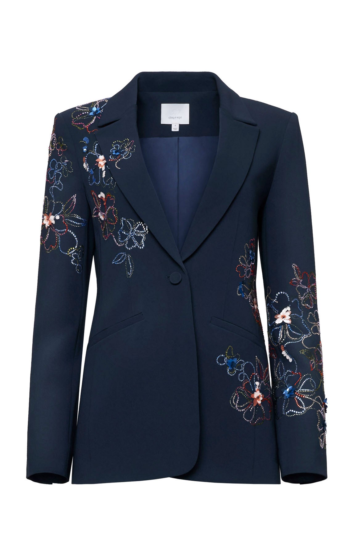 The Blooming Linework Karlie Blazer transforms a classic silhouette with strategic sparkle. Featuring a collared neckline and notched lapels, this long-sleeve essential gets an elegant upgrade with rhinestone and paillette floral accents adorning the shoulder and cuff.