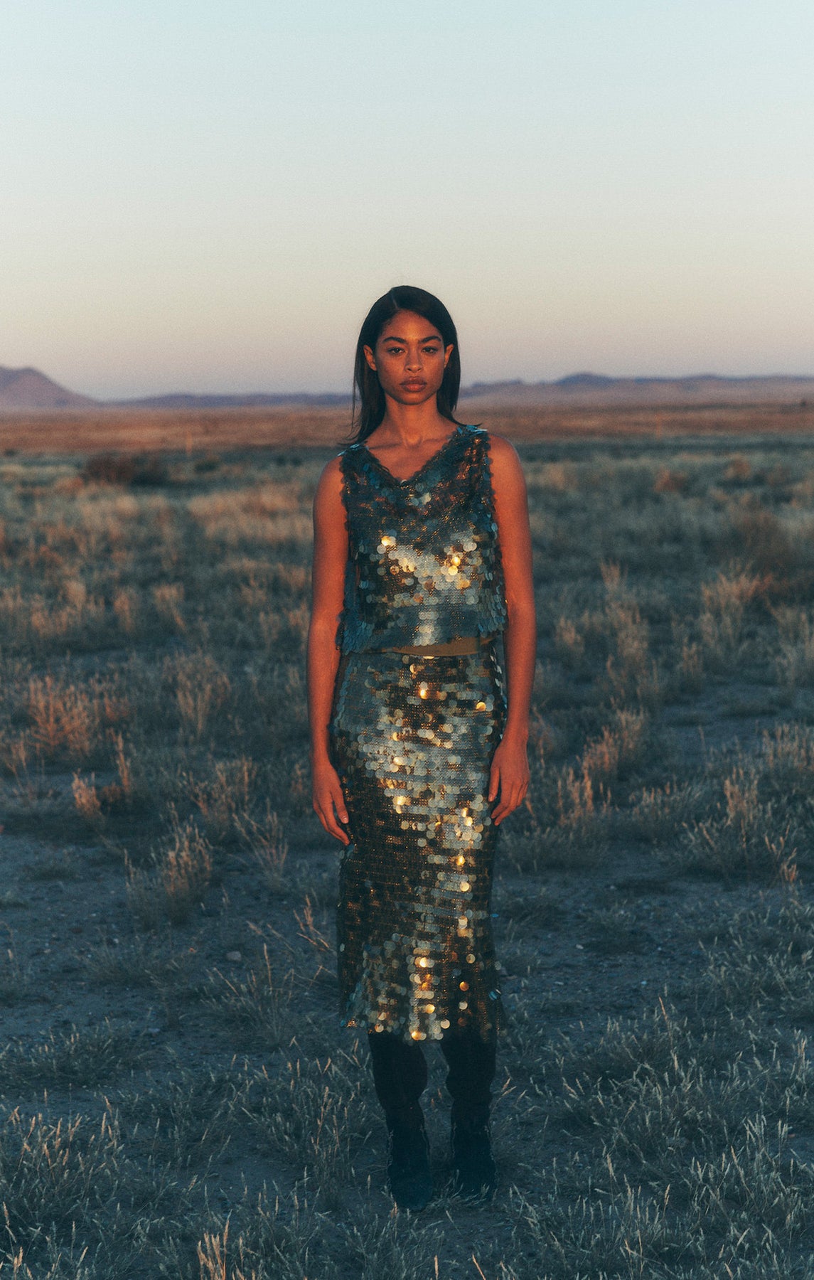 The Calista Top delivers festive glamour with shimmering paillettes layered over a coordinating tank. A graceful cowl neckline and tie-back detail create an alluring silhouette perfect for celebrations and special occasions.