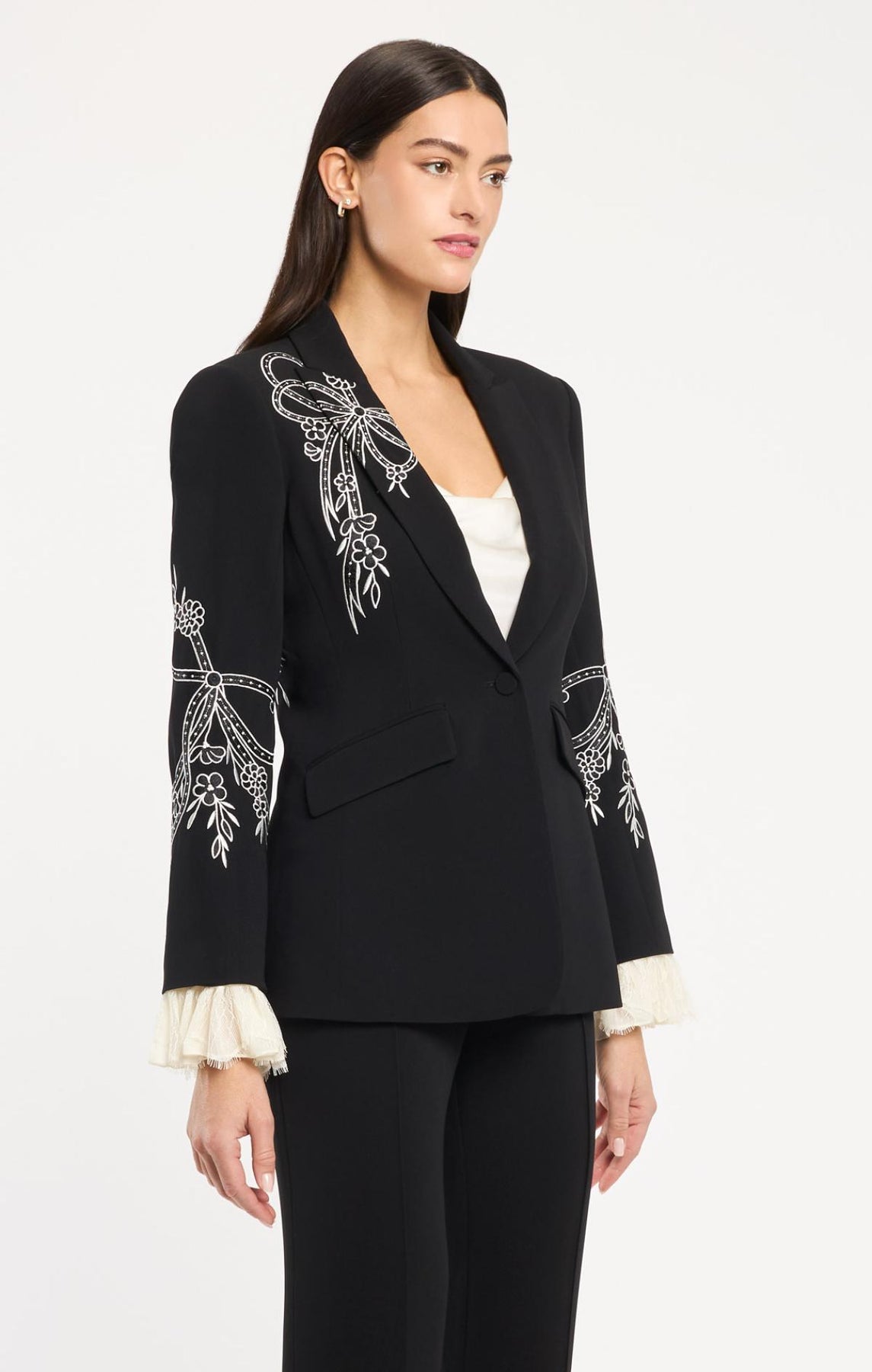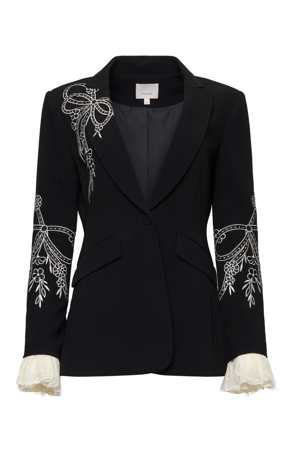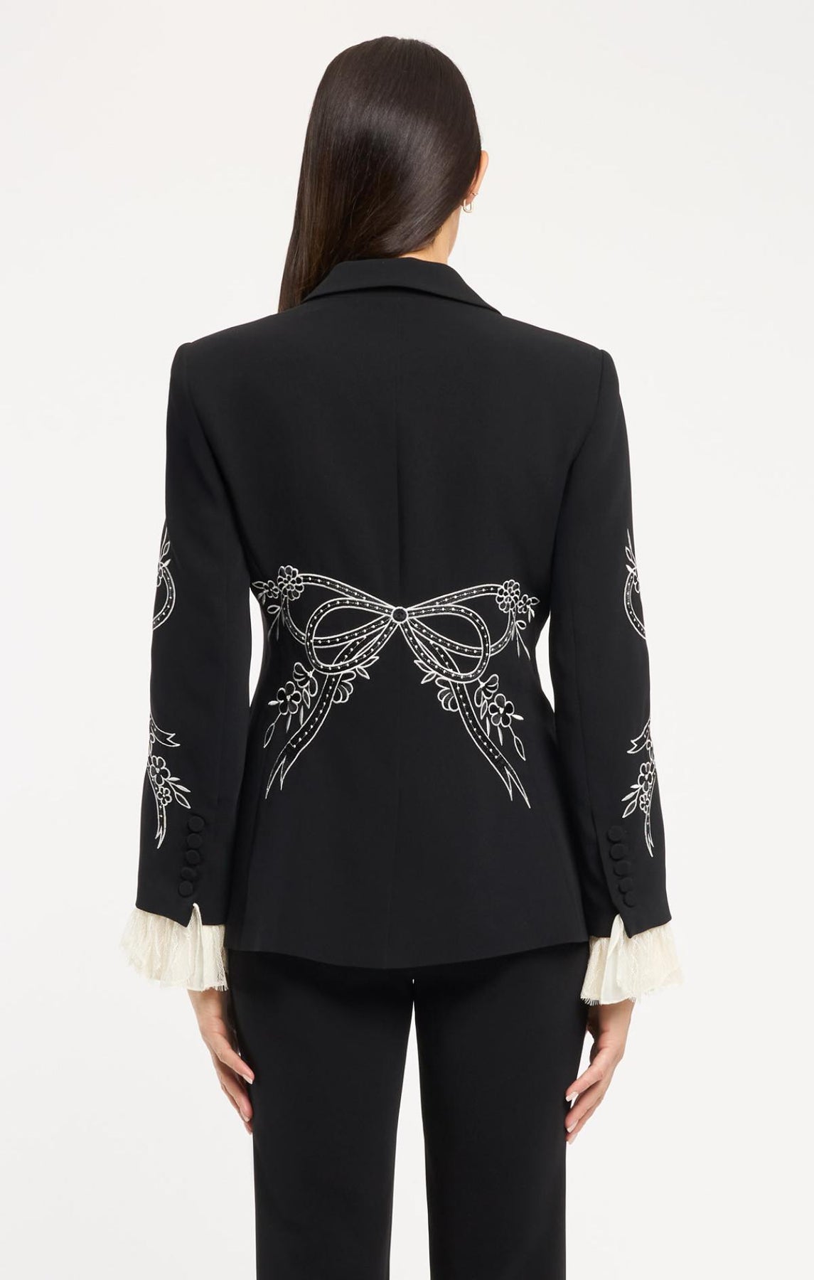 Crafted with precision, this blazer showcases elegant notch lapels and ornate lace trim cuffs. Striking color-contrasting embroidered bows provide an unexpected design element that elevates the classic silhouette.