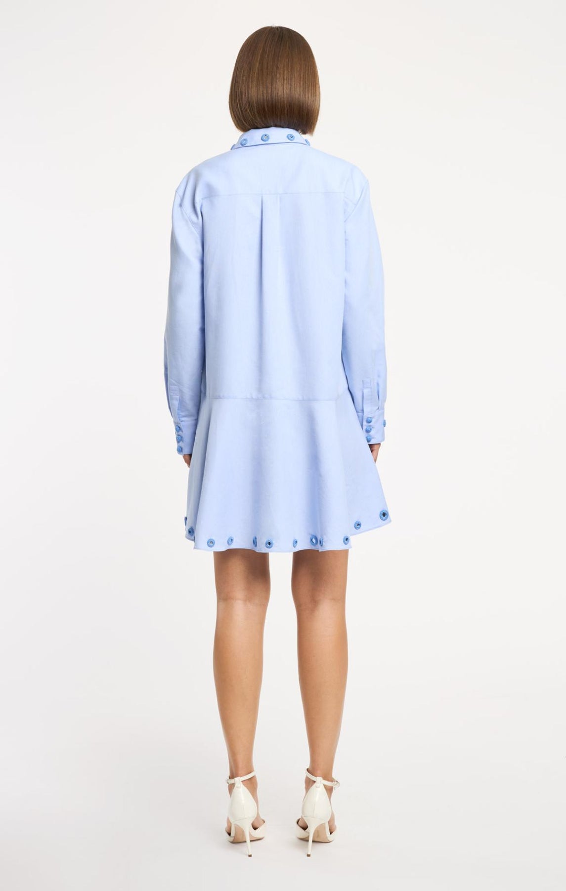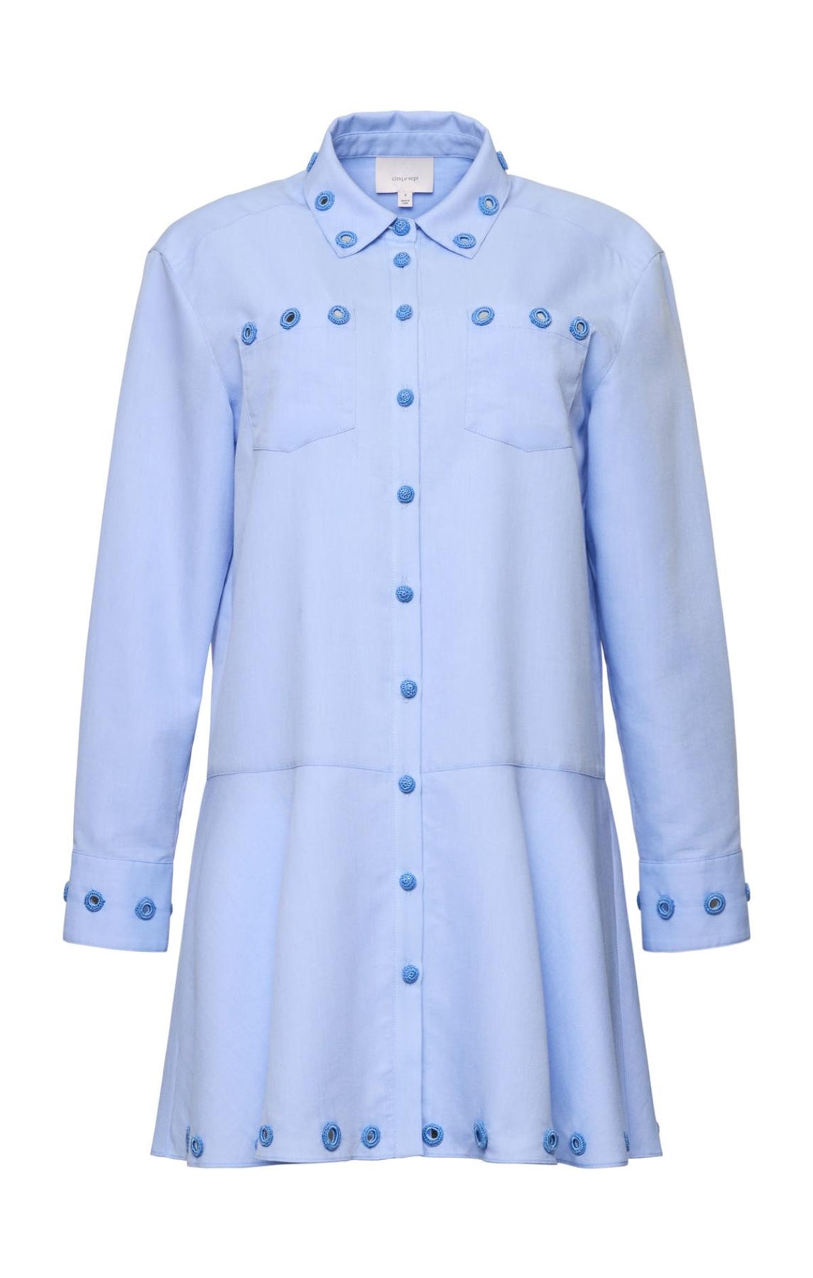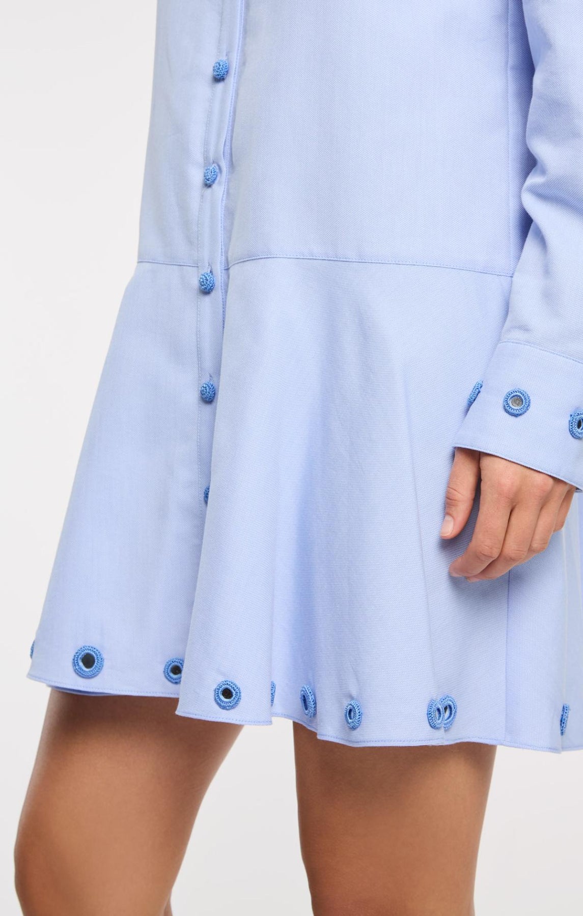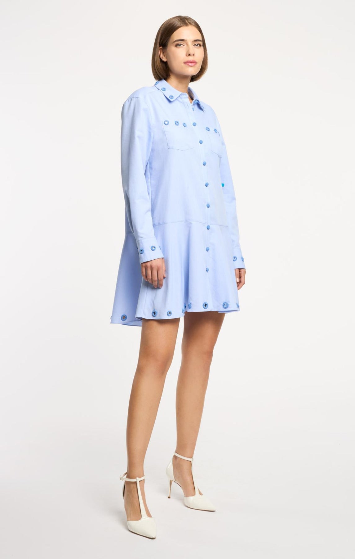 The versatile Crochet Mirrors Giulia Dress has sleeves featuring delicate crochet mirrors on the collar, cuffs, and hem. Crocheted buttons and front pockets add character and function, making it equally suited for casual outings or polished professional settings.