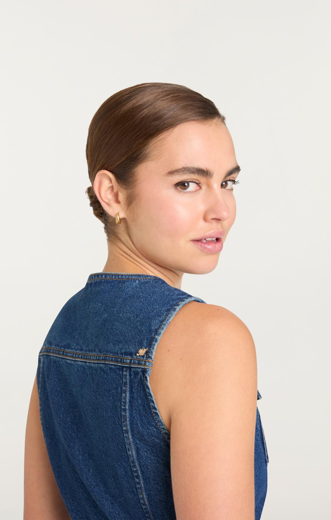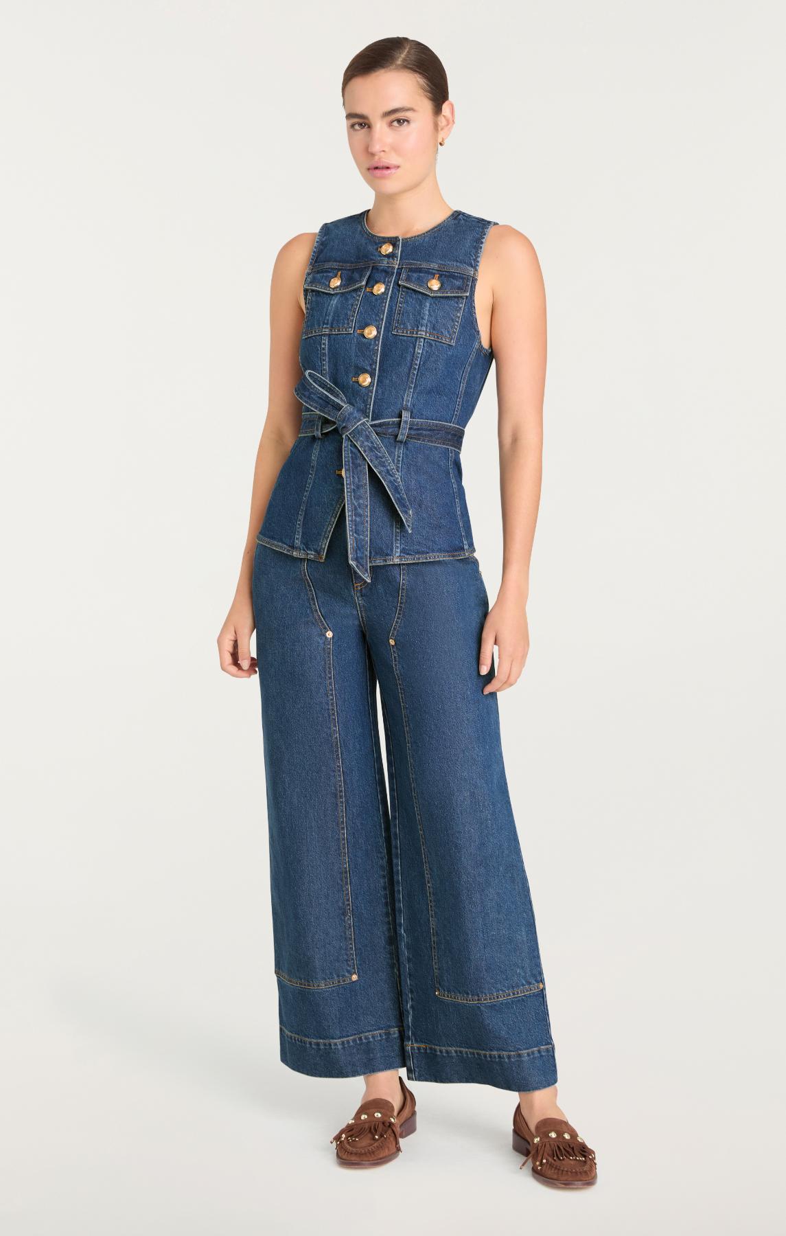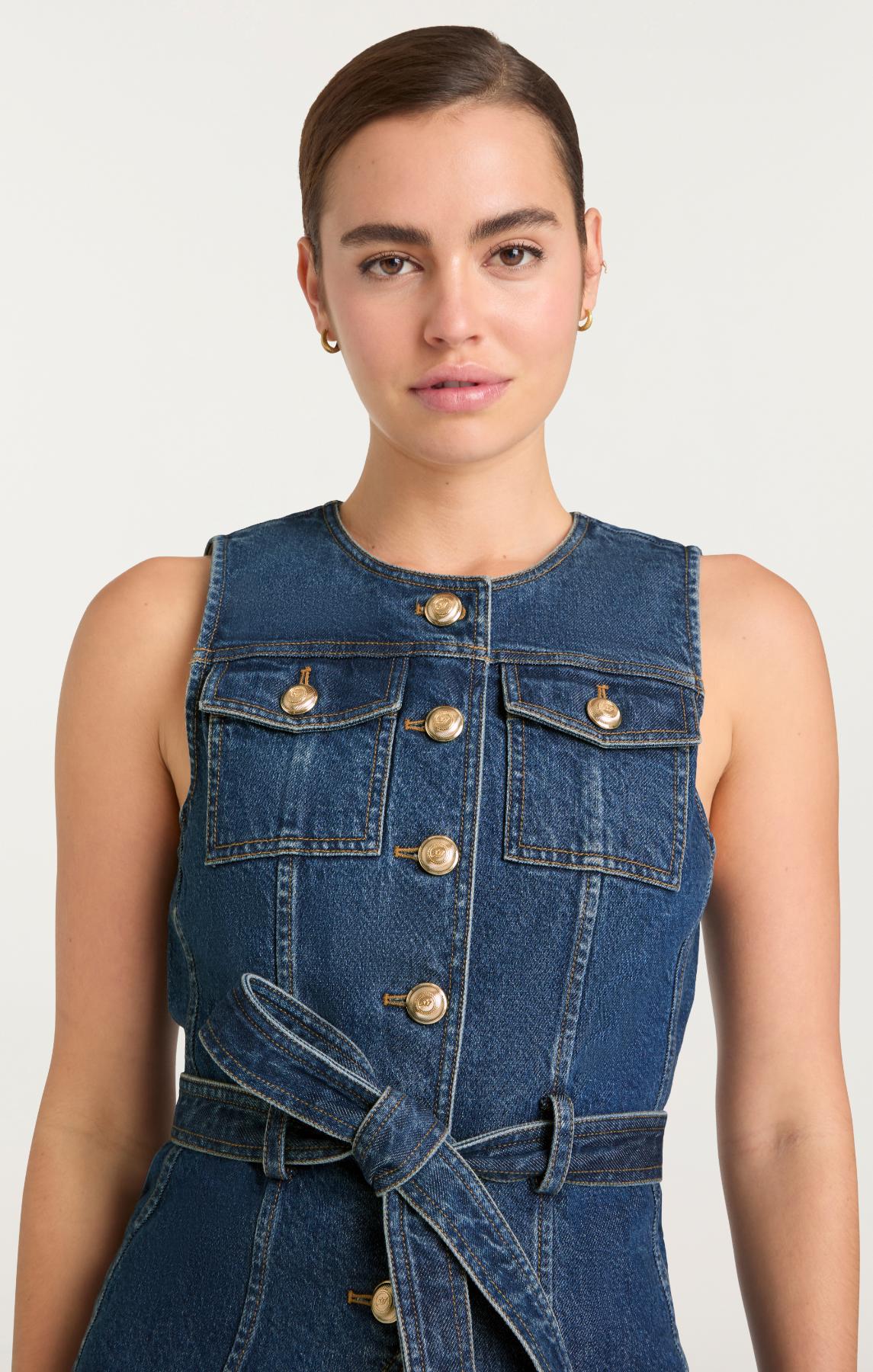 The Reenee Jean Vest brings understated sophistication to layering. This denim piece features a flattering tie belt for a customized silhouette, button-front closure, and practical front pockets. Throw it on over anything or wear it on its own, it's the versatile piece that elevates every outfit.