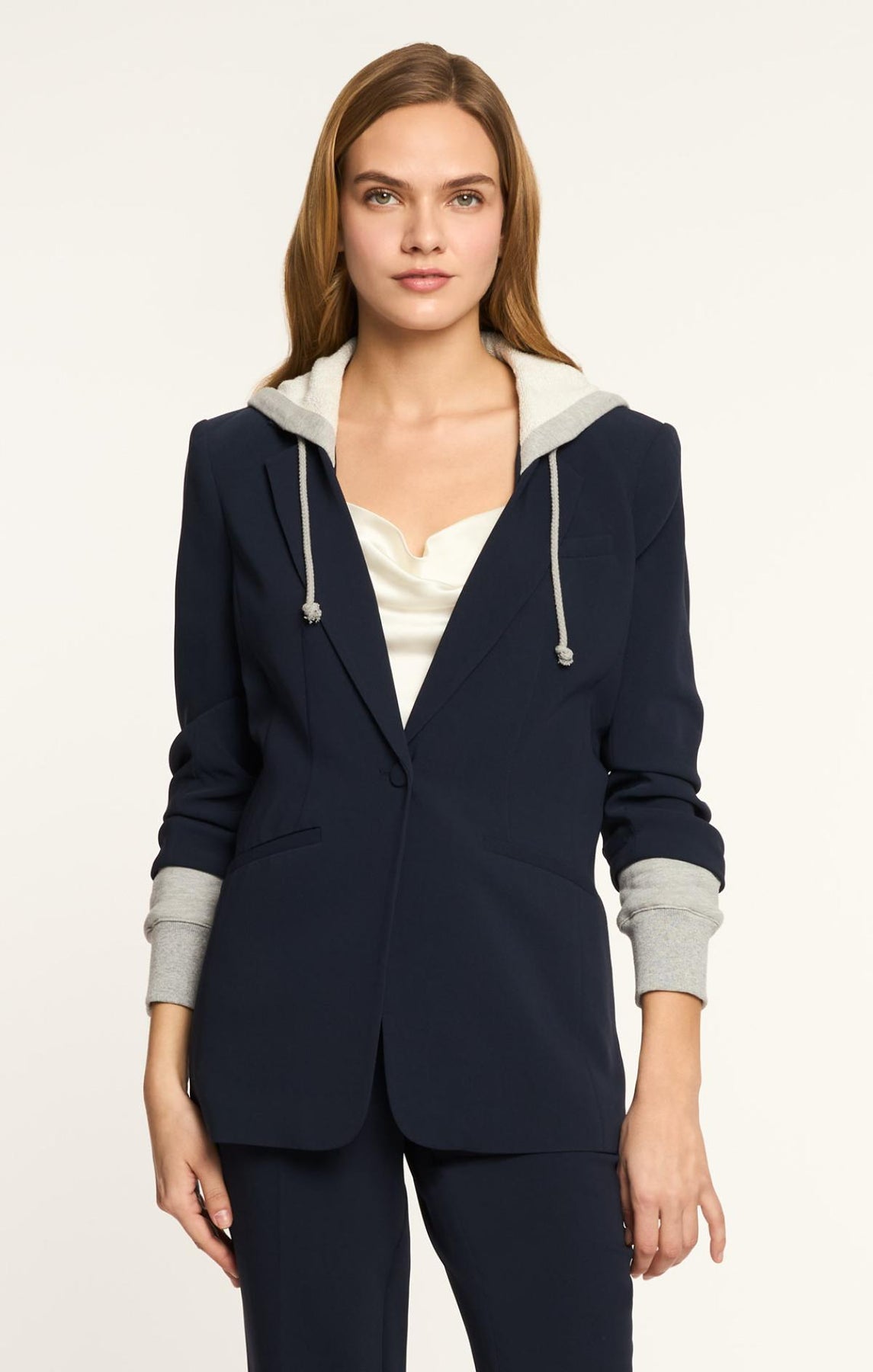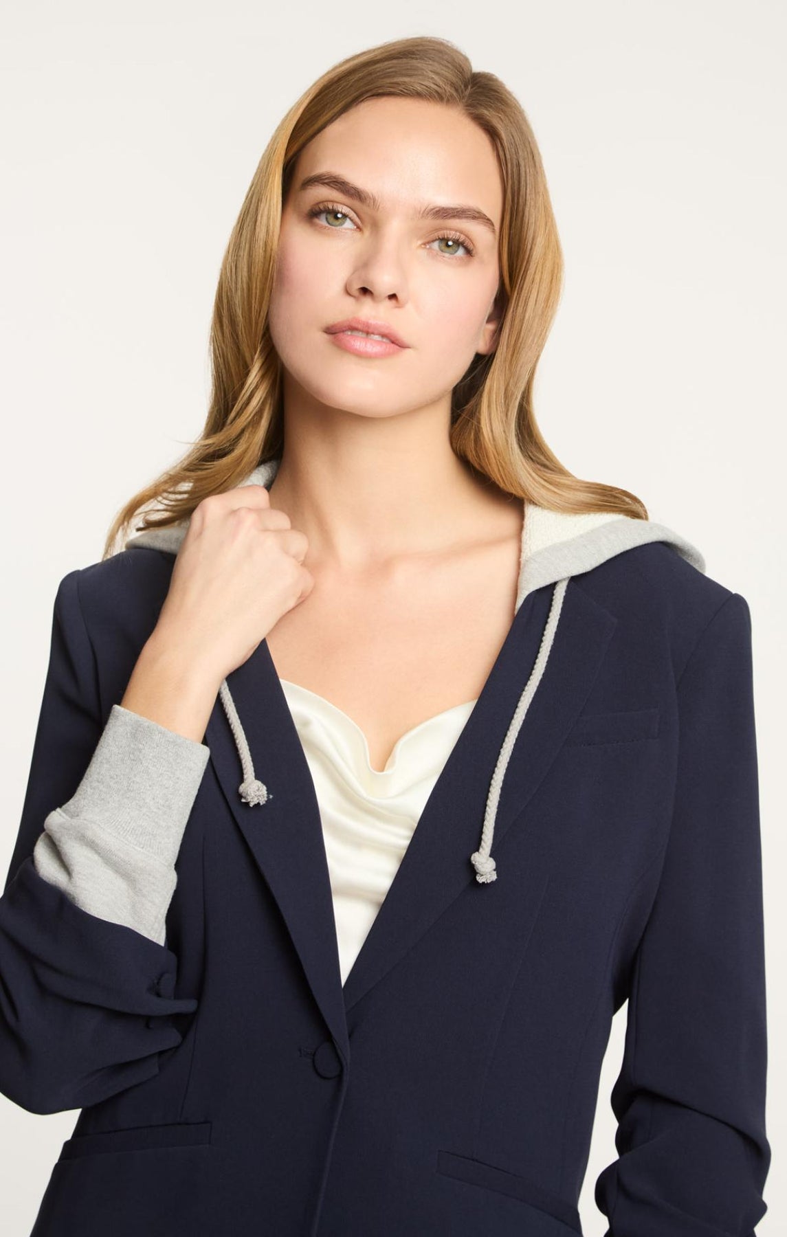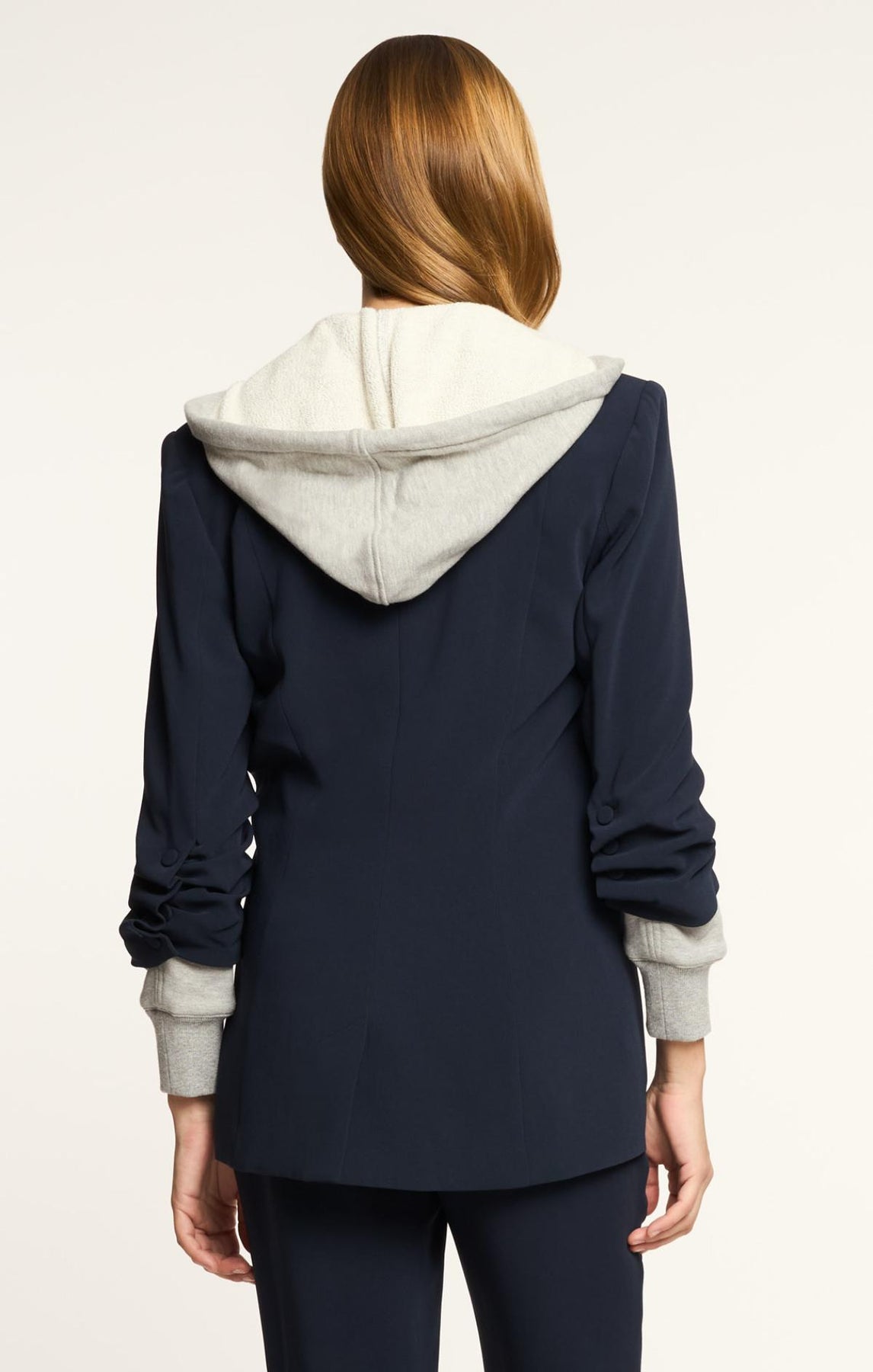 Be ready for any occasion in the Hooded Khloe Blazer. Crafted with Drapey Crepe, a french terry underlay, and a drawstring hood, it's designed to flatter your silhouette. The hood and stylized sleeves add a touch of unique style.