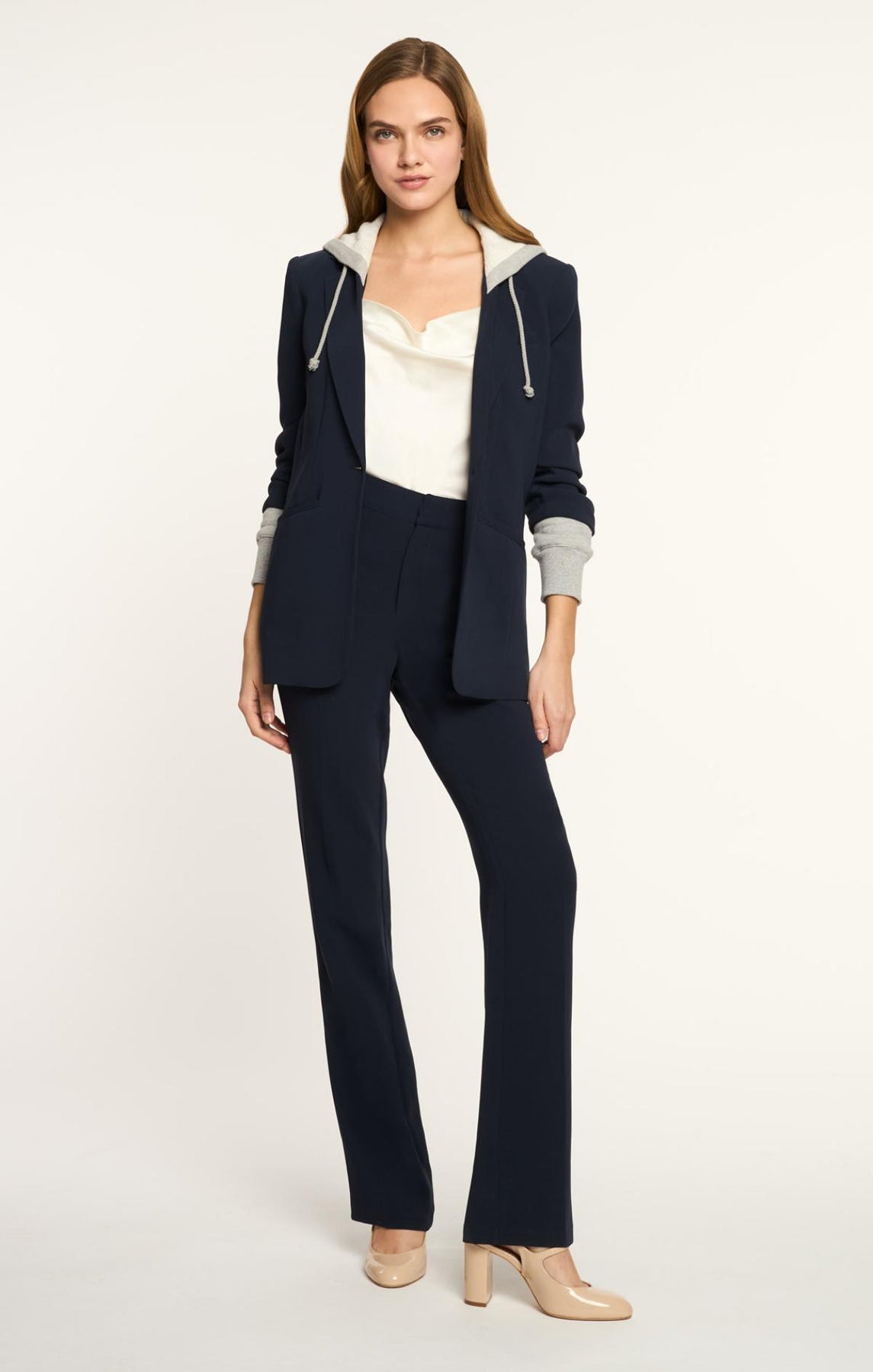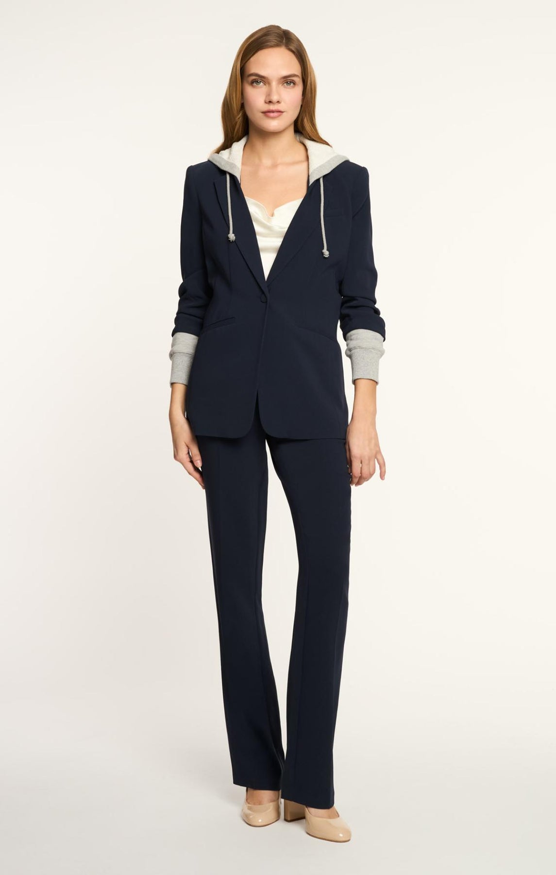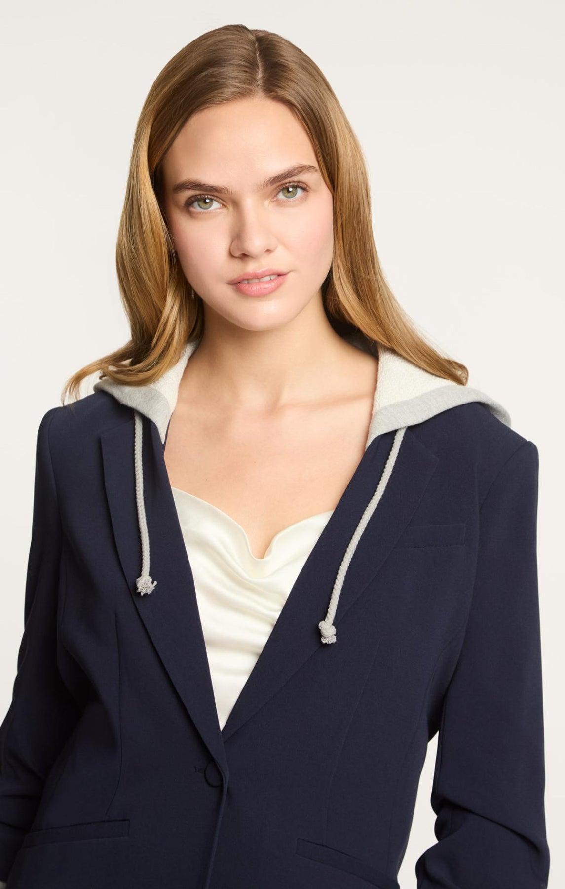Be ready for any occasion in the Hooded Khloe Blazer. Crafted with Drapey Crepe, a french terry underlay, and a drawstring hood, it's designed to flatter your silhouette. The hood and stylized sleeves add a touch of unique style.